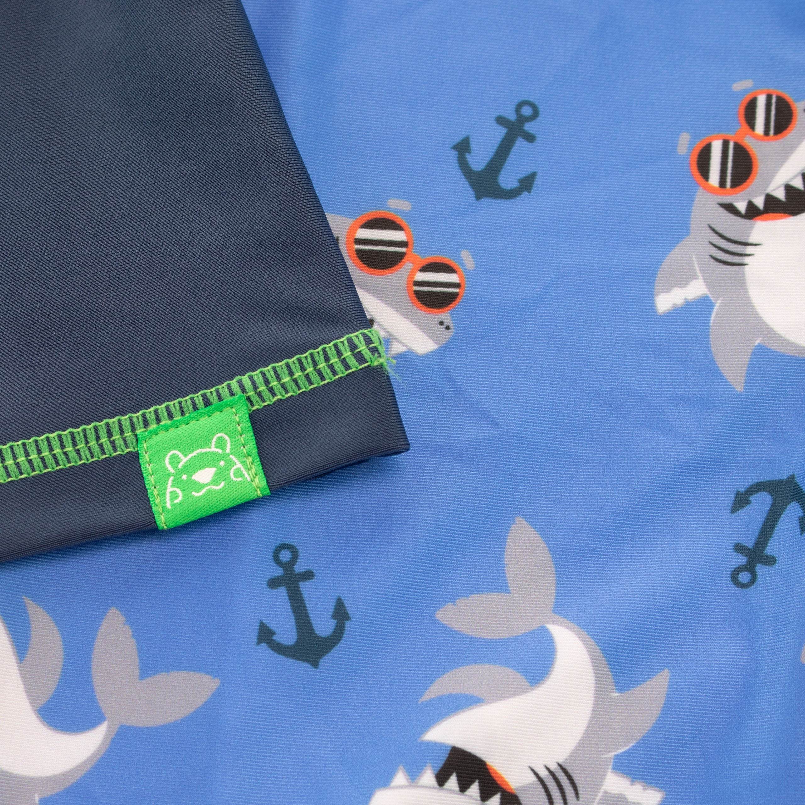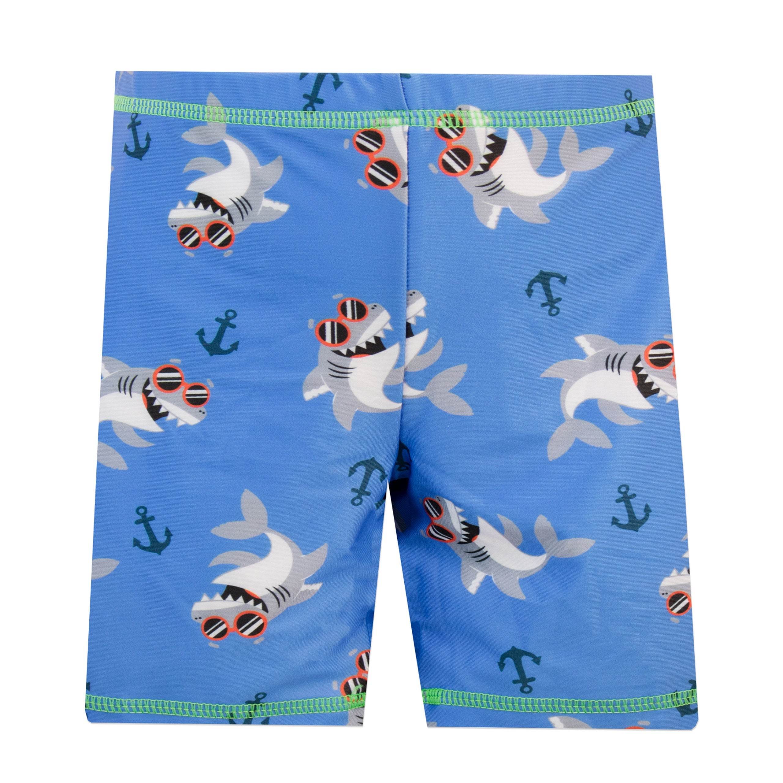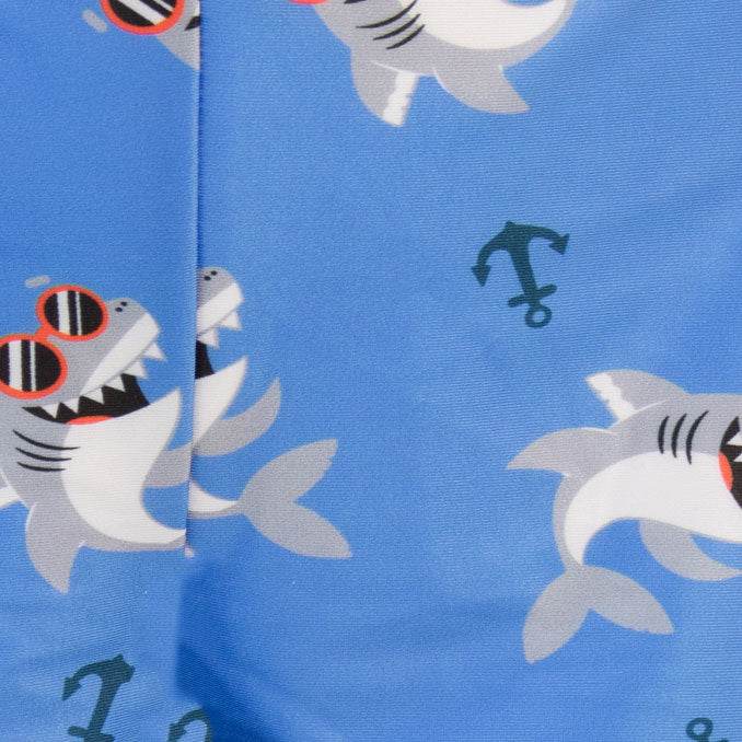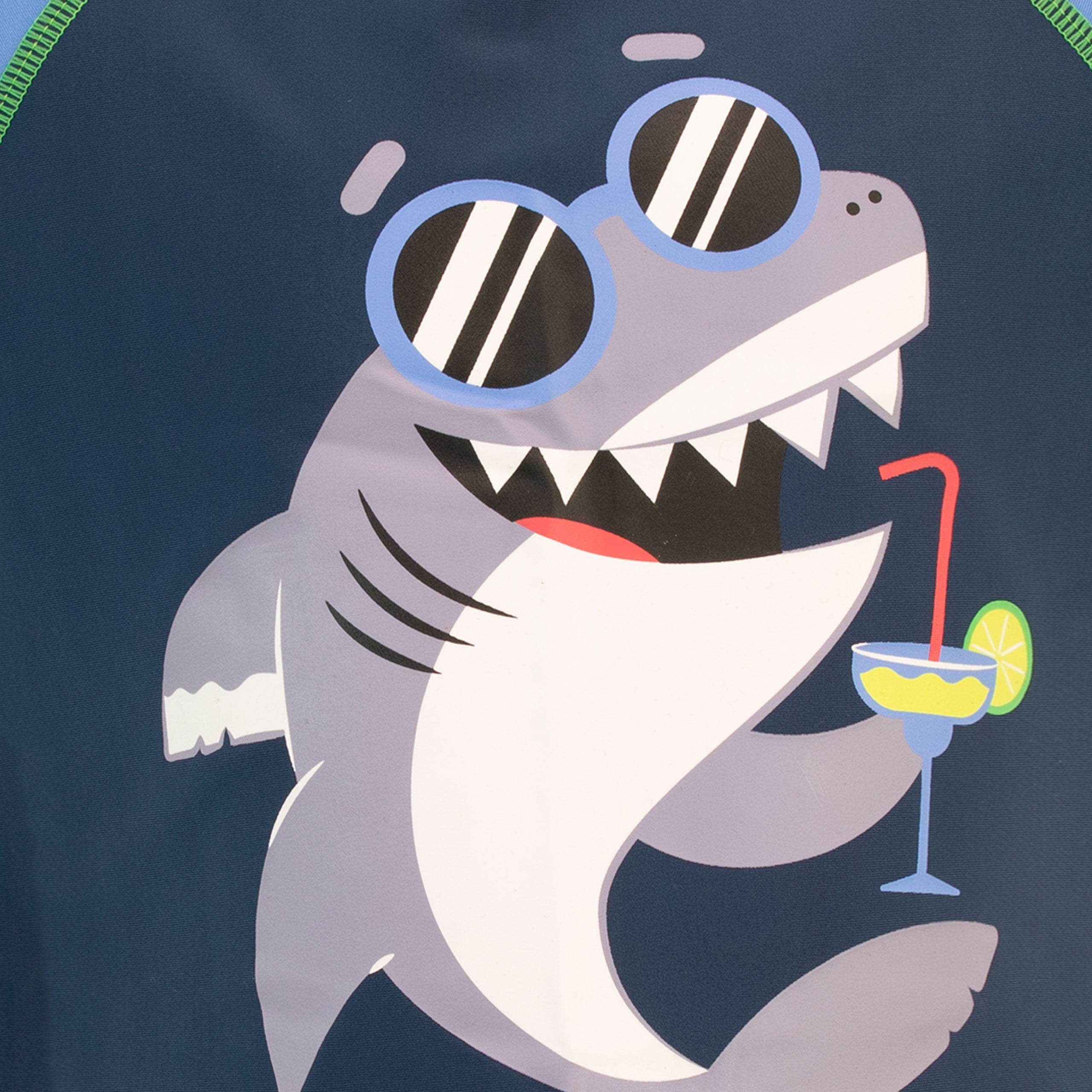 Sink your teeth into this fin-tastic two-piece swim set! Designed by Harry Bear this jaw dropping swimming costume features a cool shark with sunglasses drinking with the slogan 'Beach Party'. Paired with matching blue shirts that have an all over shark and anchor print. Perfect for seaside adventures!