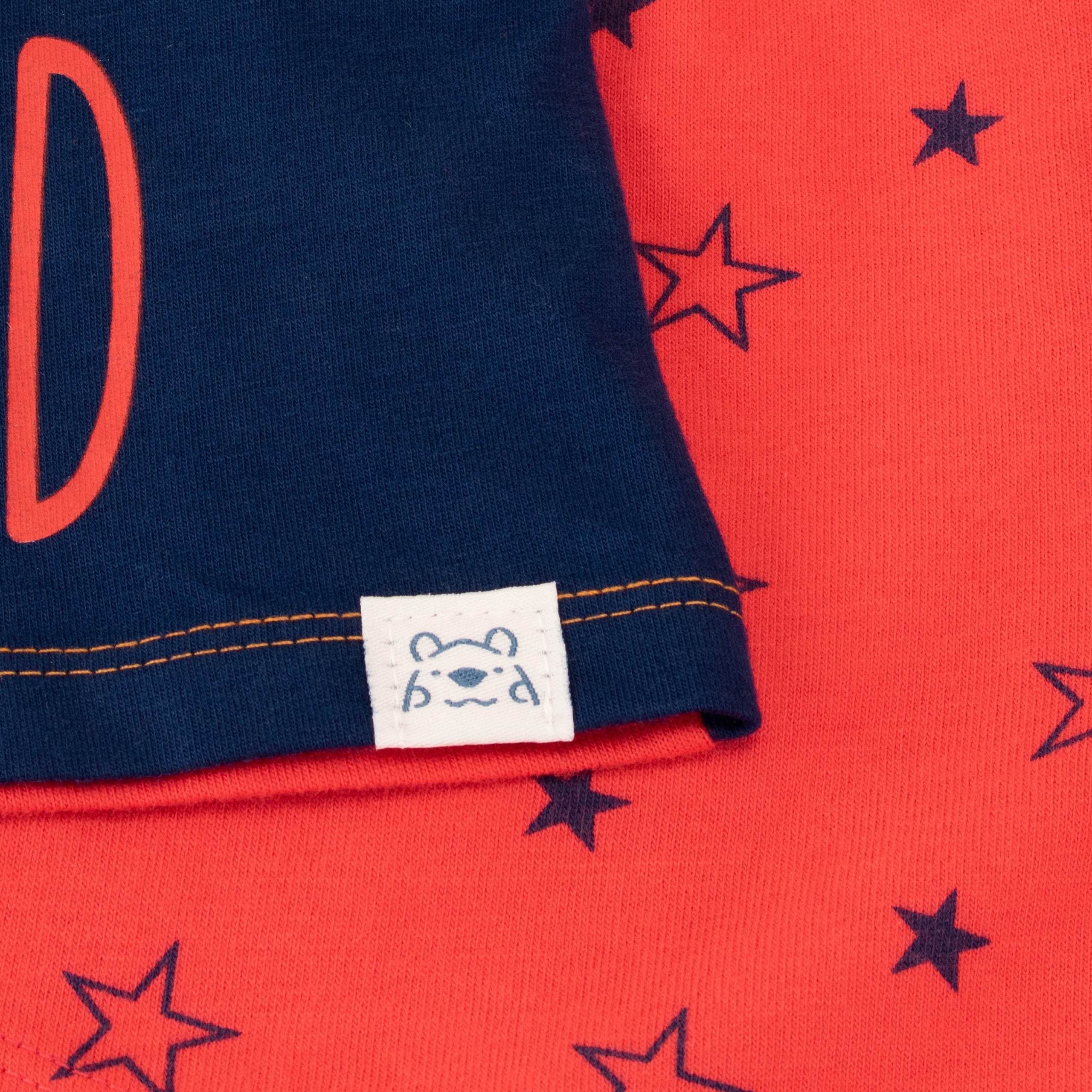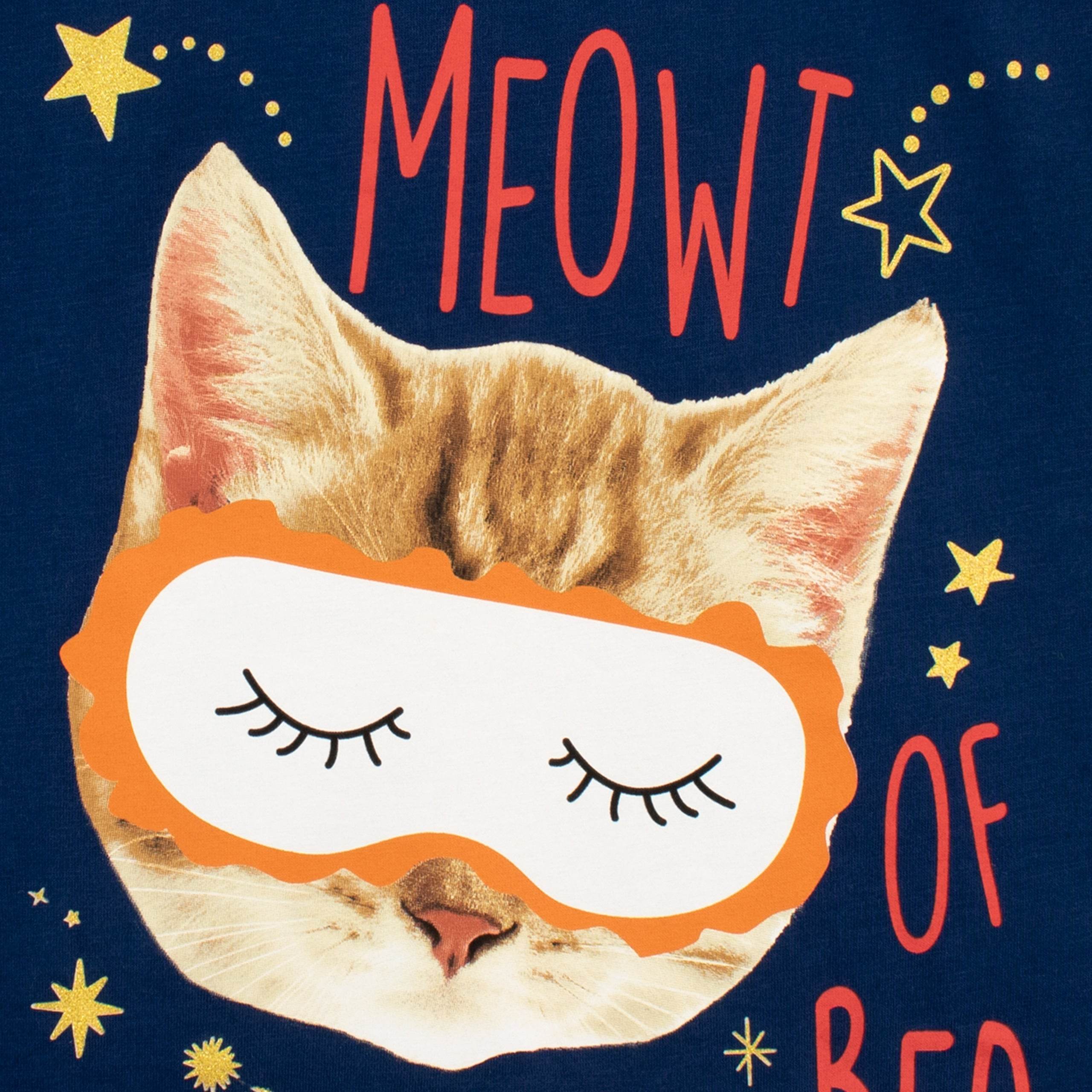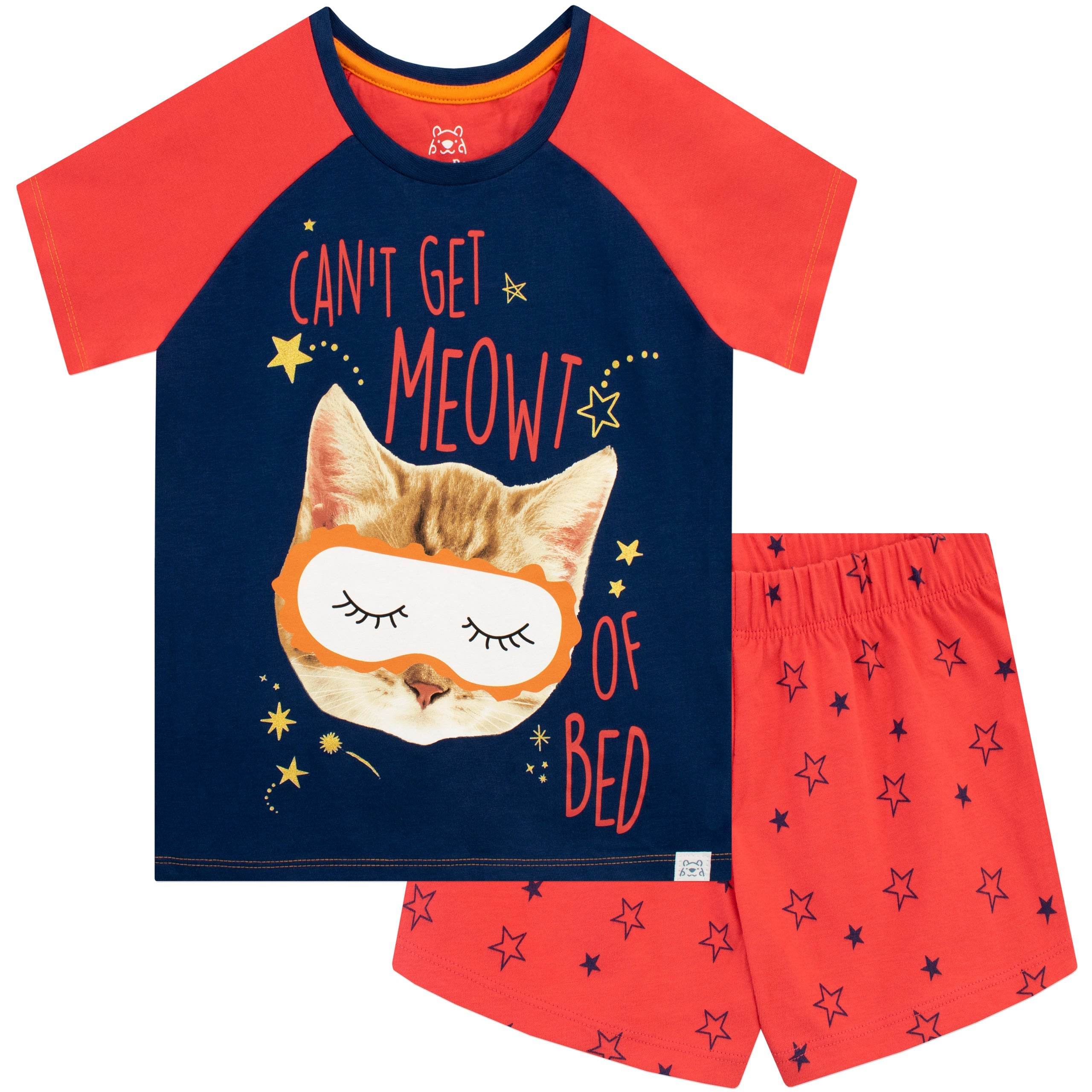 Get your feline fashionista ready for a cute cat nap in these purr-fect kitty pyjamas! The navy blue pyjama top has contrasting pink short sleeves and showcases a snoozing cat wearing an sleep mask with the slogan 'Can't Get Meowt Of Bed' surrounded by glittery gold stars! Complete with pink pj shorts with an all-over print of navy stars. Your sleepy kitten will be the cat's pyjamas in these paws-itively adorable jammies!