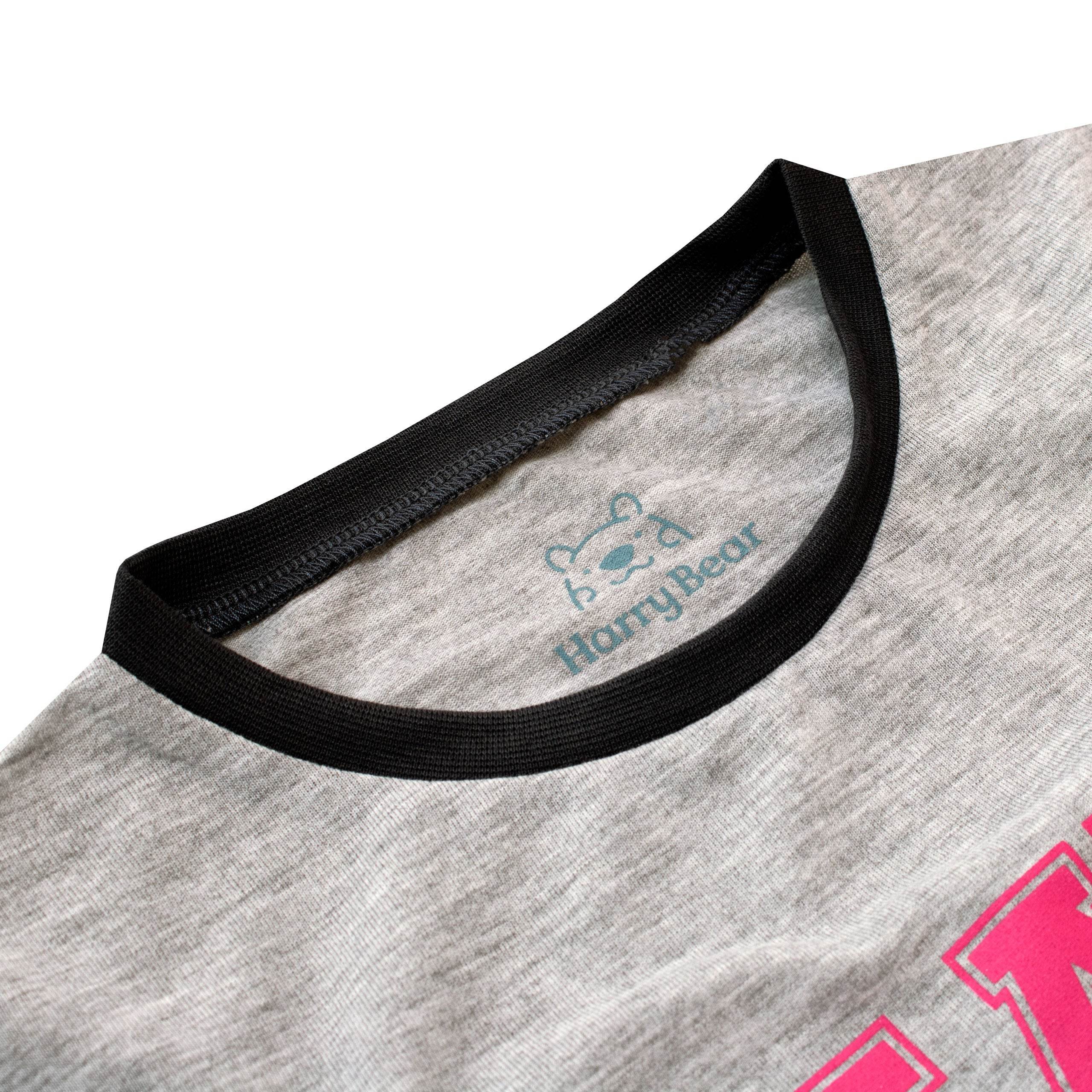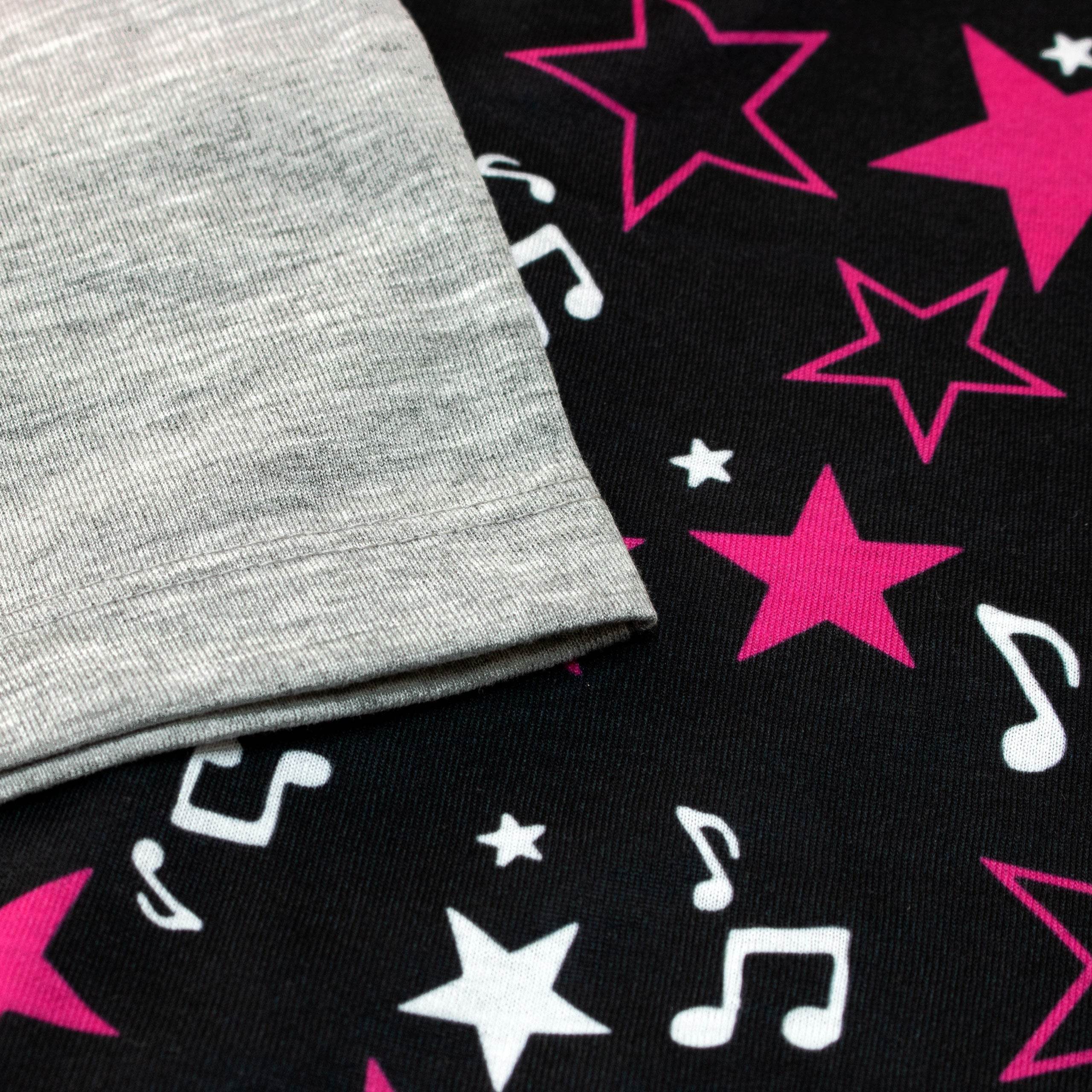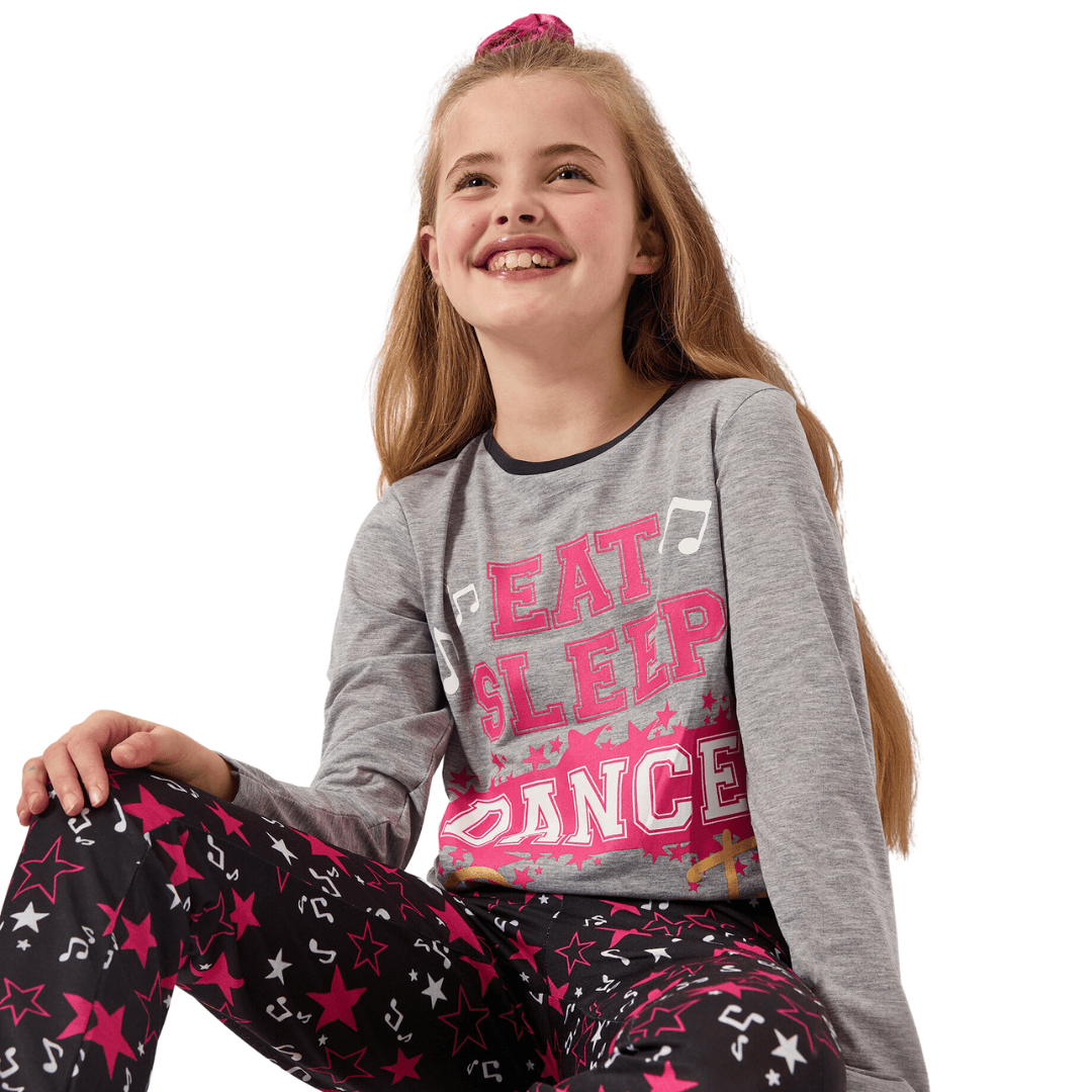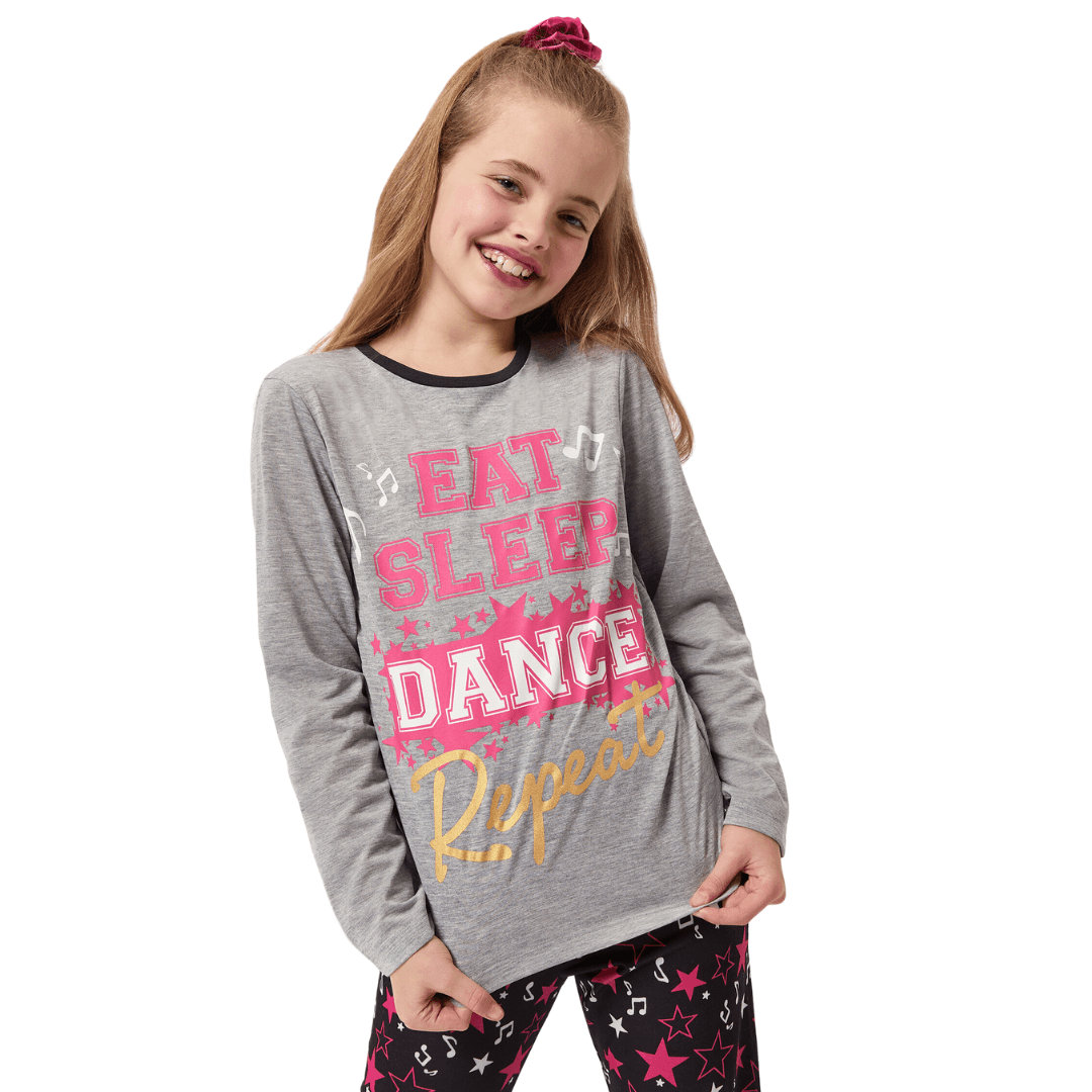 Whether she'd rather pirouette, do the moonwalk, the floss, or the two-step, she'll love doing it in this awesome pyjama set! Designed by Harry Bear, these awesome pyjamas feature a gorgeous grey marl long sleeve top with 'Eat, Sleep, Dance, Repeat' printed in fun fonts and gold glitter. Paired with long black bottoms with a cool music note and star motif, these jammies will surely have your dancing diva feeling the beat!