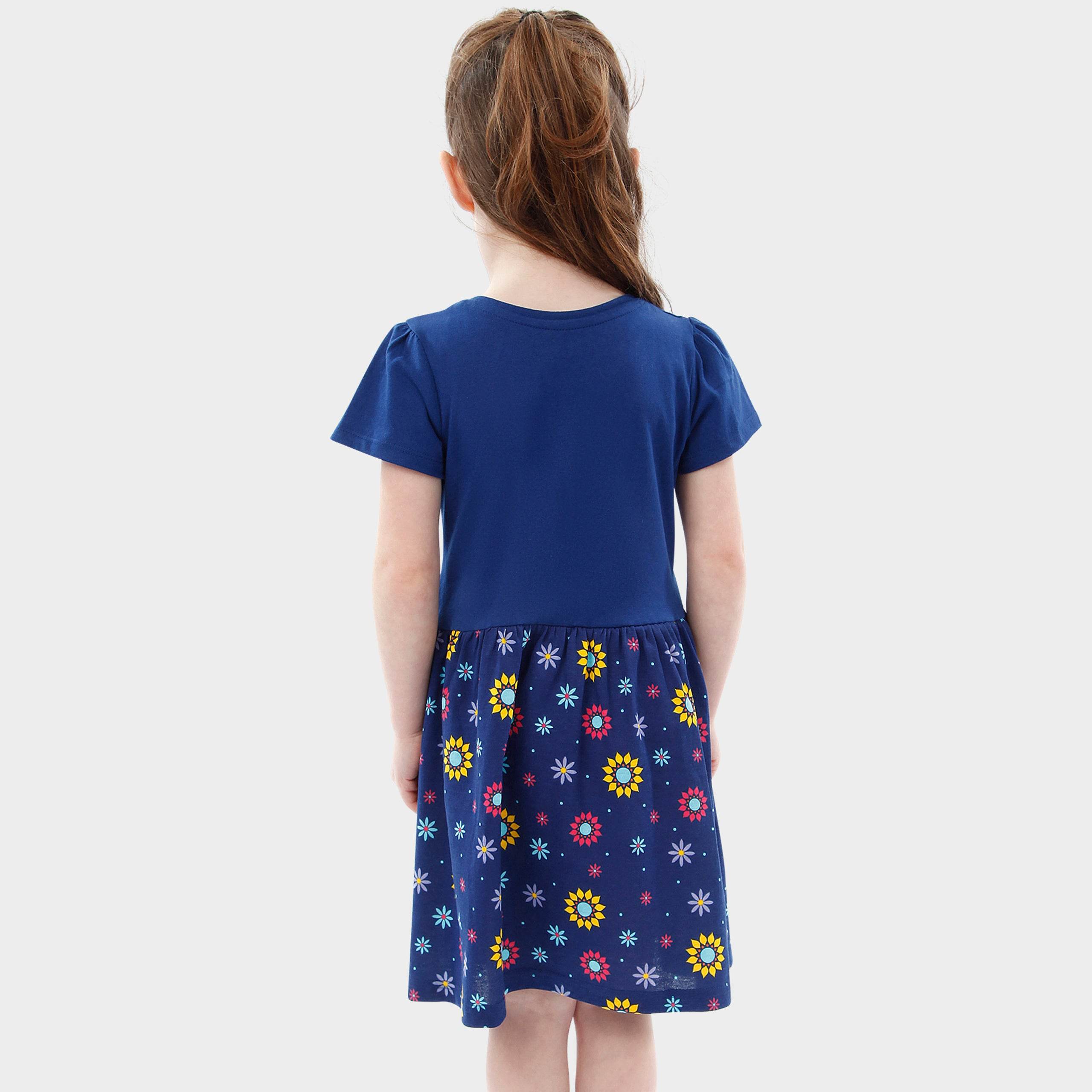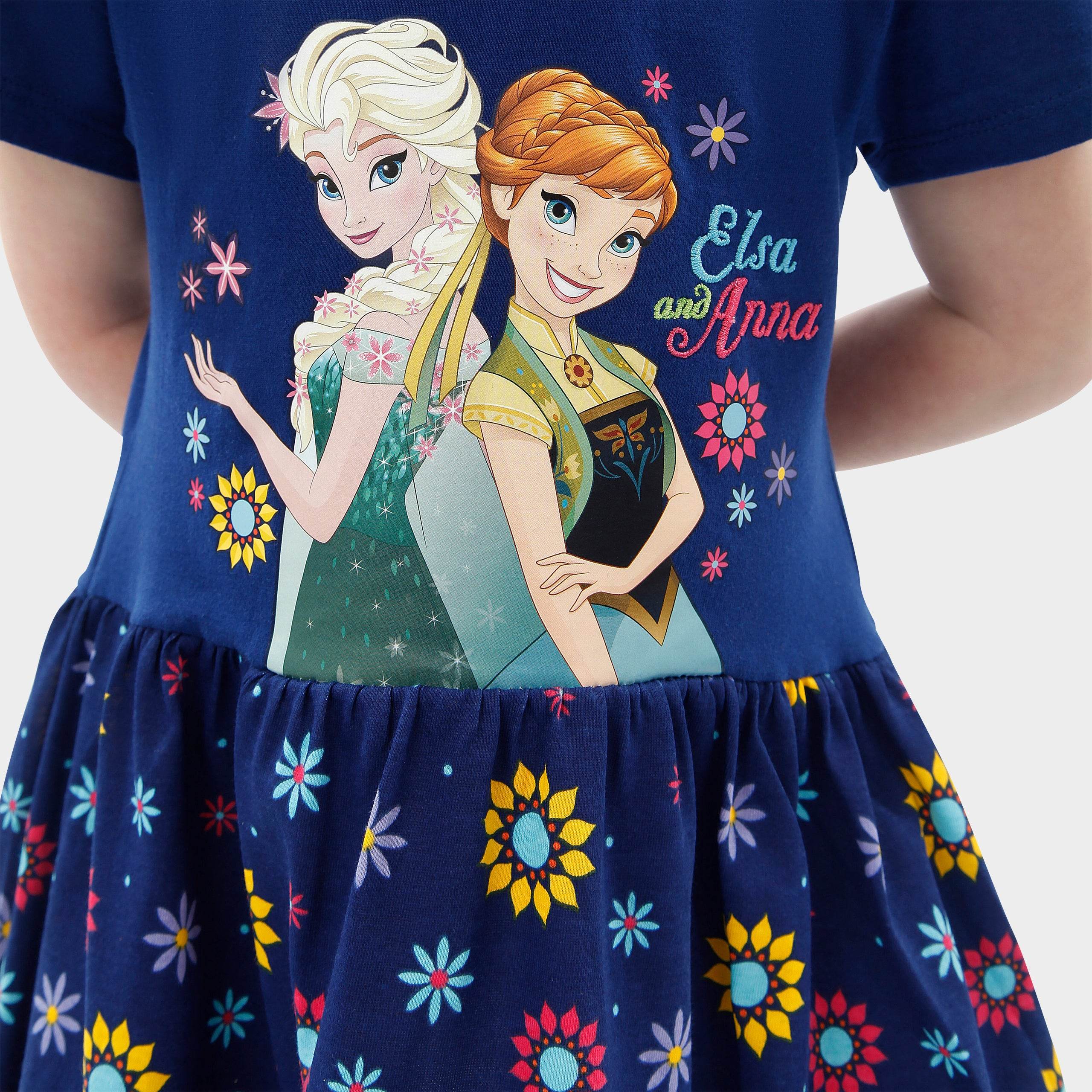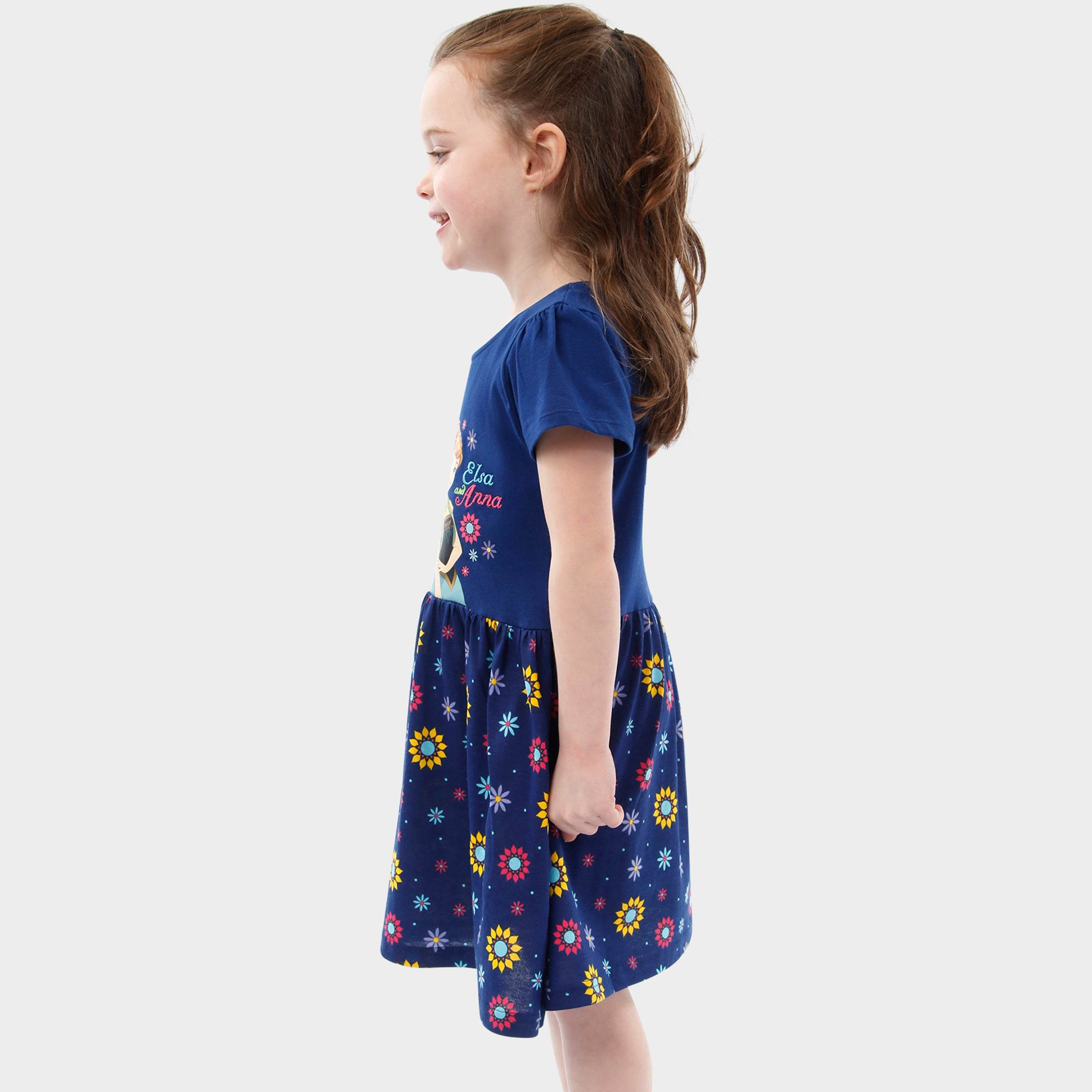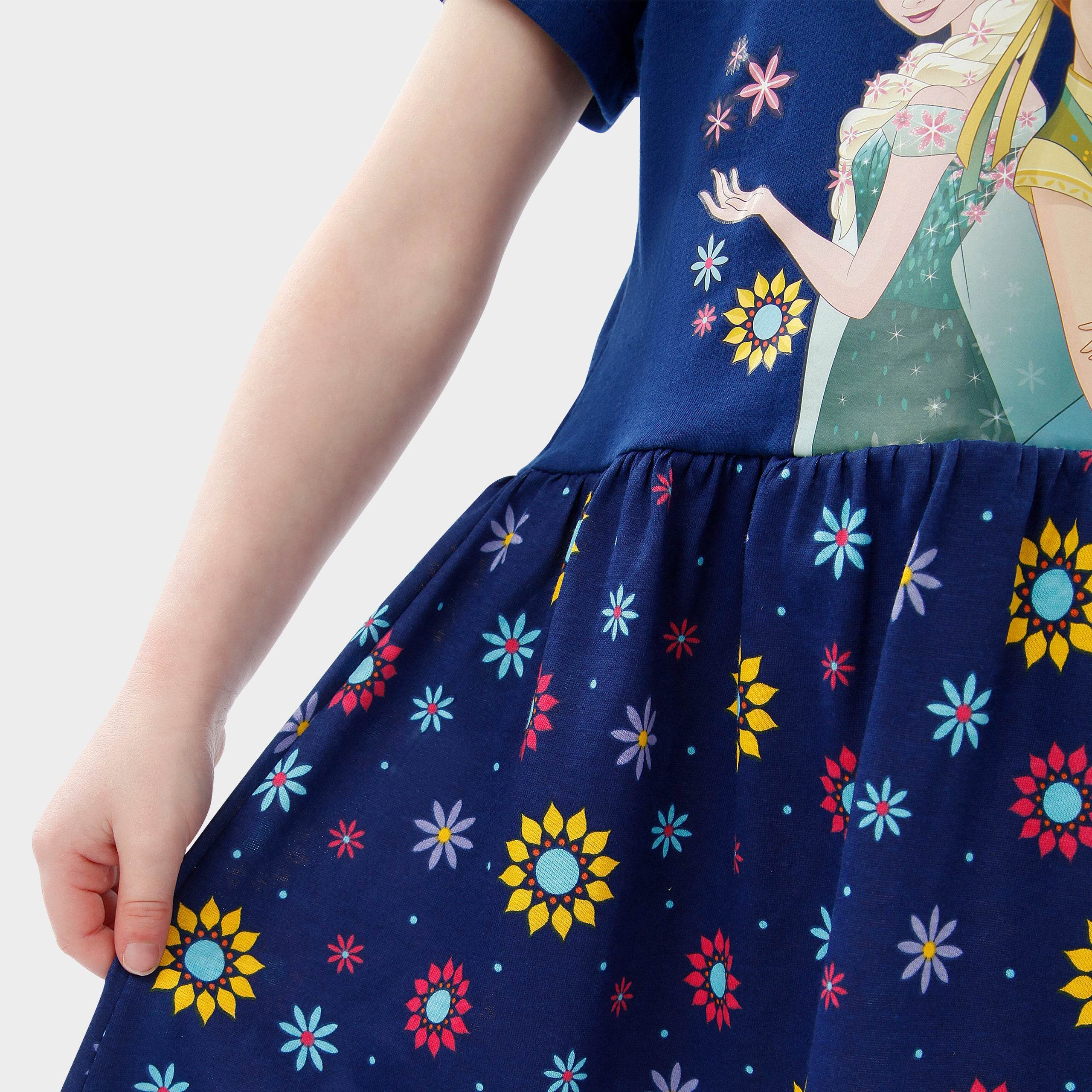 Blow away those winter storms and breeze into summer in this adorable Disney Frozen dress! The navy dress features iconic duo, Anna and Elsa, on the top with their names in glitter and surrounded by flowers. The skirt is adorned with an all over motif of cute flowers, perfect for twirling on hot summer days! Completed by adorable short princess sleeves, perfect for any true princess of Arendelle!