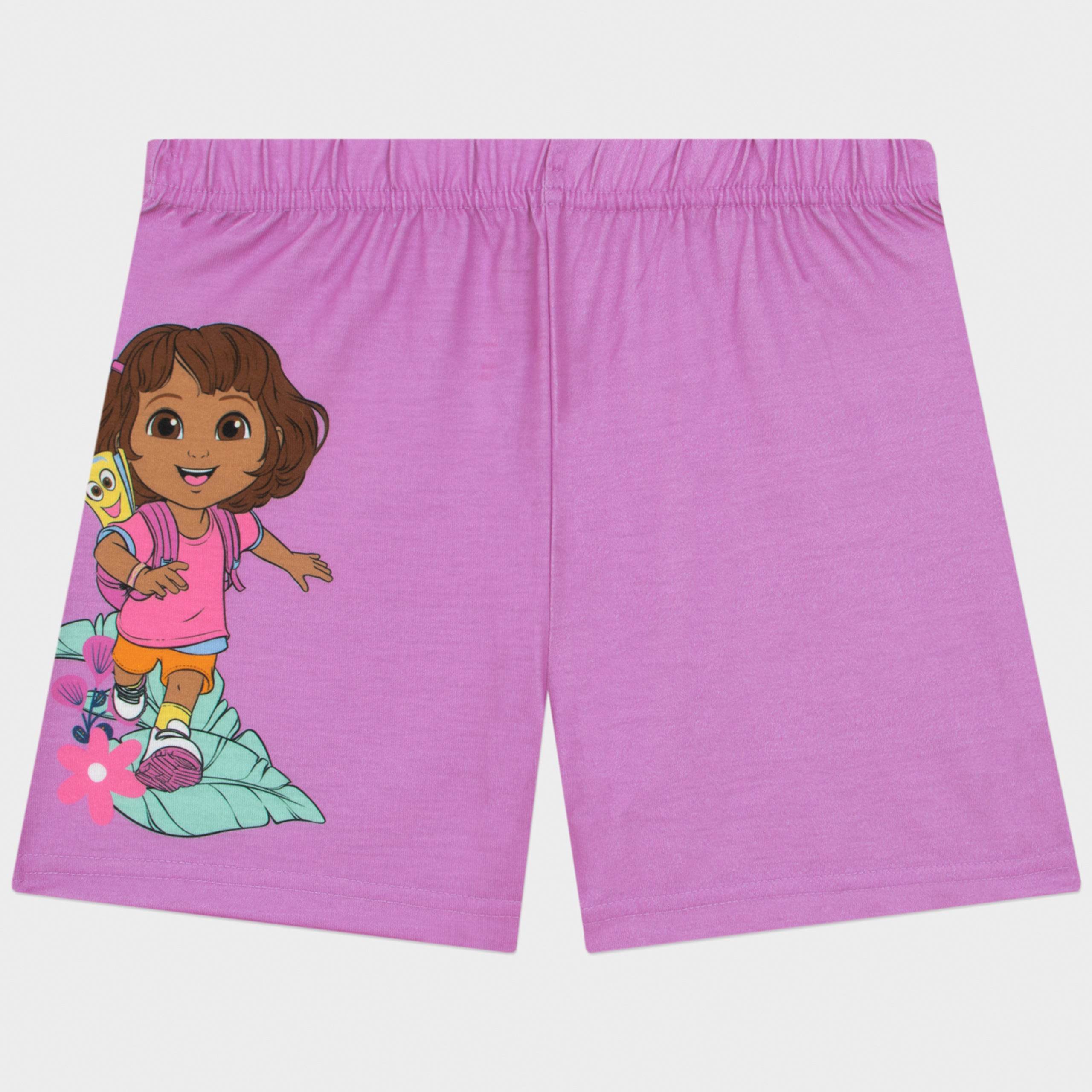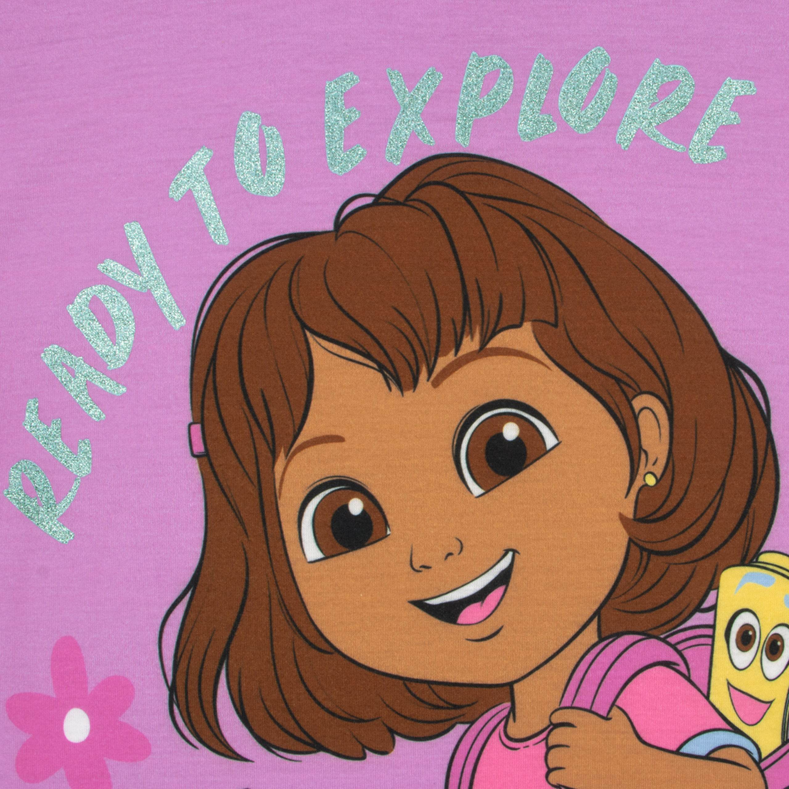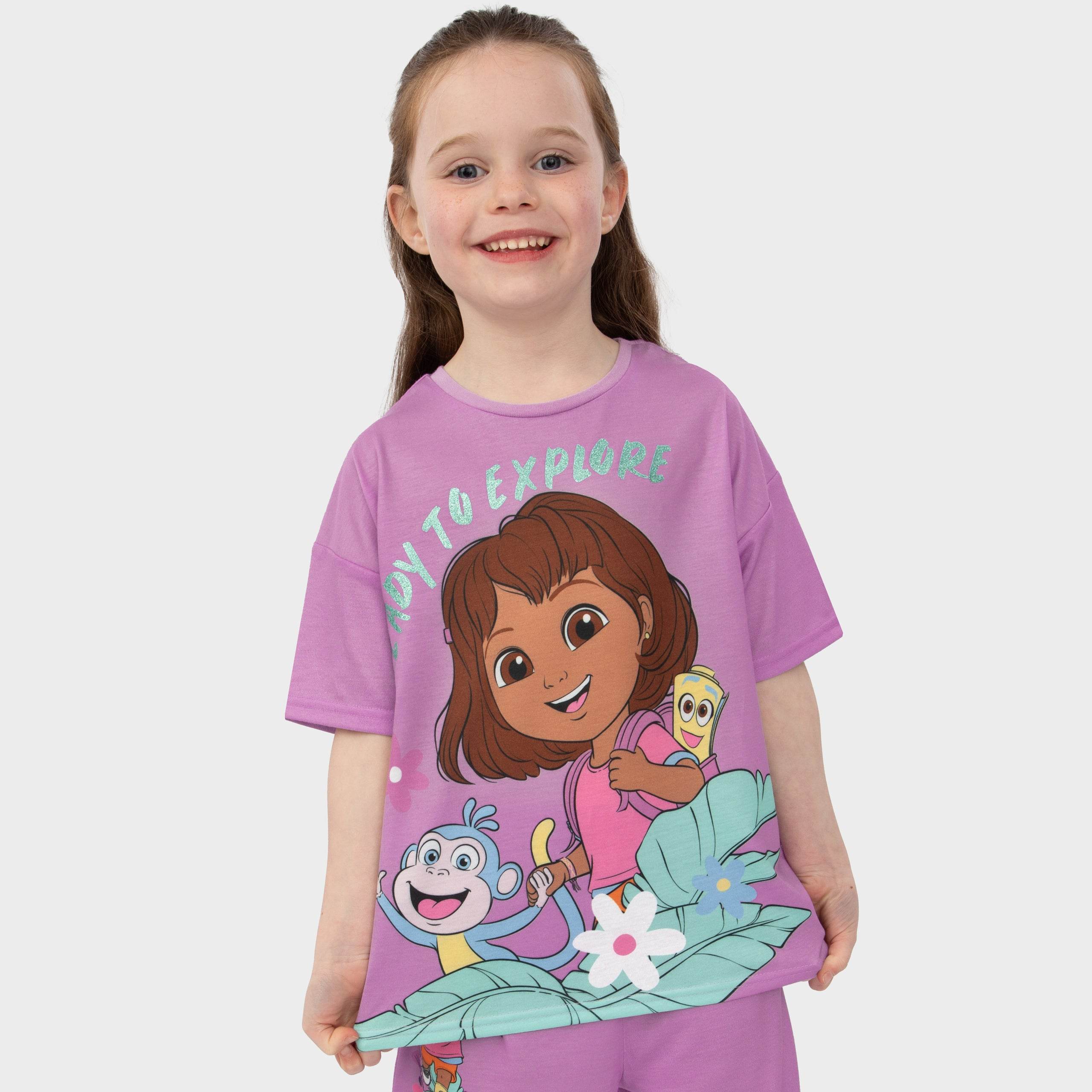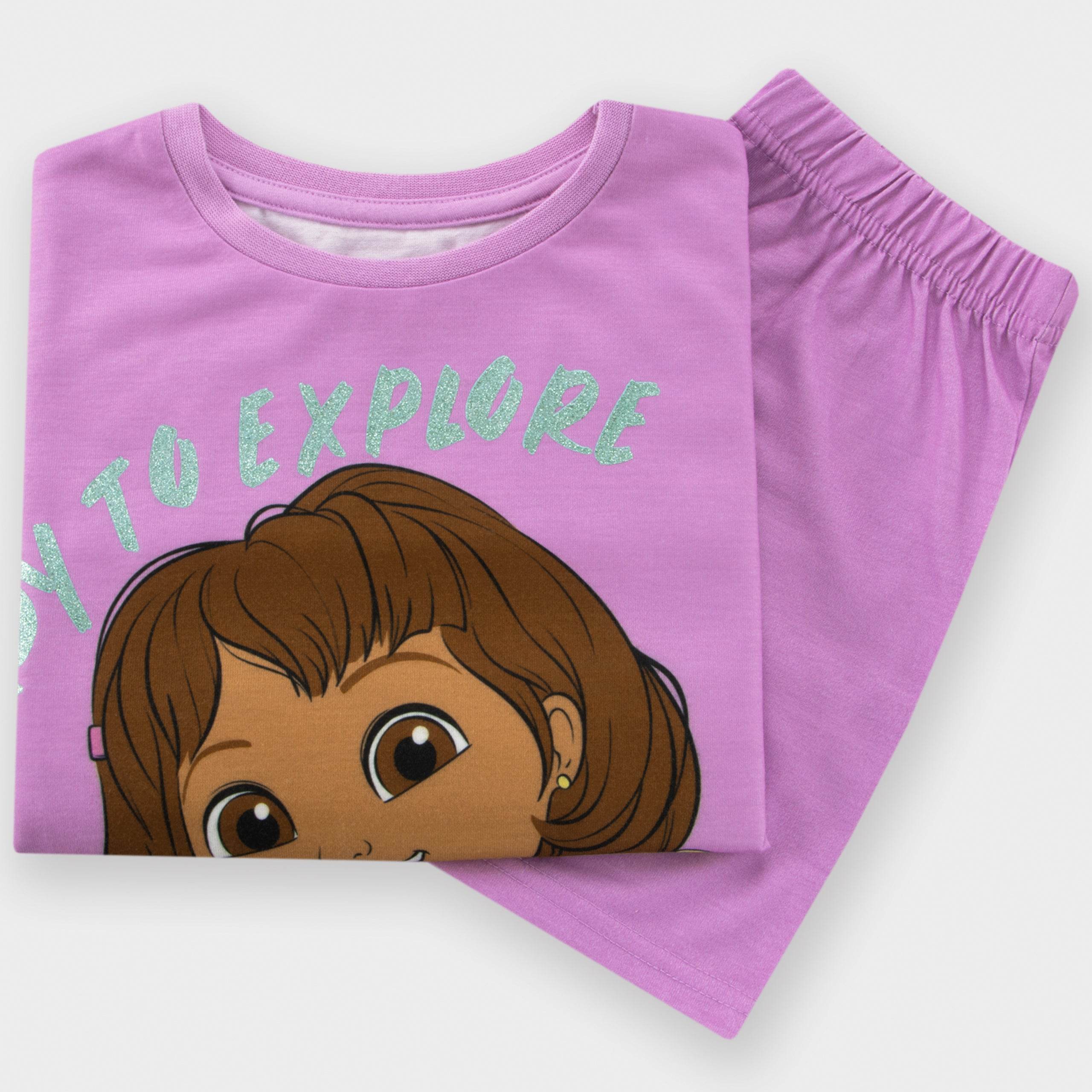 Little Dora fans will love bedtime with this fun and colourful Dora pyjama set! The short sleeve top features Dora, Boots, and Map with sparkly “Ready to Explore” text, perfect for adventure-filled dreams. The matching shorts add even more fun with a playful print and a comfy elastic waistband. Made from soft polyester, it's designed for dreamers aged 2 to 8 who love to sleep in style!