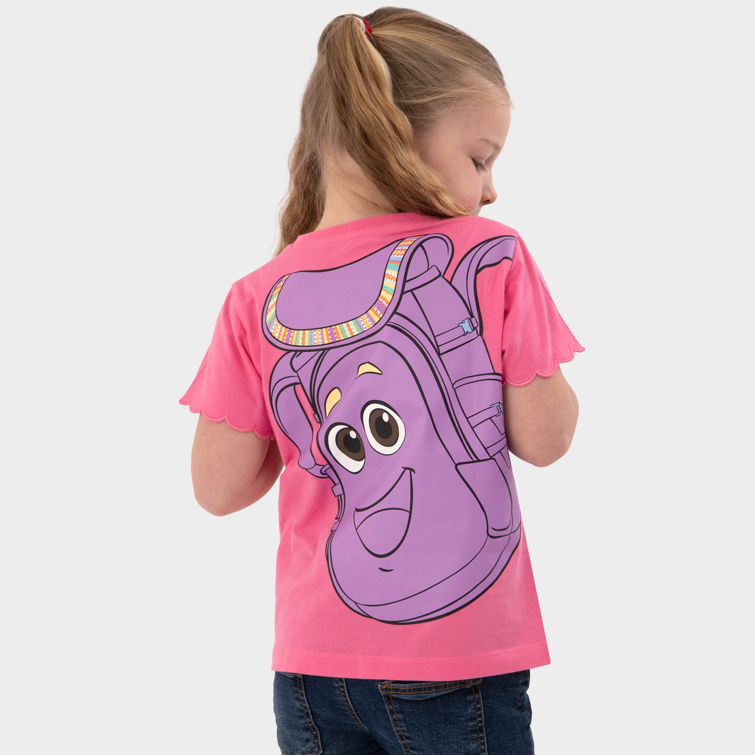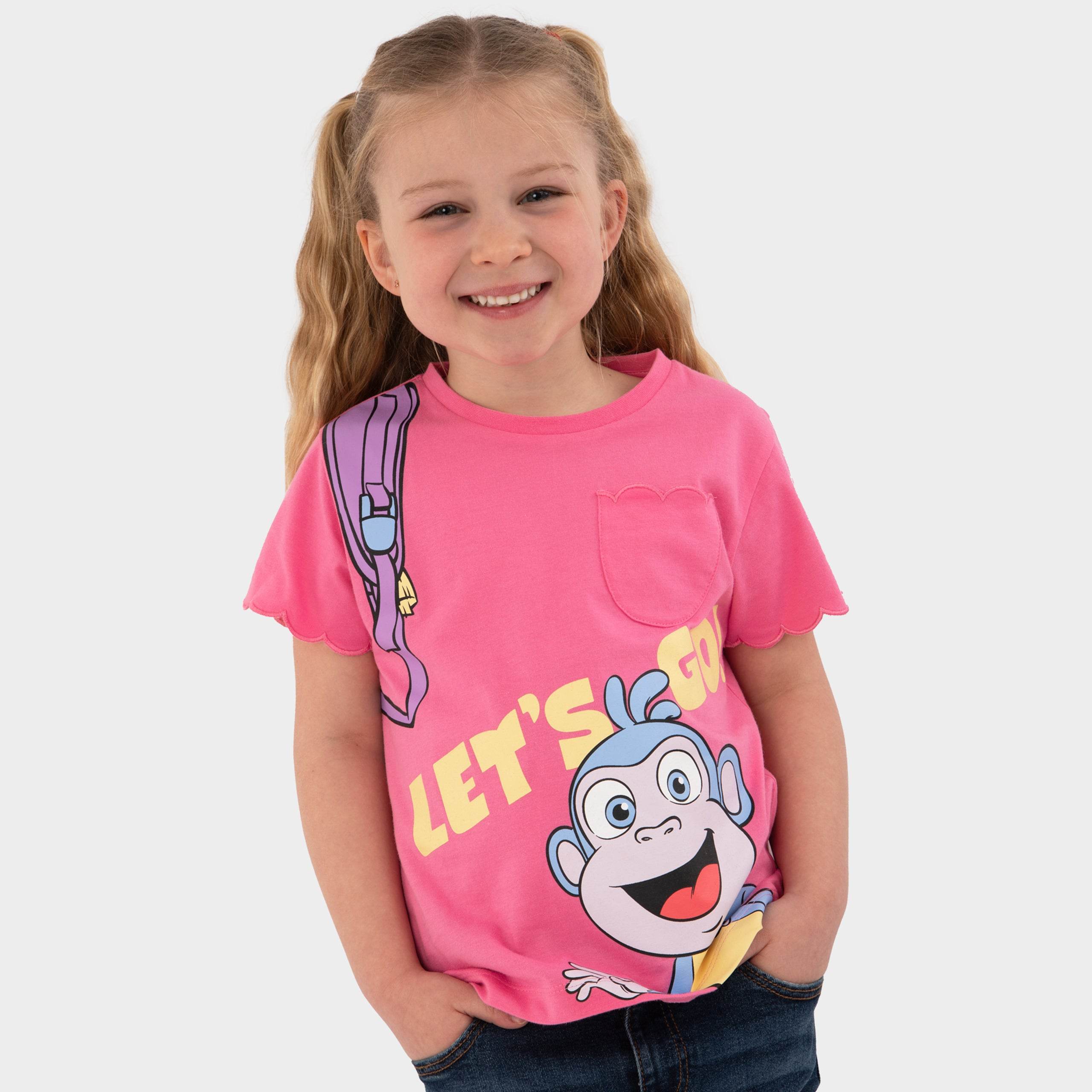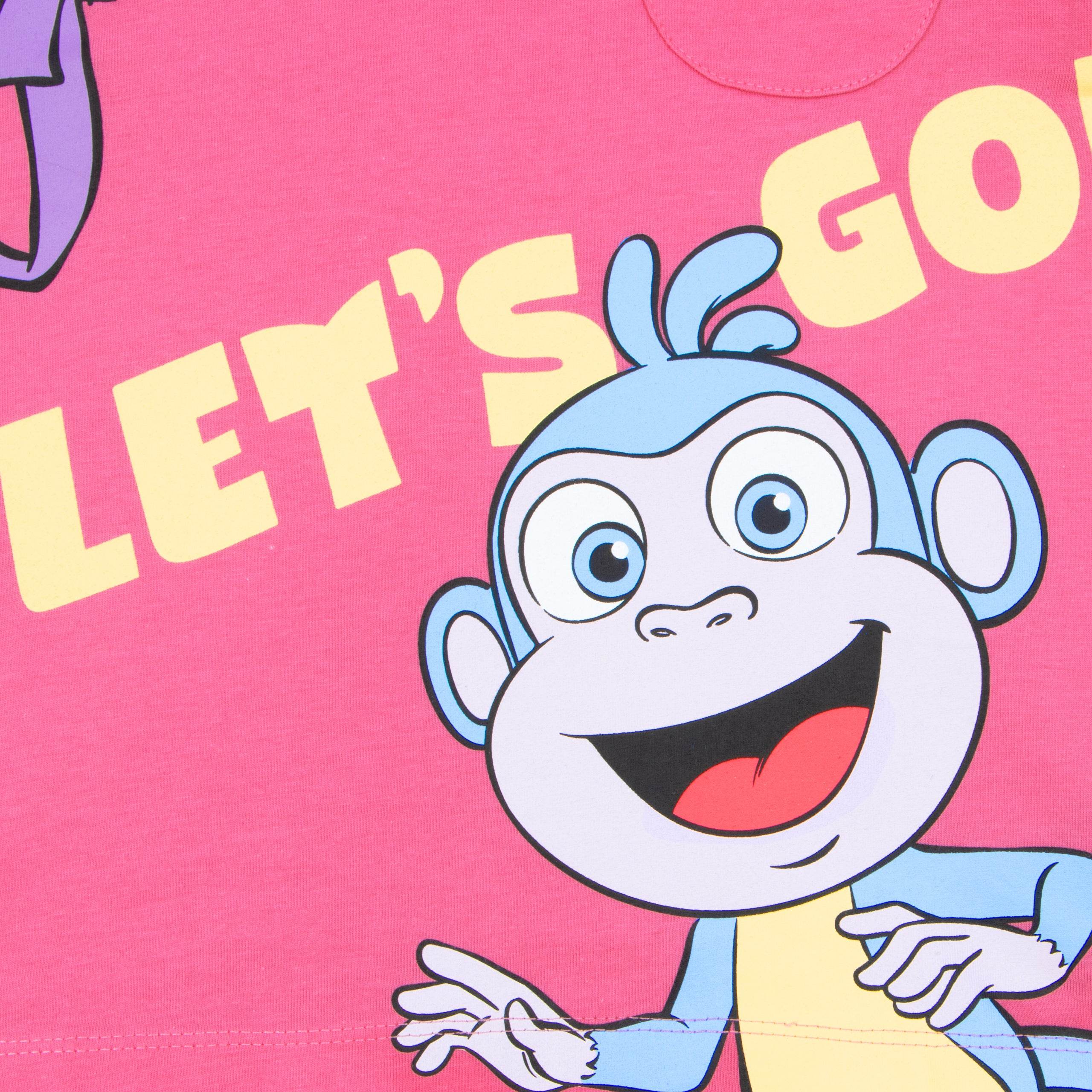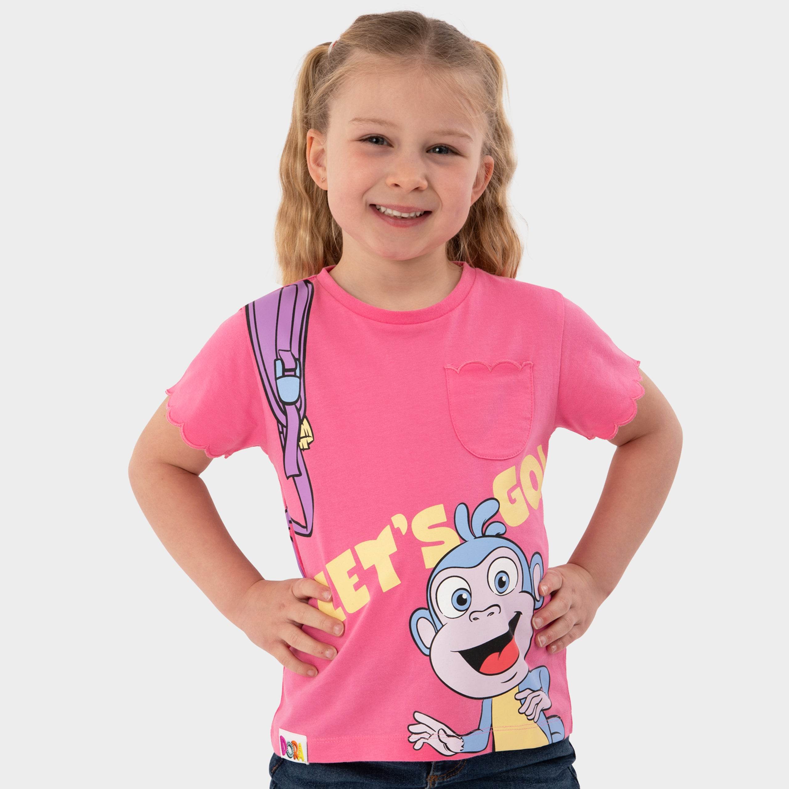 Get ready for adventure with this vibrant pink Dora tshirt for girls! Featuring cheerful Boots and bold yellow lettering "Let’s go!" on the front, plus Dora’s smiling backpack on the back, it’s packed with playful details. The printed strap adds a fun twist, making it look like she's ready to explore, while frilled details in the sleeves add a dash of adorable.