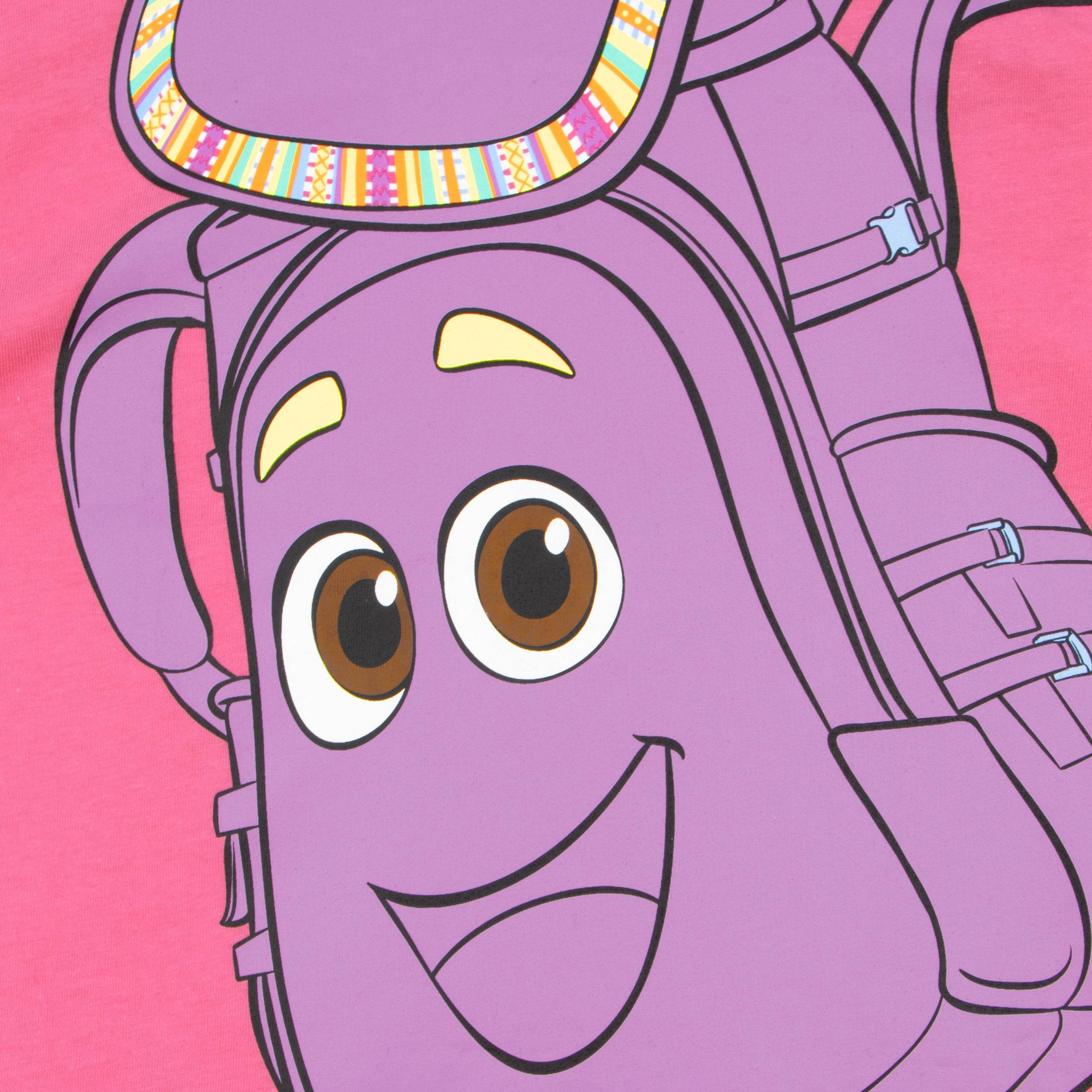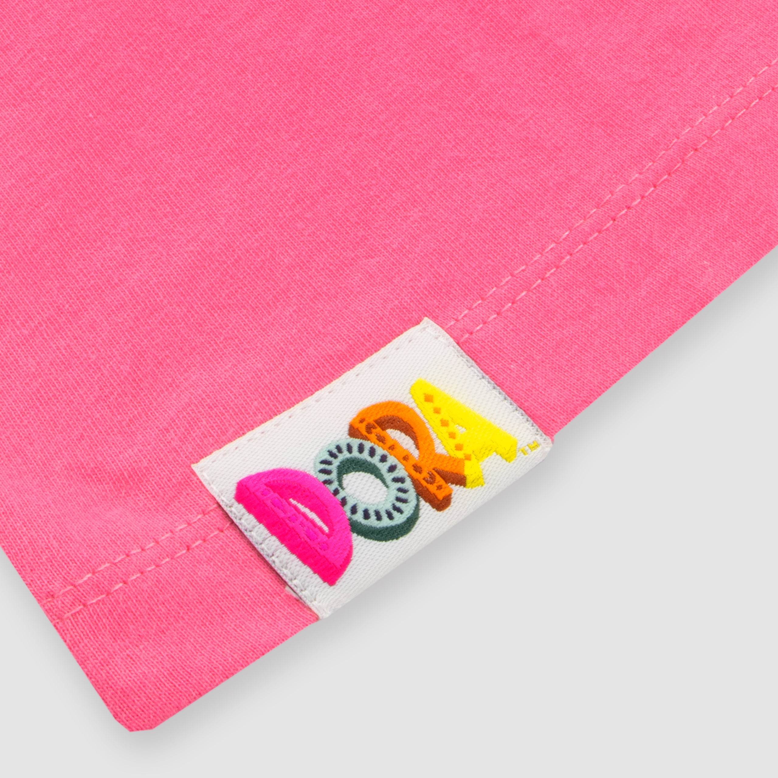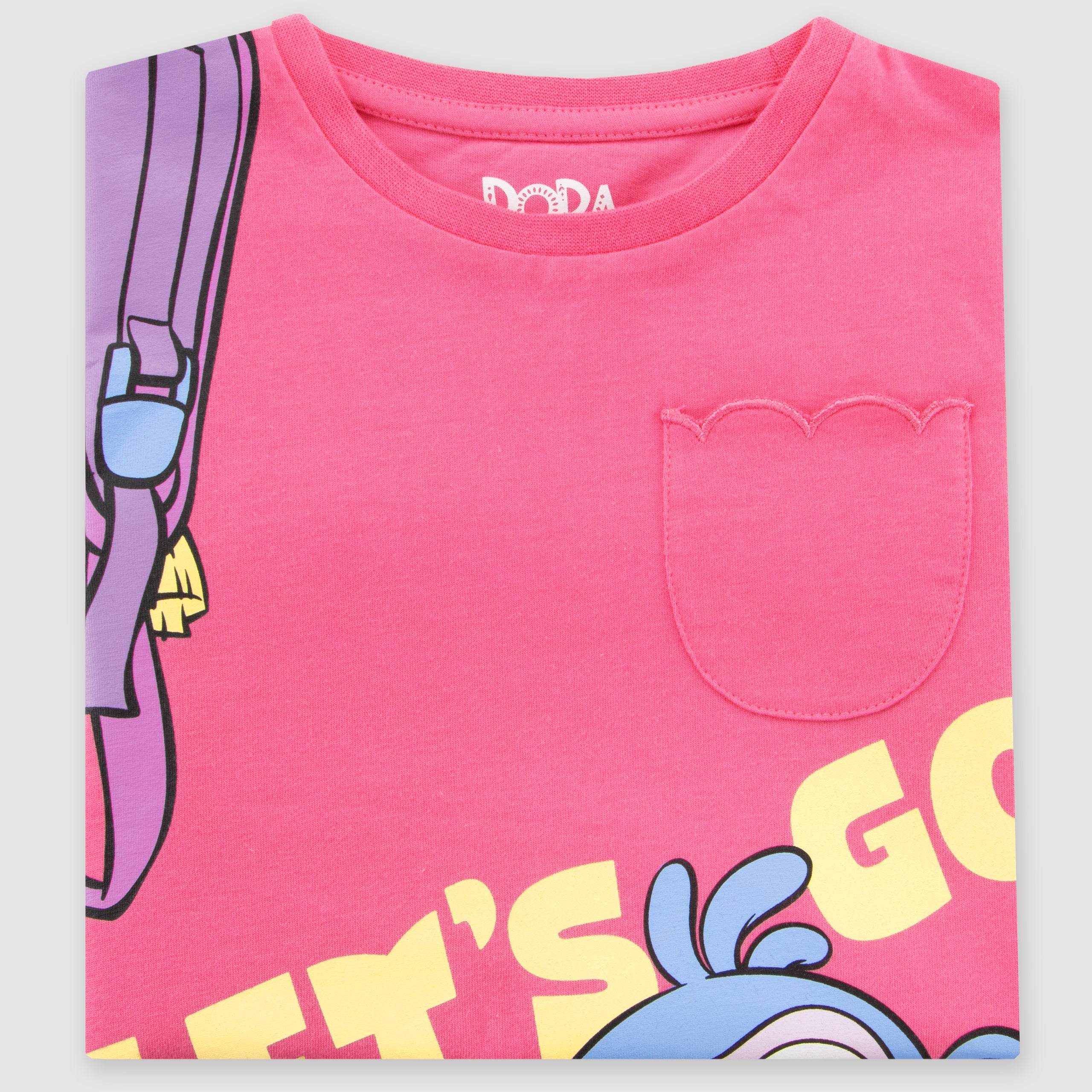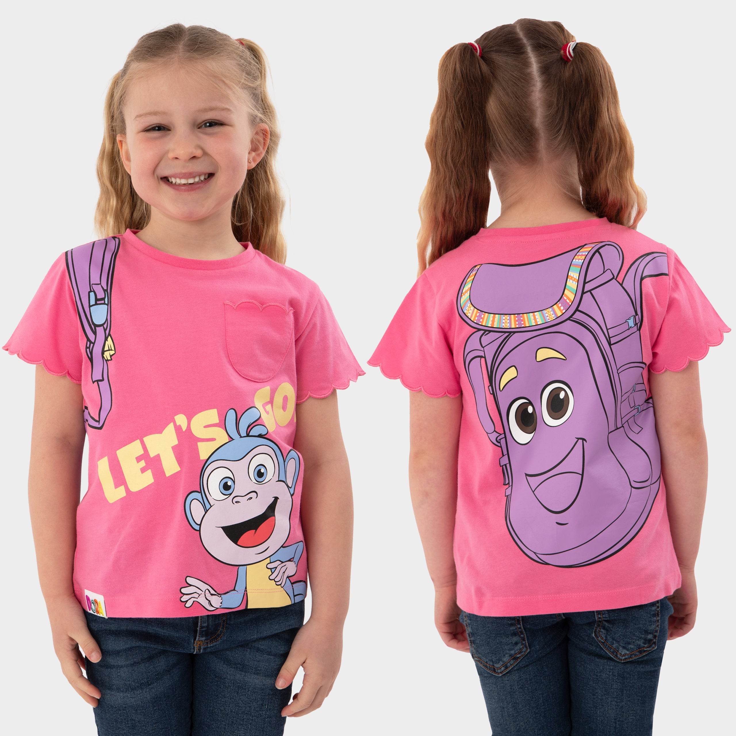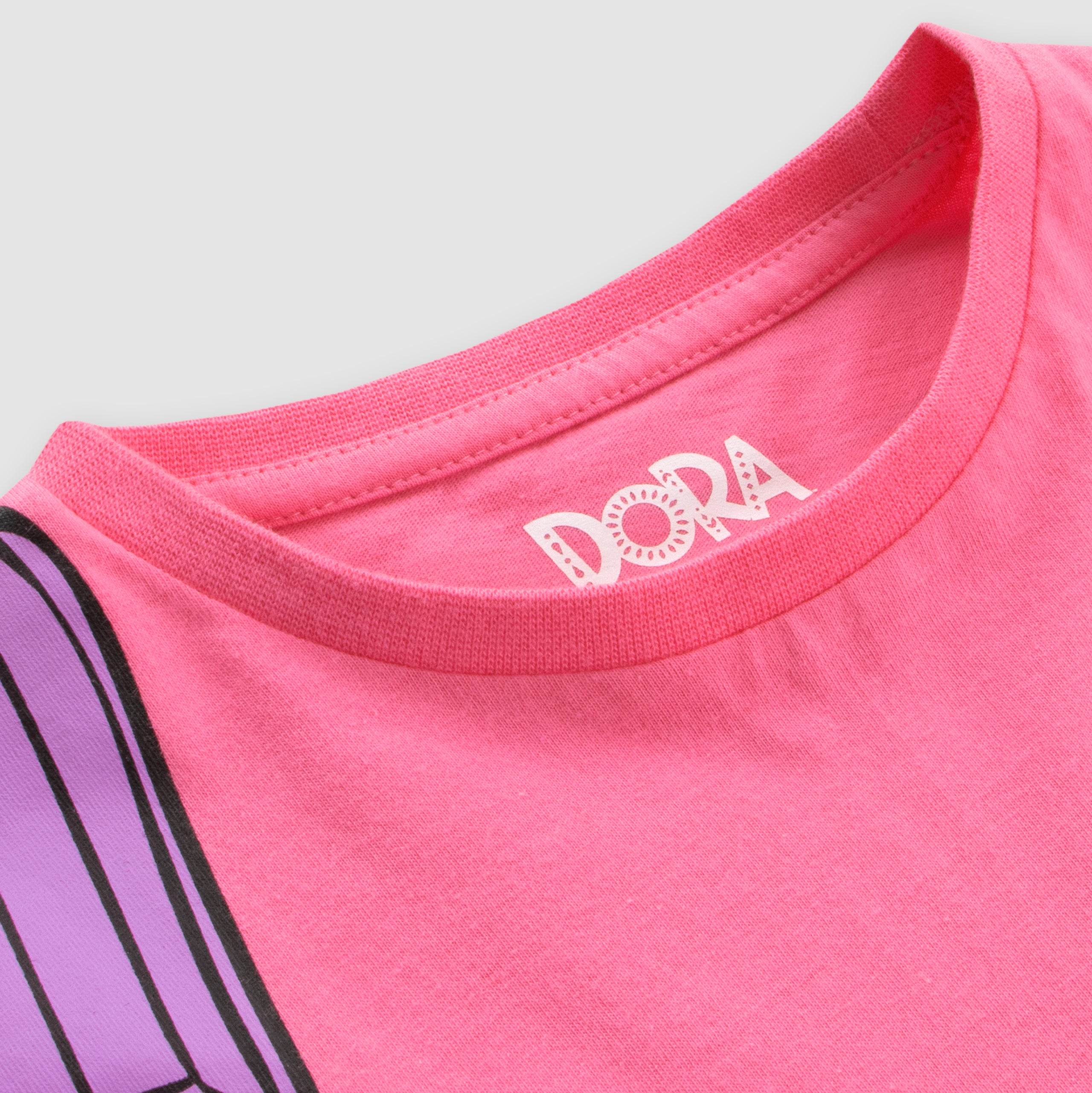 Get ready for adventure with this vibrant pink Dora tshirt for girls! Featuring cheerful Boots and bold yellow lettering "Let’s go!" on the front, plus Dora’s smiling backpack on the back, it’s packed with playful details. The printed strap adds a fun twist, making it look like she's ready to explore, while frilled details in the sleeves add a dash of adorable.