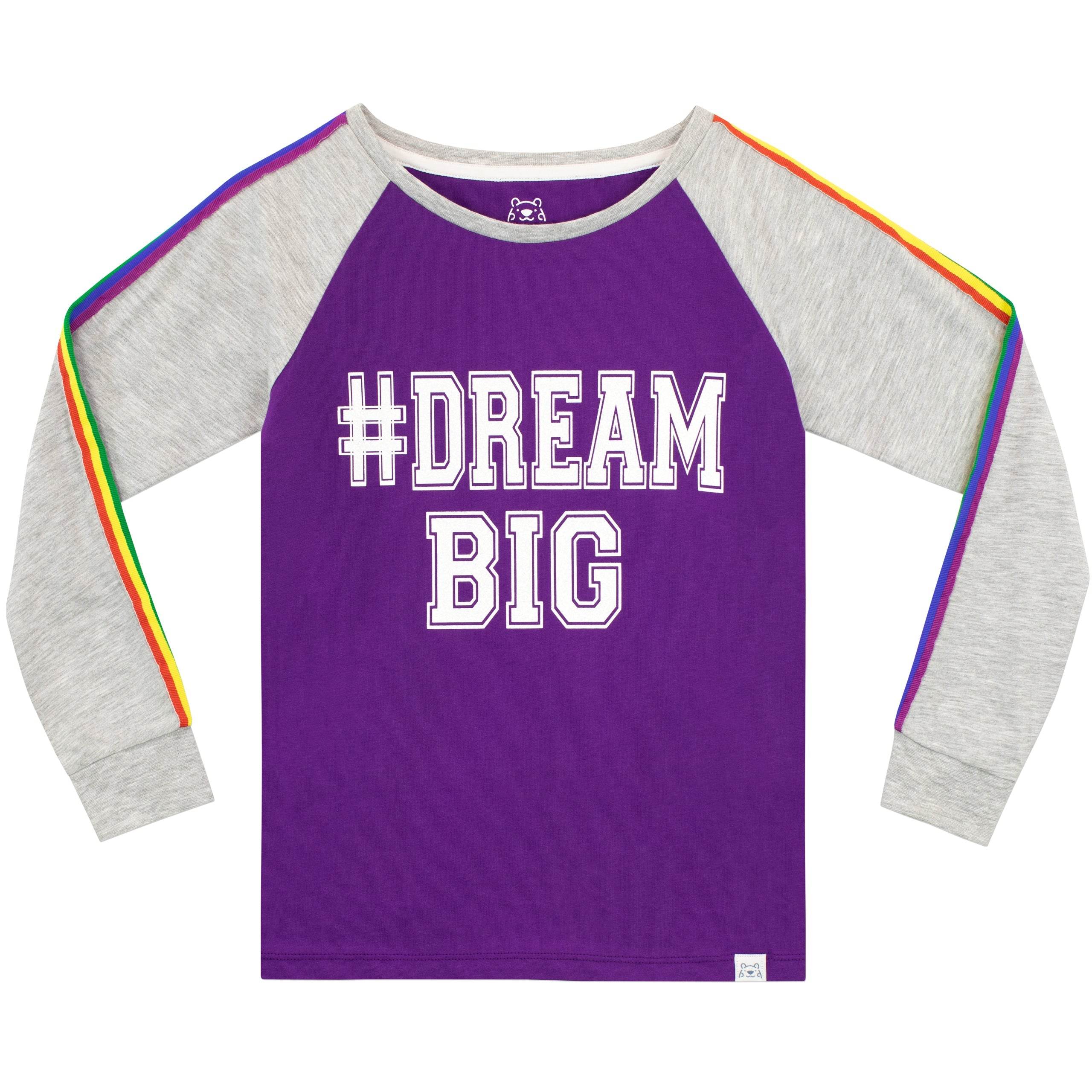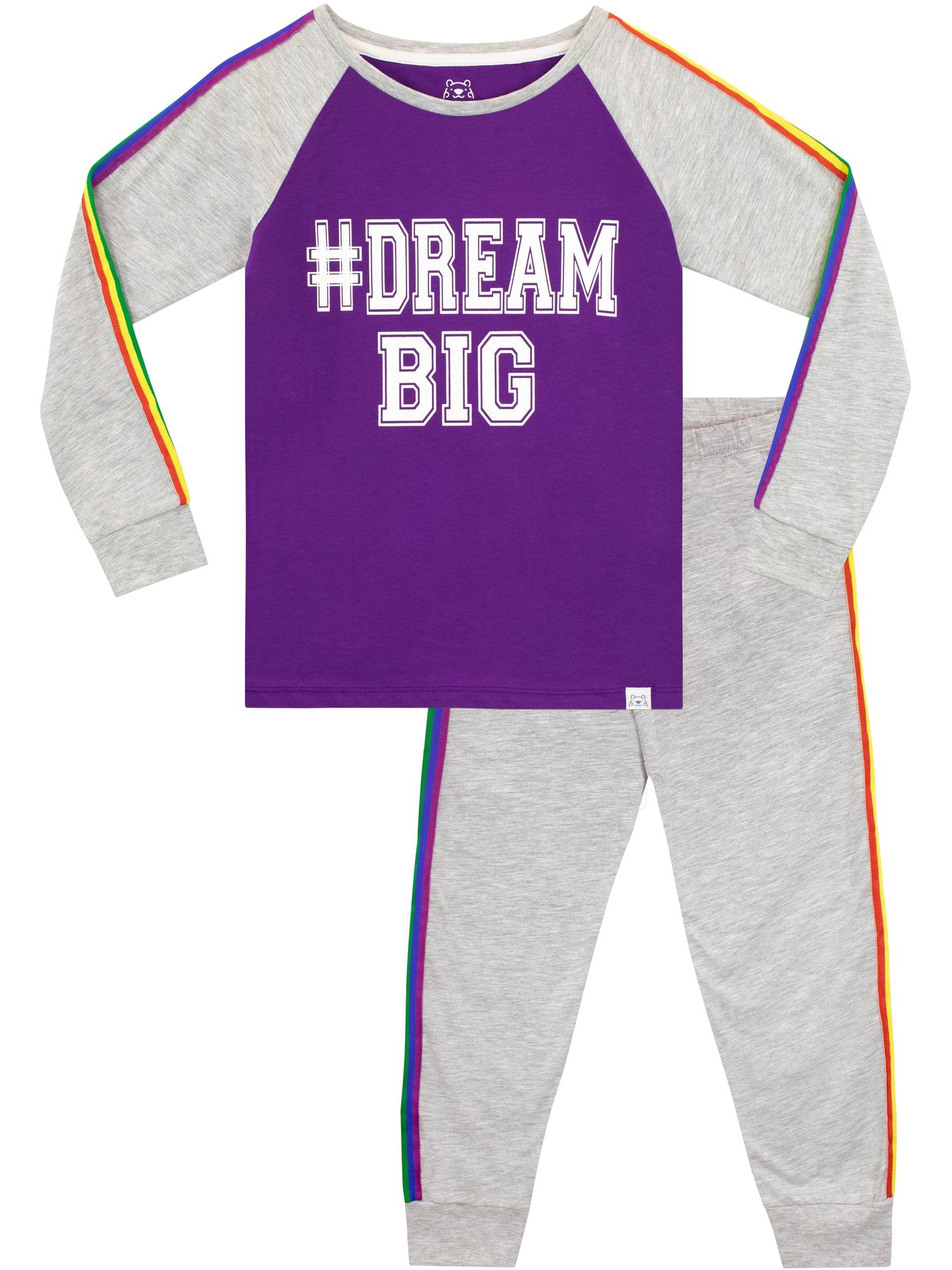 No dream is too big with this bold rainbow detail pyjama set. Harry Bear has designed the sporty slogan pyjamas w"#Dream Big" wording in Varsity style letters and a subtle glitter accent. The grey marl sleeves and bottoms have a tape detail of fun rainbow stripes to add a splash of colour.