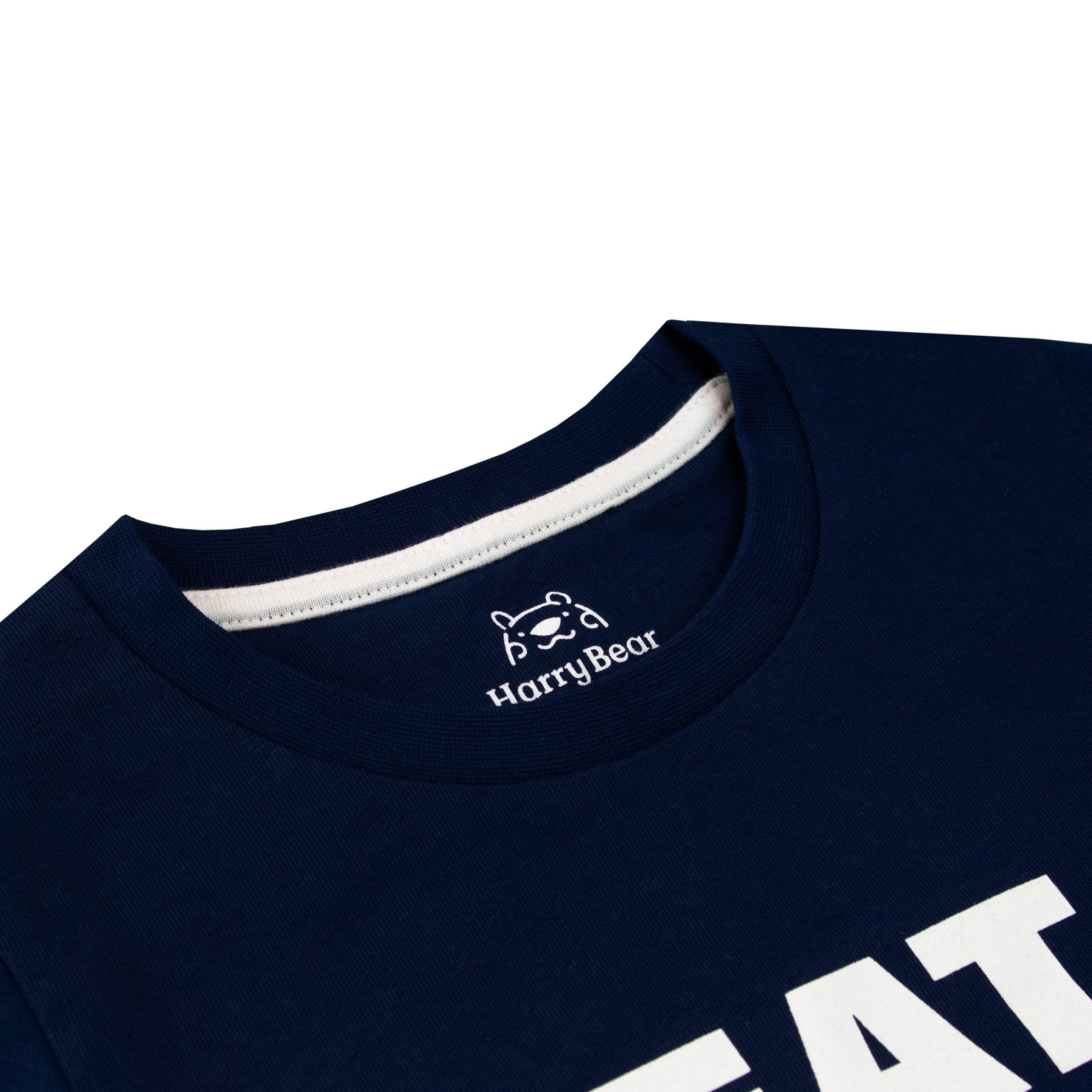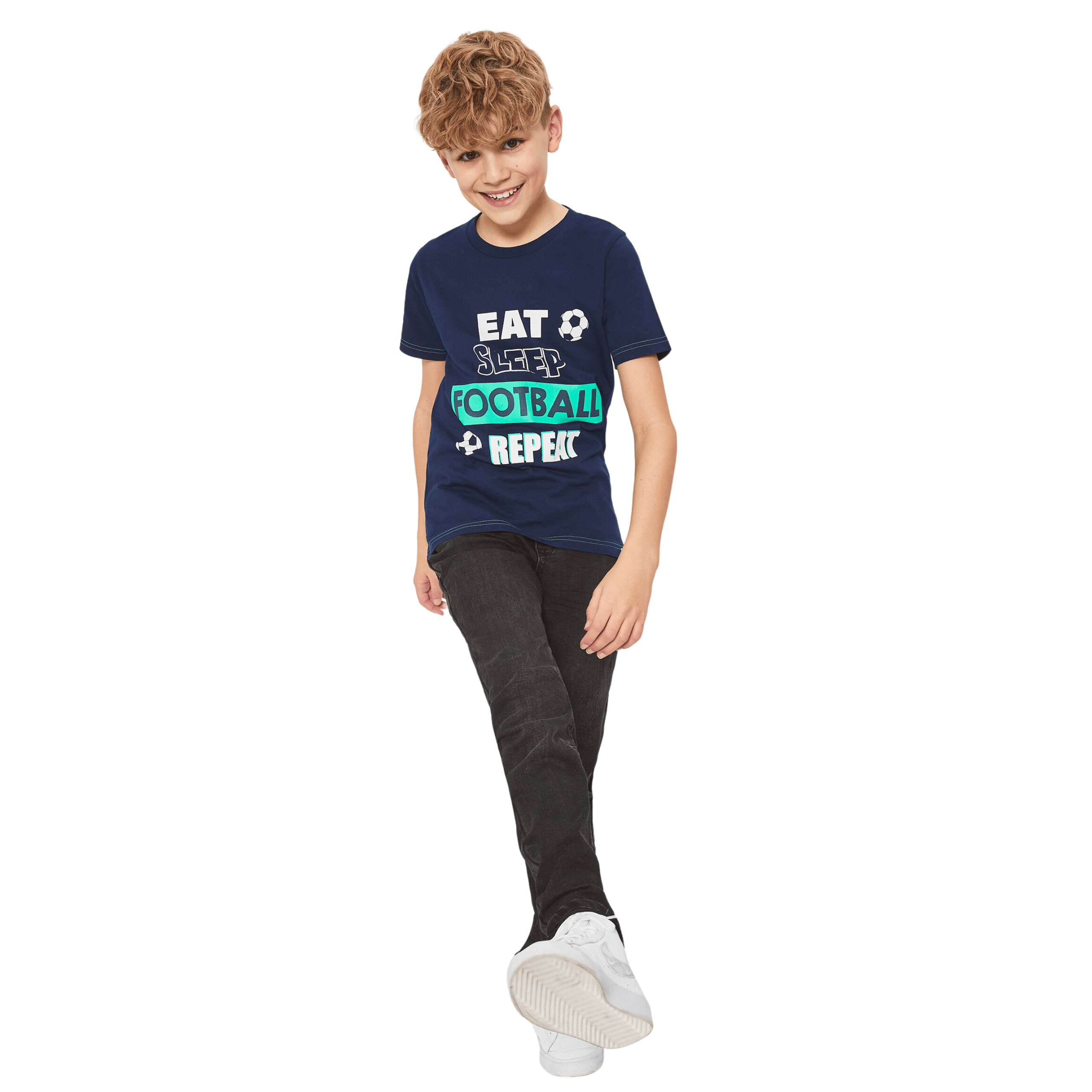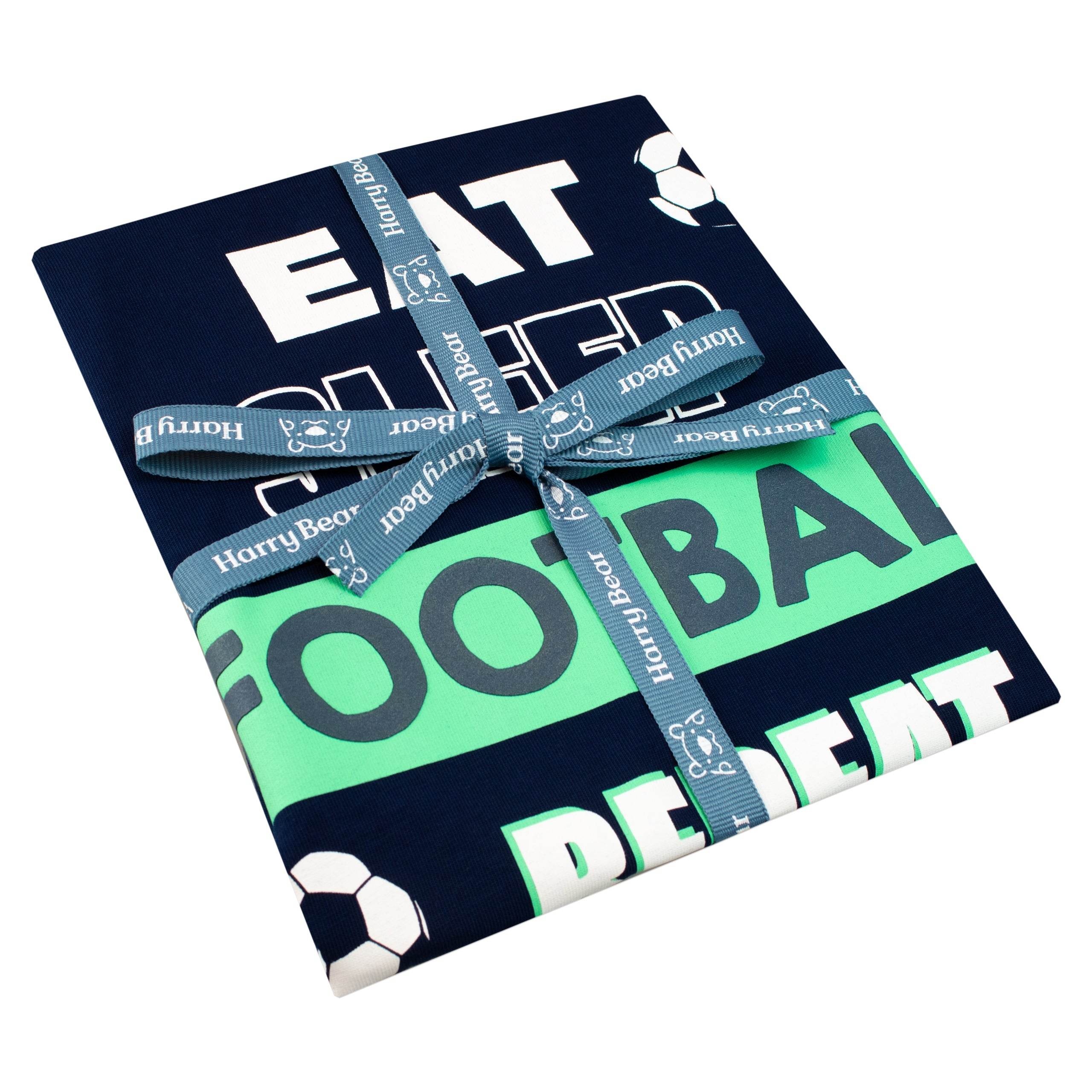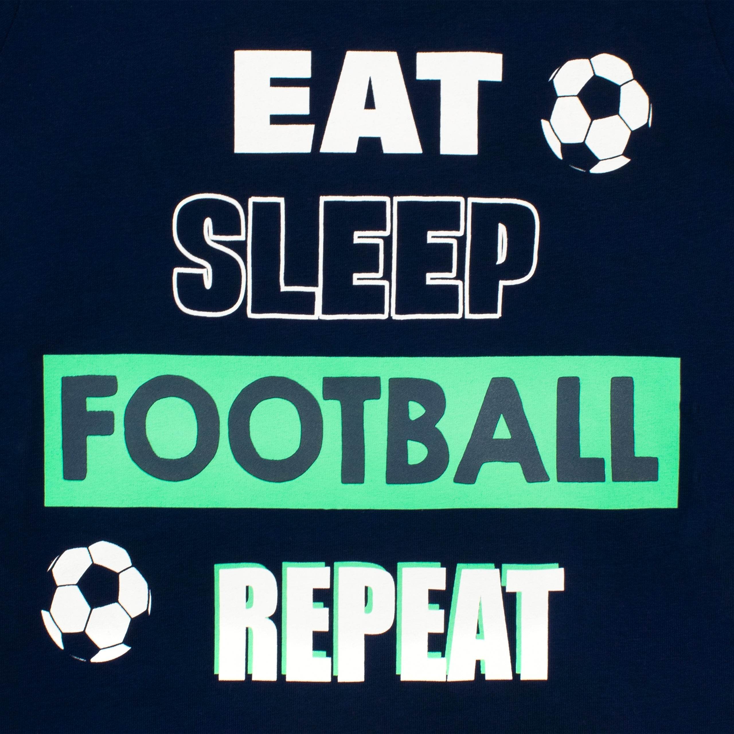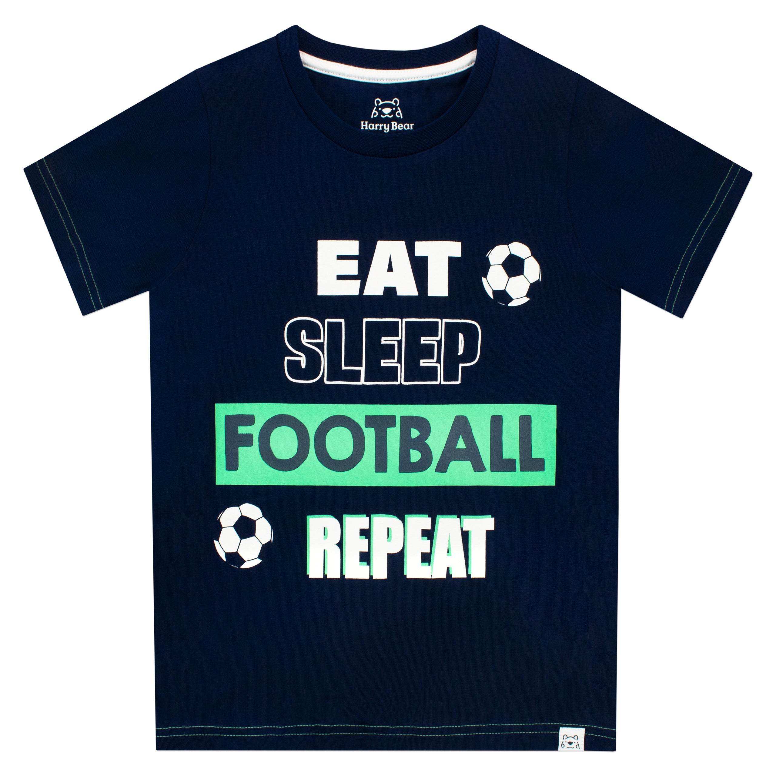 GOOOAALL!! If your footie fan is crazy about football you're sure to score high with this amazing football tee! Designed by Harry Bear, this navy blue short-sleeved top showcases the slogan 'Eat Sleep Football Repeat' in bold green and white lettering, featuring football prints. Whether they're out playing on the field or watching their favourite team play, this awesome tee will put them in the spirit to win!
