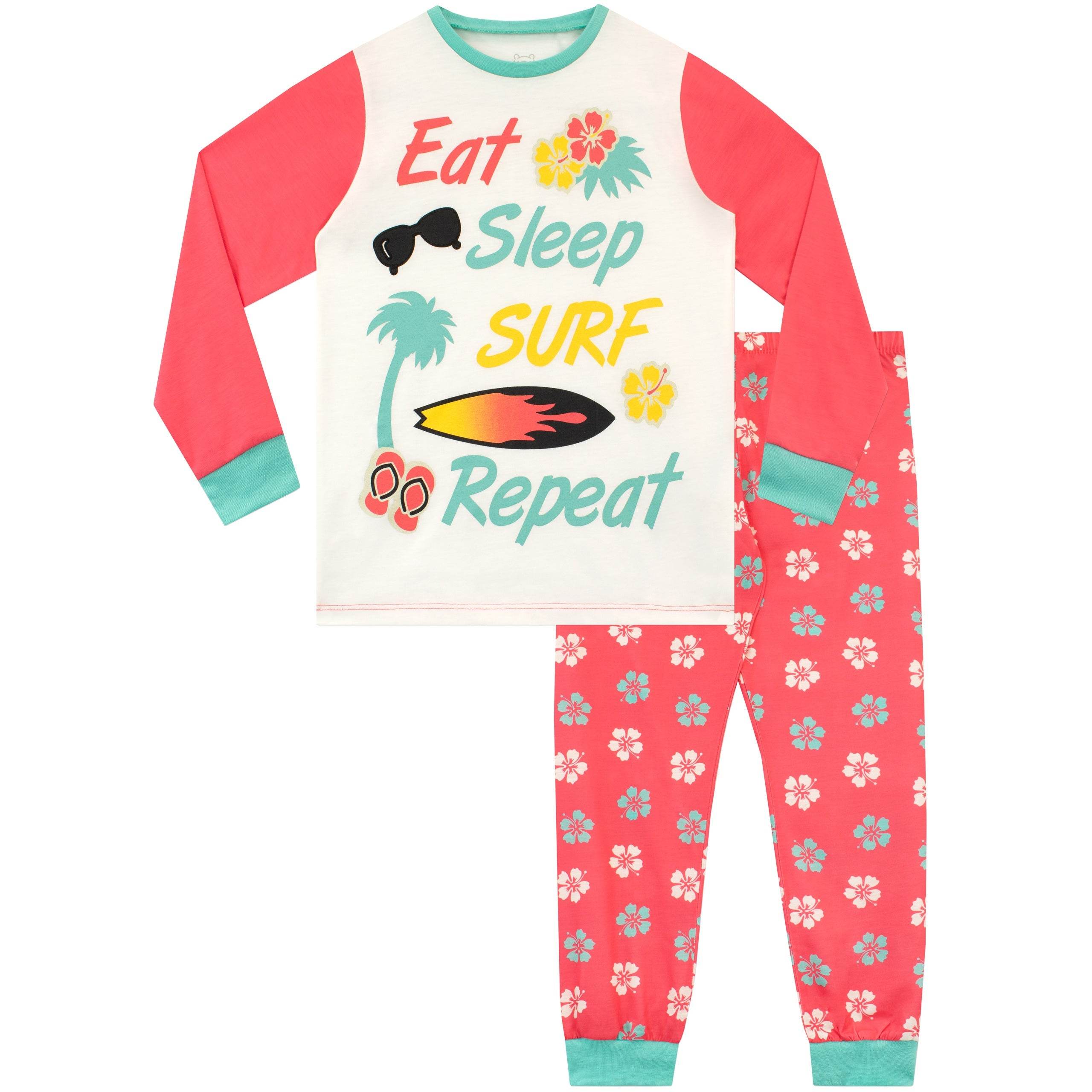 Surfs up! Time for your little surfer to catch the wave into dreamland with these tropical surf jammies! Designed by Harry Bear, this cream, pink and turquoise pyjama top showcases the slogan 'Eat, Sleep, Surf, Repeat' with images of a surfboard, Hibiscus flowers, sunglasses, a palm tree and flip flops. Paired with pink pj bottoms with a pattern of Hibiscus flowers, and elasticated turquoise cuffs for extra comfort. Let the rolling waves carry your surfer into a deep sea sleep in these cute pyjamas! Finished with a hand-tied Harry Bear ribbon to make the perfect gift.