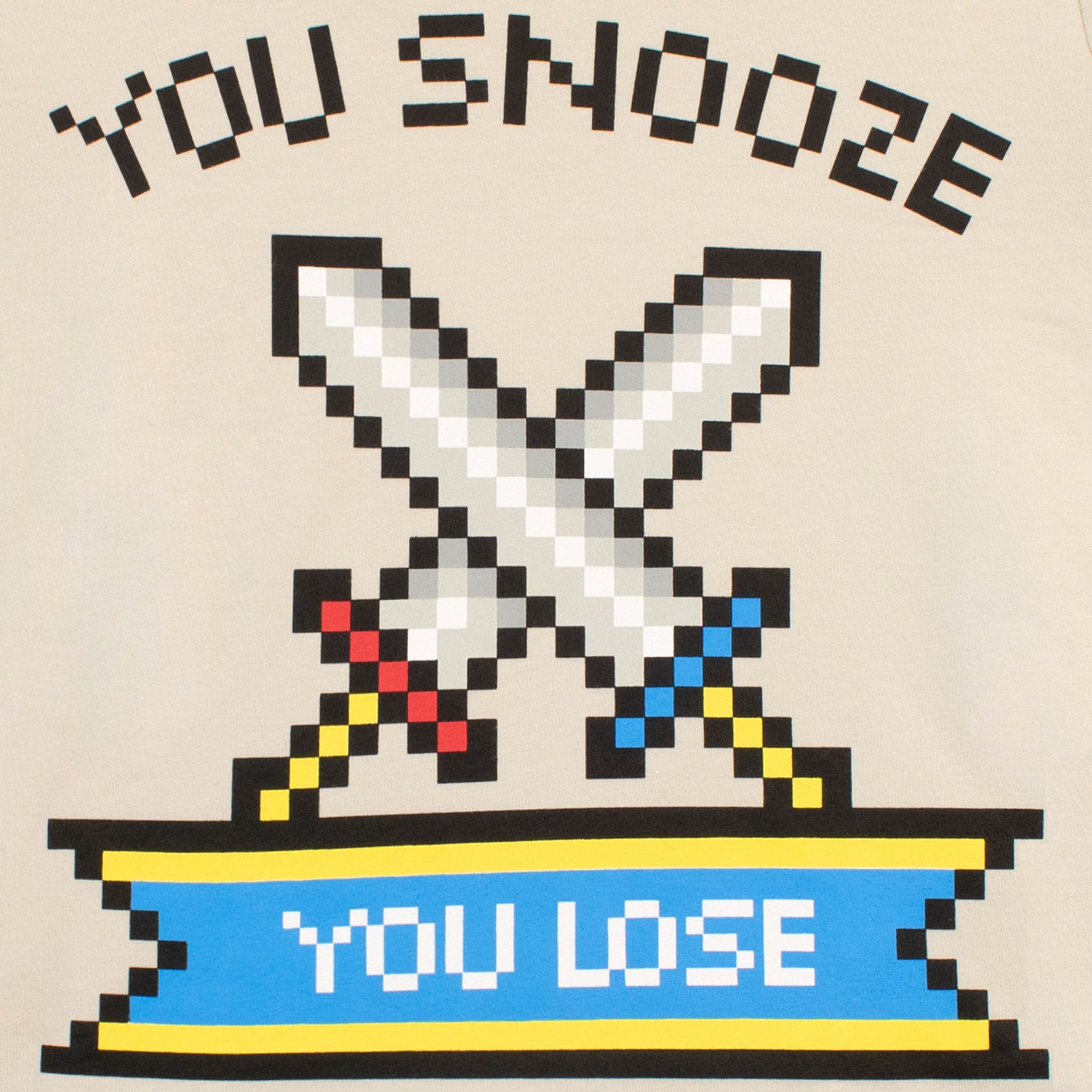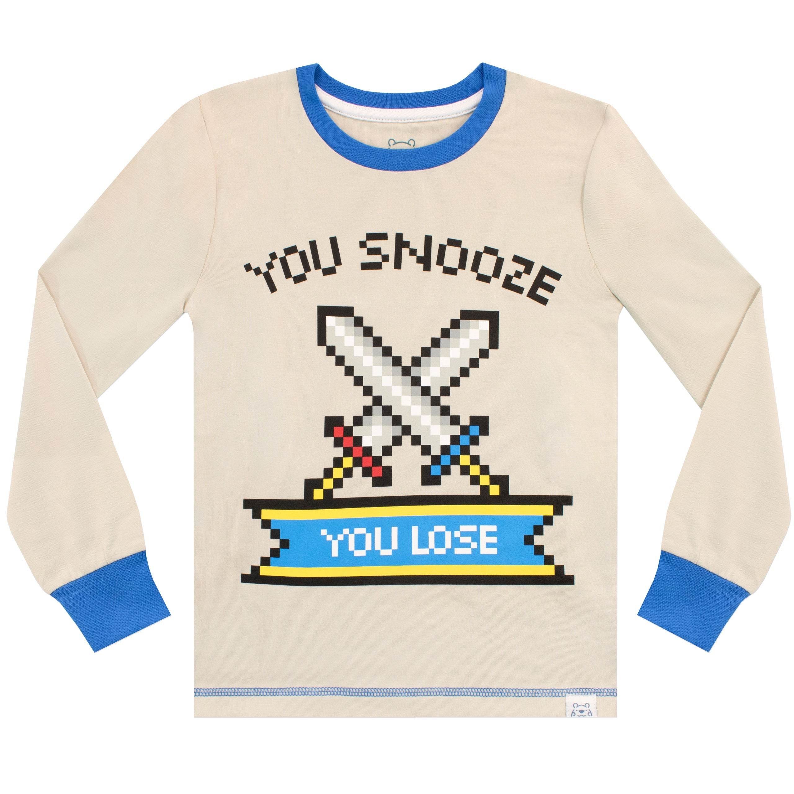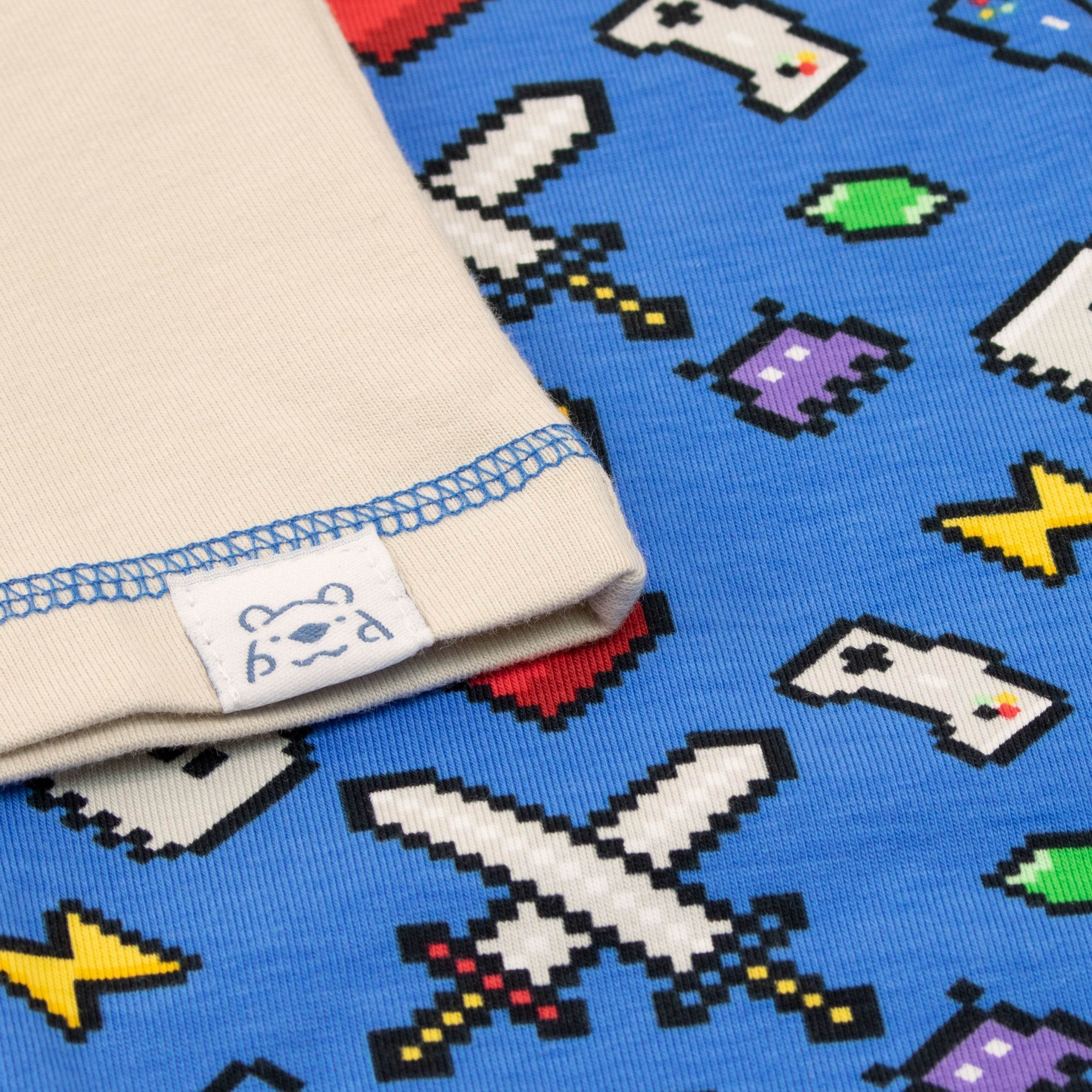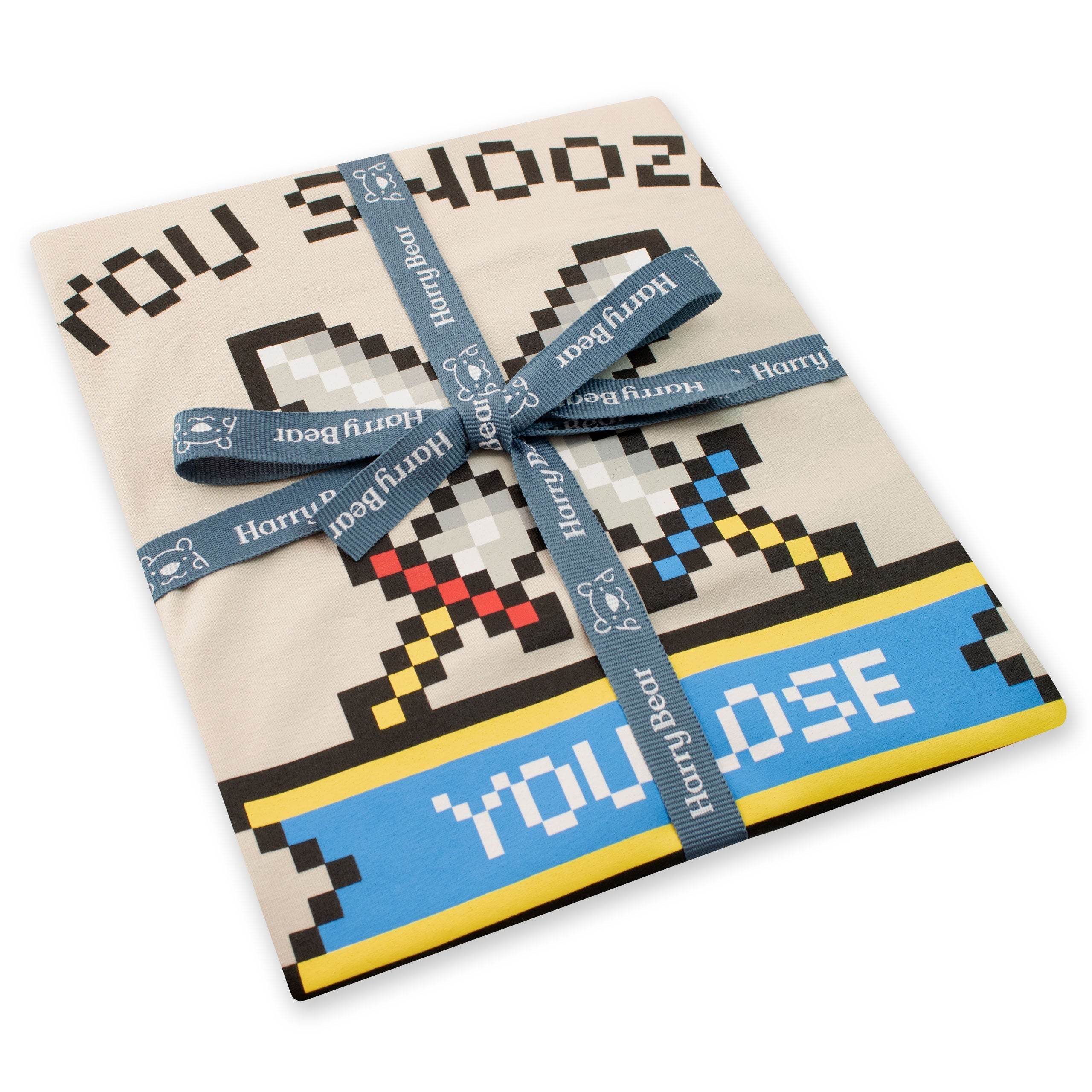 It's time to face the final boss: bedtime! Your little gamer will win at snoozing every time with these pixelated video game pjs. Designed by Harry Bear, these grey and blue jammies showcase classic video gaming imagery - an 8-bit print of swords with the words 'You Snooze You Lose' on the top and a pattern of health hearts, swords, ghosts and consoles on the bottoms. Crafted in a super soft stretchy cotton, this premium quality pyjama set is snug fit for comfort, however we recommend ordering a size up for a little extra room. Complete by hand-tied Harry Bear ribbon to make a perfect present finish!
