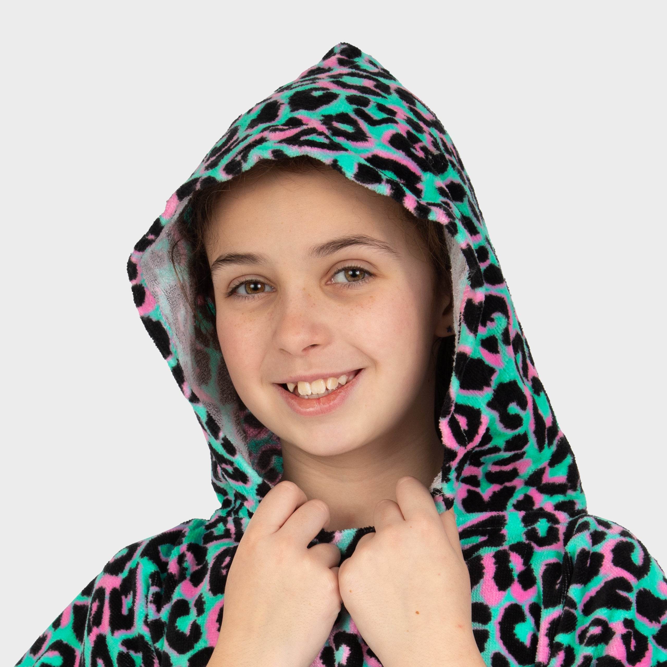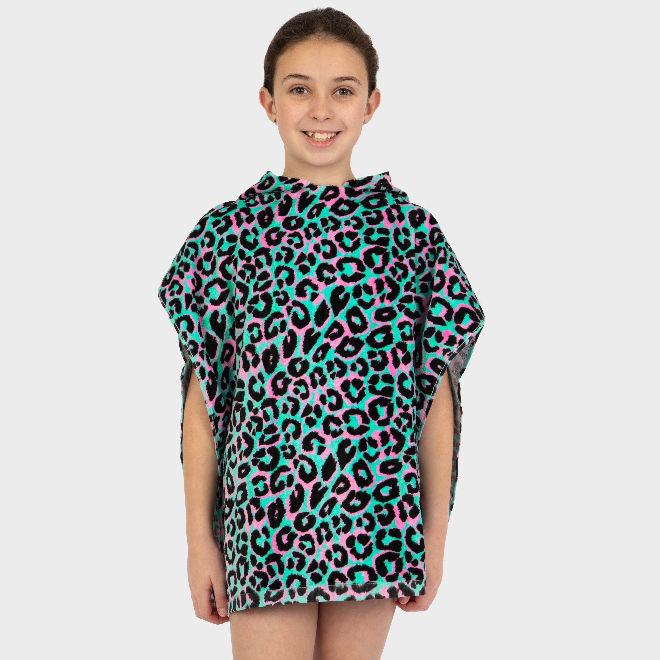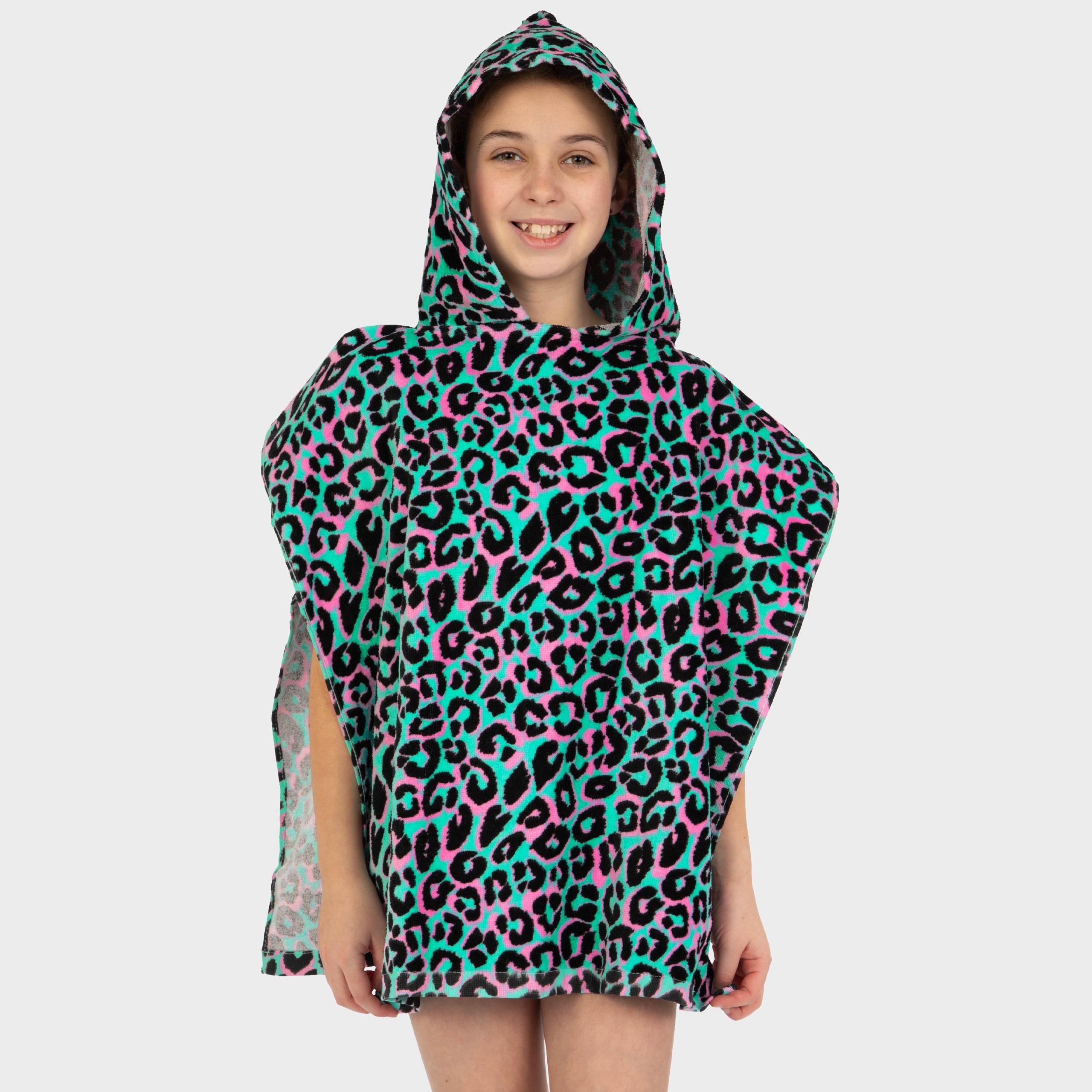 Make a splash with this girls hooded towel, designed for big adventures and cozy cuddles! Featuring a playful animal print in lively pink, green, and black, it’s a fun and functional must-have for little beachgoers. The built-in hood adds an extra layer of warmth, making it the perfect kids towel for drying off after a swim or a splashy bath. Soft, absorbent, and easy to wear, it’s the ultimate poncho towel for sandy toes and poolside giggles. Get ready for some seriously cosy towel time!