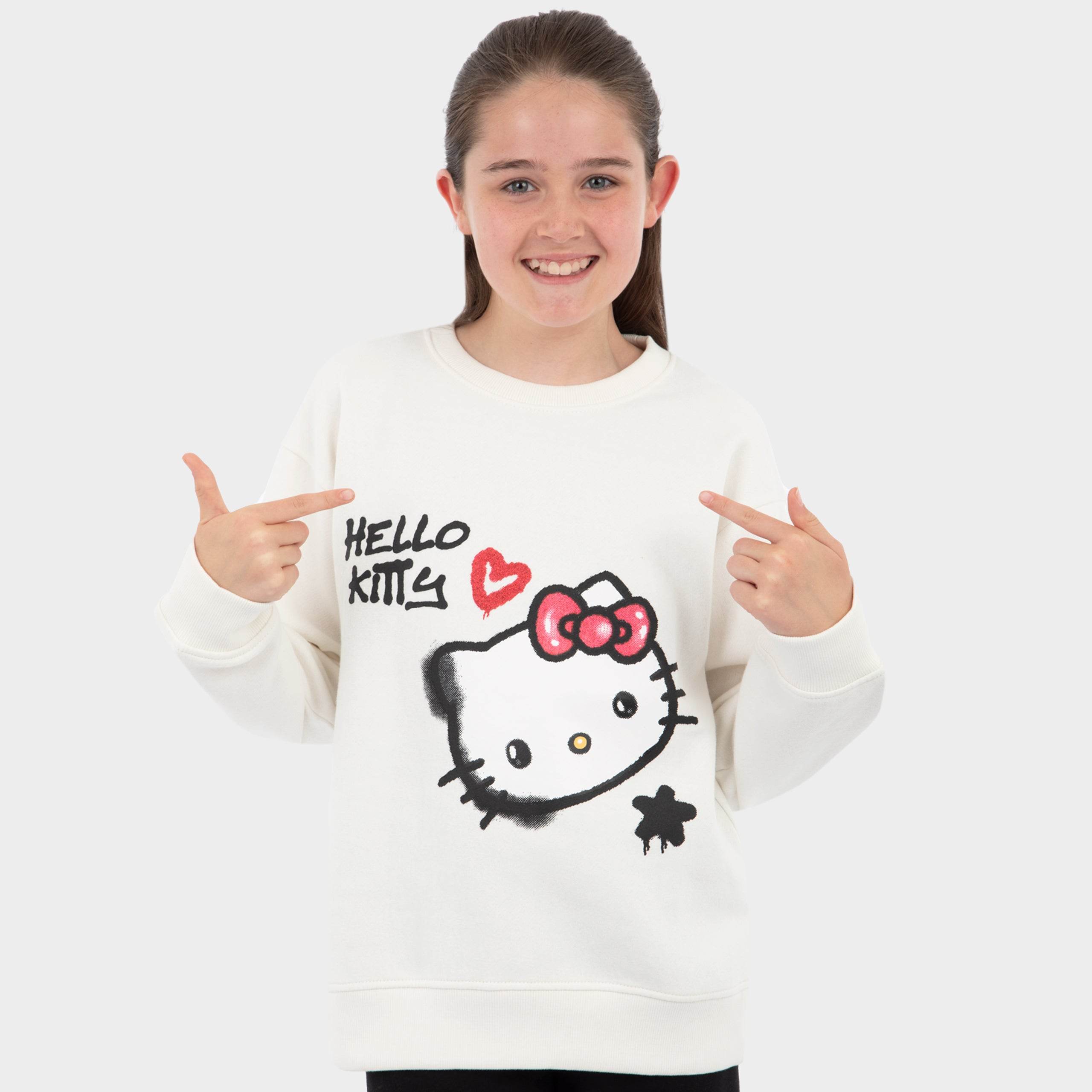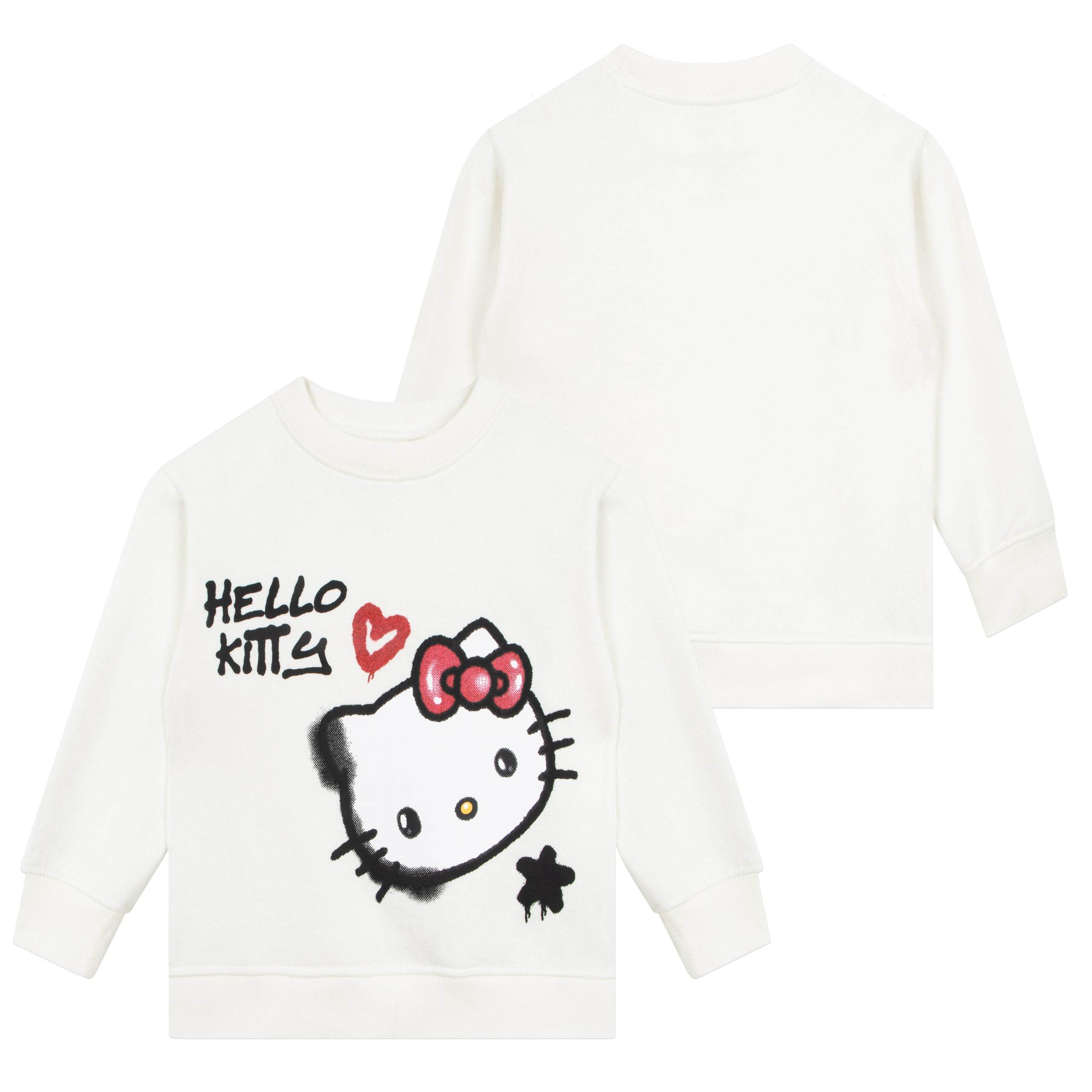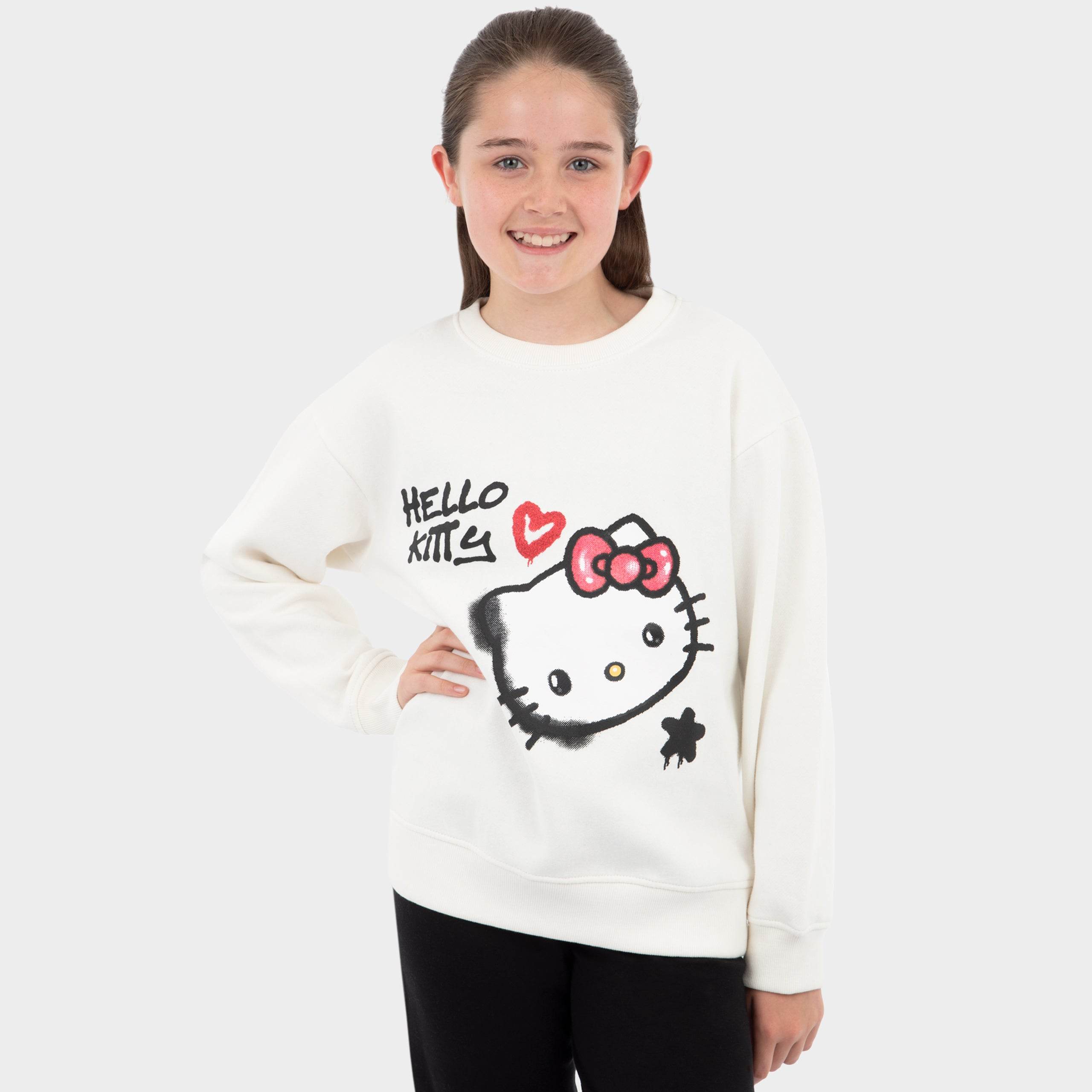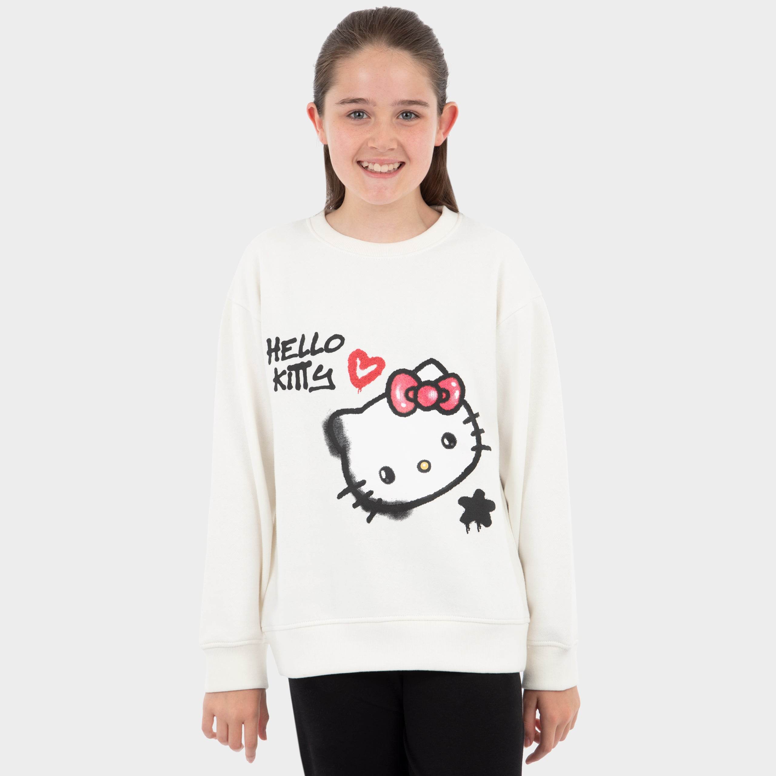 Bring Hello Kitty's whimsical charm to your little one's routine with this absolutely delightful cream girls pullover, the must have jumper for any little fan of the animated series. The playful graffiti design featuring Hello Kitty, her name and a gorgeous red heart adds an extra touch of magic to their wardrobe. Perfect for staying warm and cozy during chilly winter adventures, this Hello Kitty sweat top is a cute and stylish way for them to showcase their love for everyones favourite feline friend.