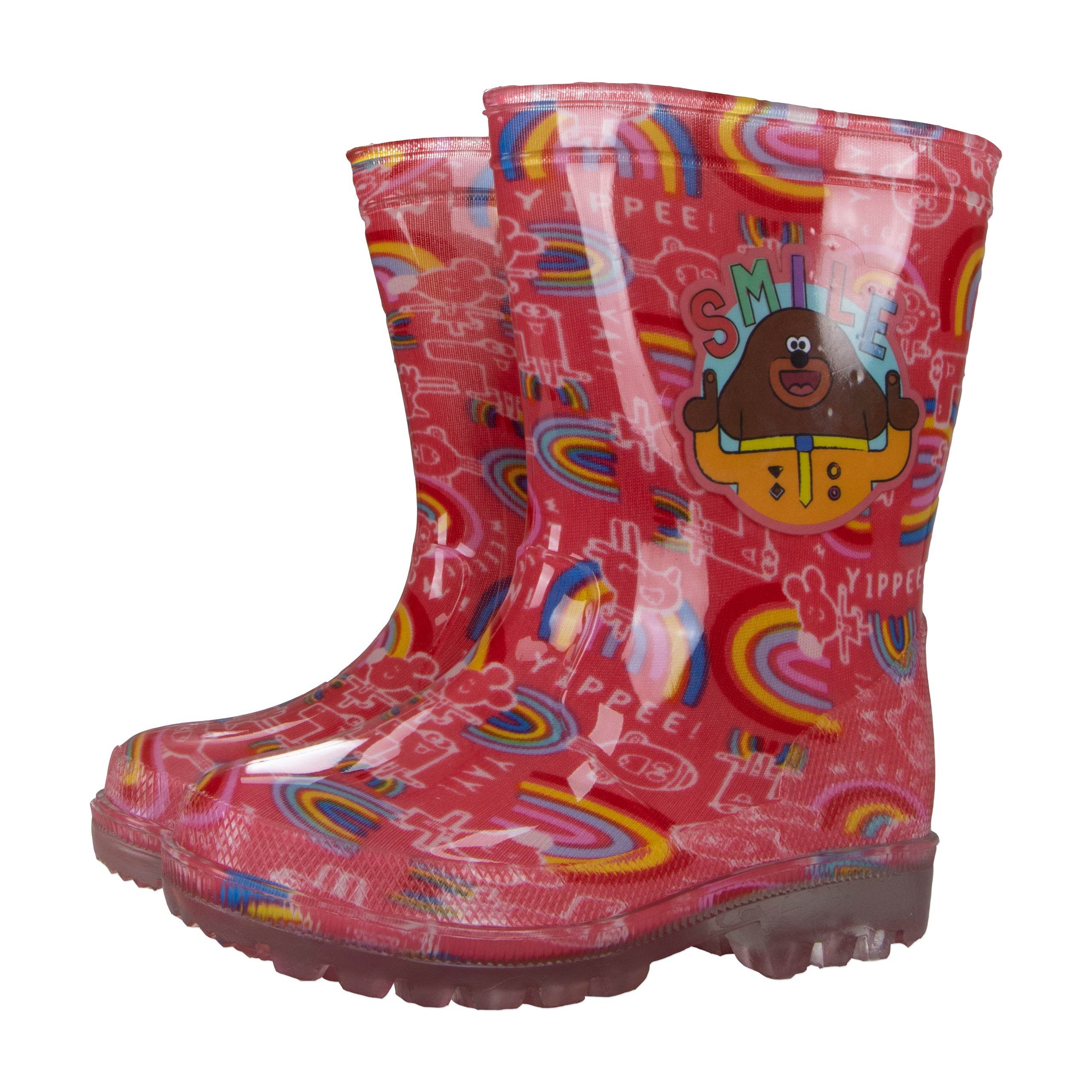 • Brighten up rainy days with Hey Duggee Wellies for girls: These vibrant pink boots feature clear soles and are adorned with cheerful rainbows and a joyful "Yippee!" pattern.