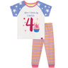Get ready to start the birthday celebrations with these adorable 'I am 4' pyjamas! Designed by Harry Bear, this pj set features a 'When I wake up I will be' print with a glittery number 4 and a birthday cupcake! Complete with light blue sleeves and white stars. Paired with multicoloured stripey pj bottoms with an elasticated waistband. These jammies are perfect to get the birthday celebrations started. Finished with a hand-tied ribbon to make the perfect gift!