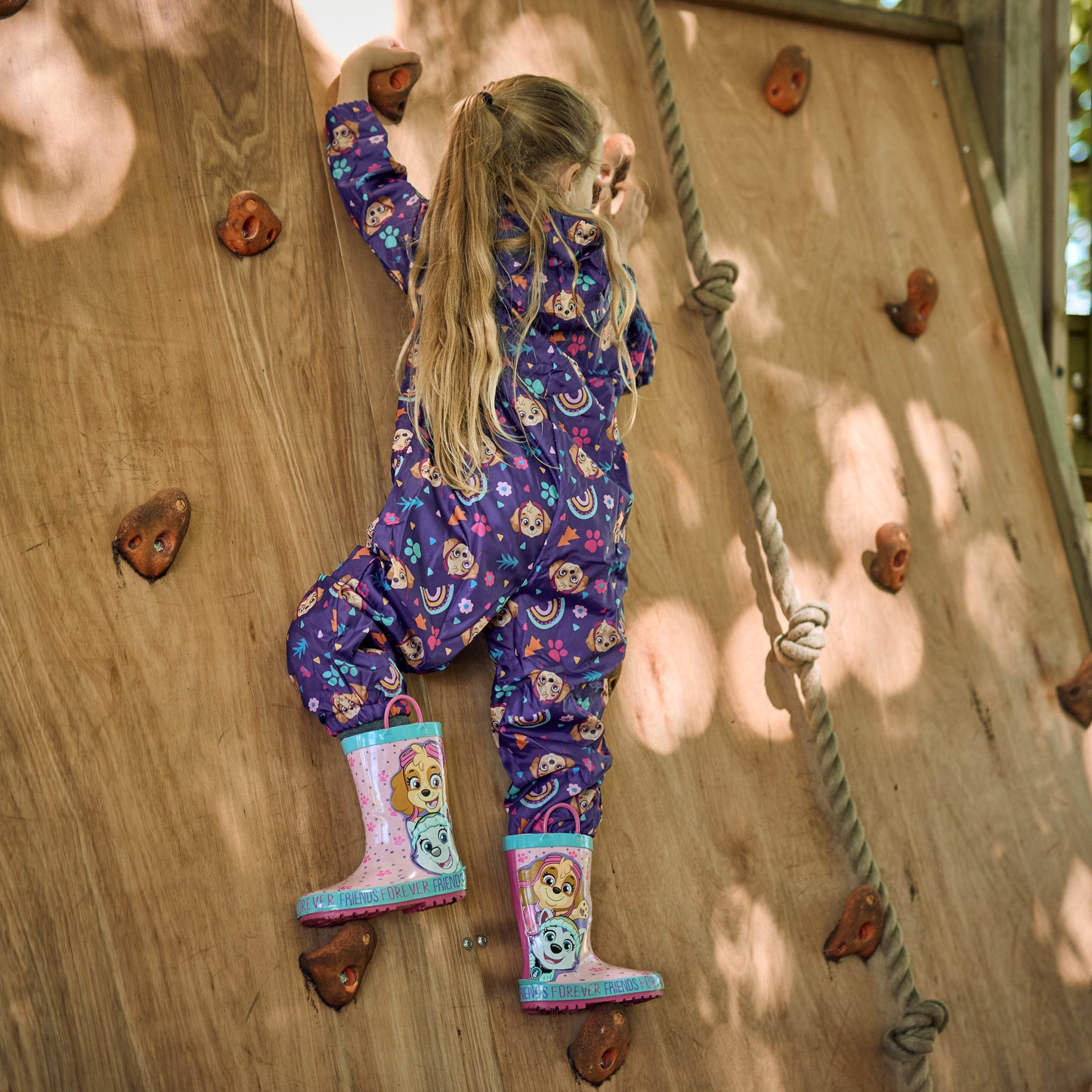 This pup's gotta fly! Your little patroller can take to the skies with Skye even in rainy weather with this adorable Paw Patrol puddle suit! This purple hooded all-in-one features an all-over print of Skye with trees, flowers, paw prints and rainbows and has a zip fastening and elasticated cuffs to keep your pup dry on their missions. The hood and super soft fleece lining will keep them cosy and warm no matter the weather! They'll be ready to take to the skies with Skye and friends in this adorable Paw Patrol rainwear!