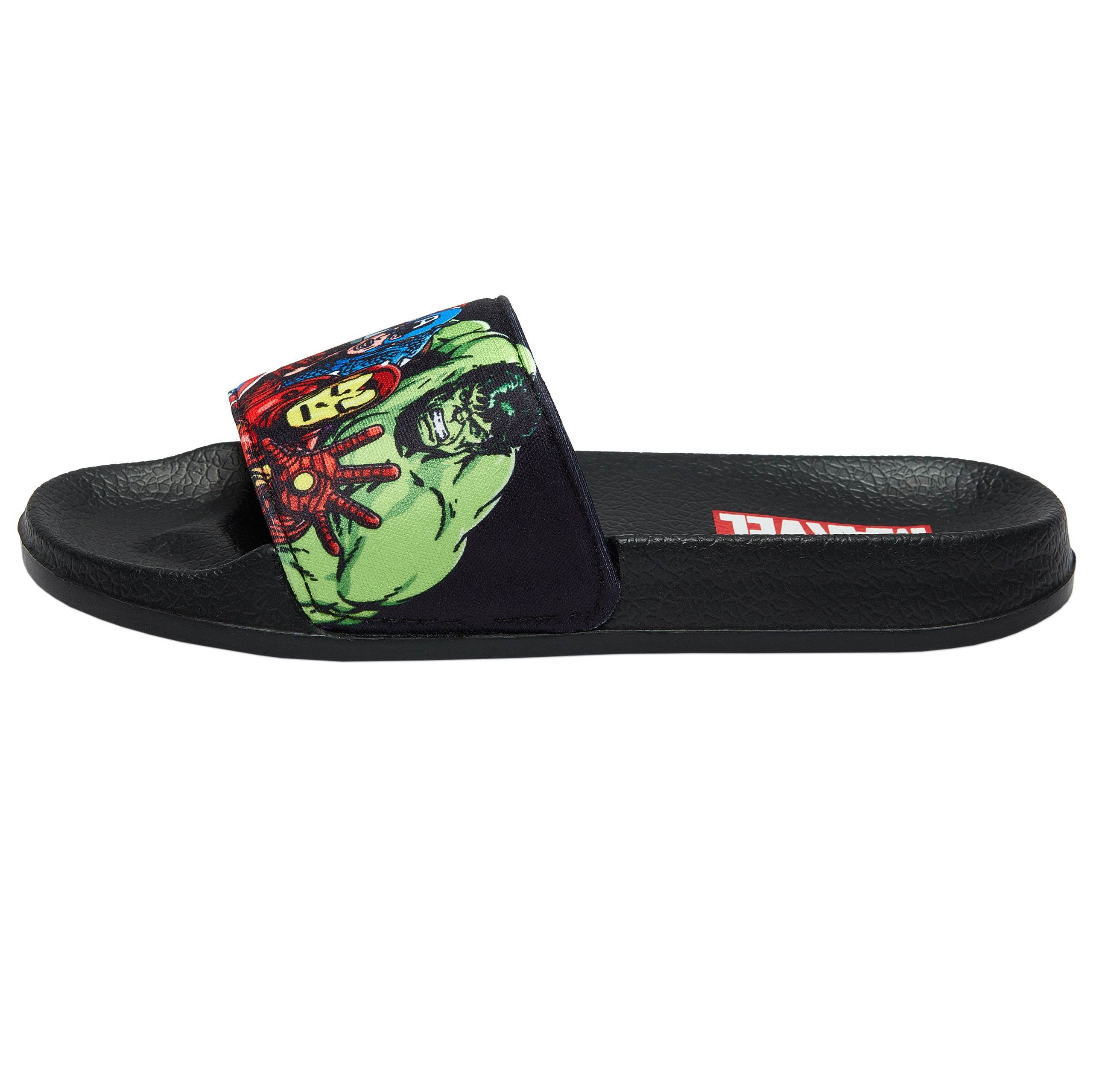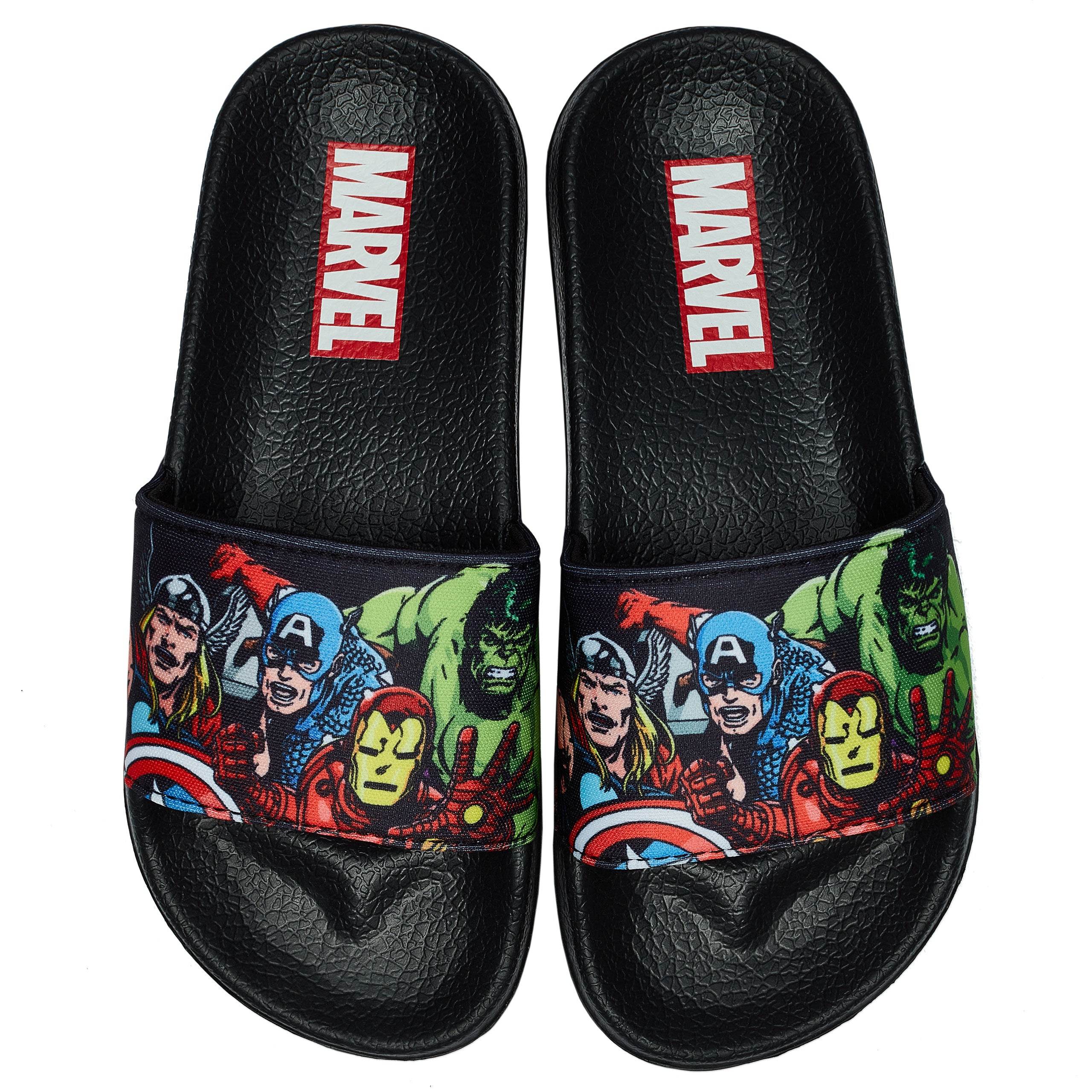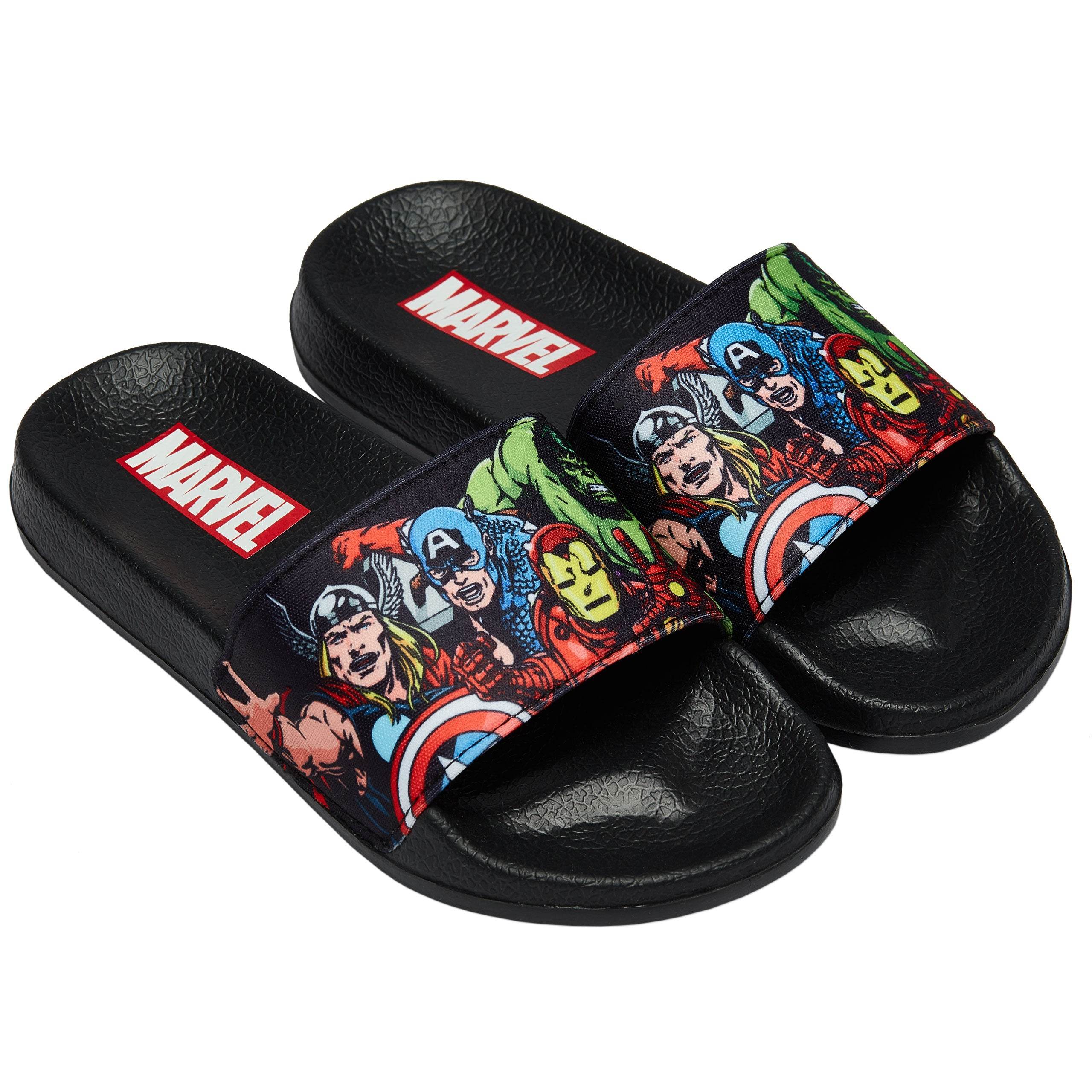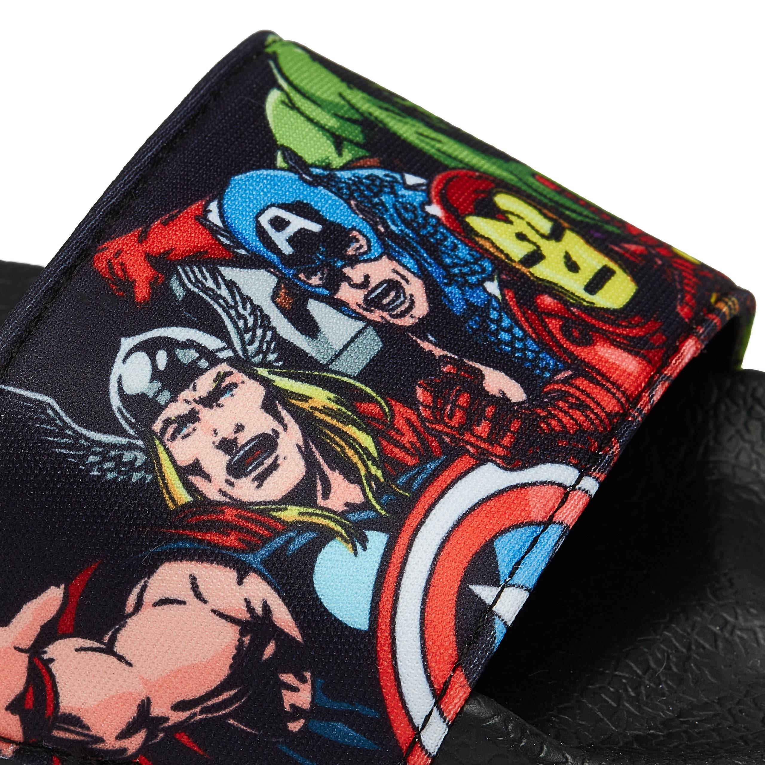 These boys' Marvel sliders bring the excitement of the Avengers right to your little one's feet! Featuring a vibrant design with Thor, Hulk, Captain America, and Iron-Man, these Avengers sandals capture the essence of the original Marvel comics. The comfortable black inner sole showcases the Marvel logo in bold red and white, making these shoes not just fun but also stylish. Perfect for any young Marvel fan, they're ideal for beach days, poolside adventures, or simply lounging at home in superhero style.