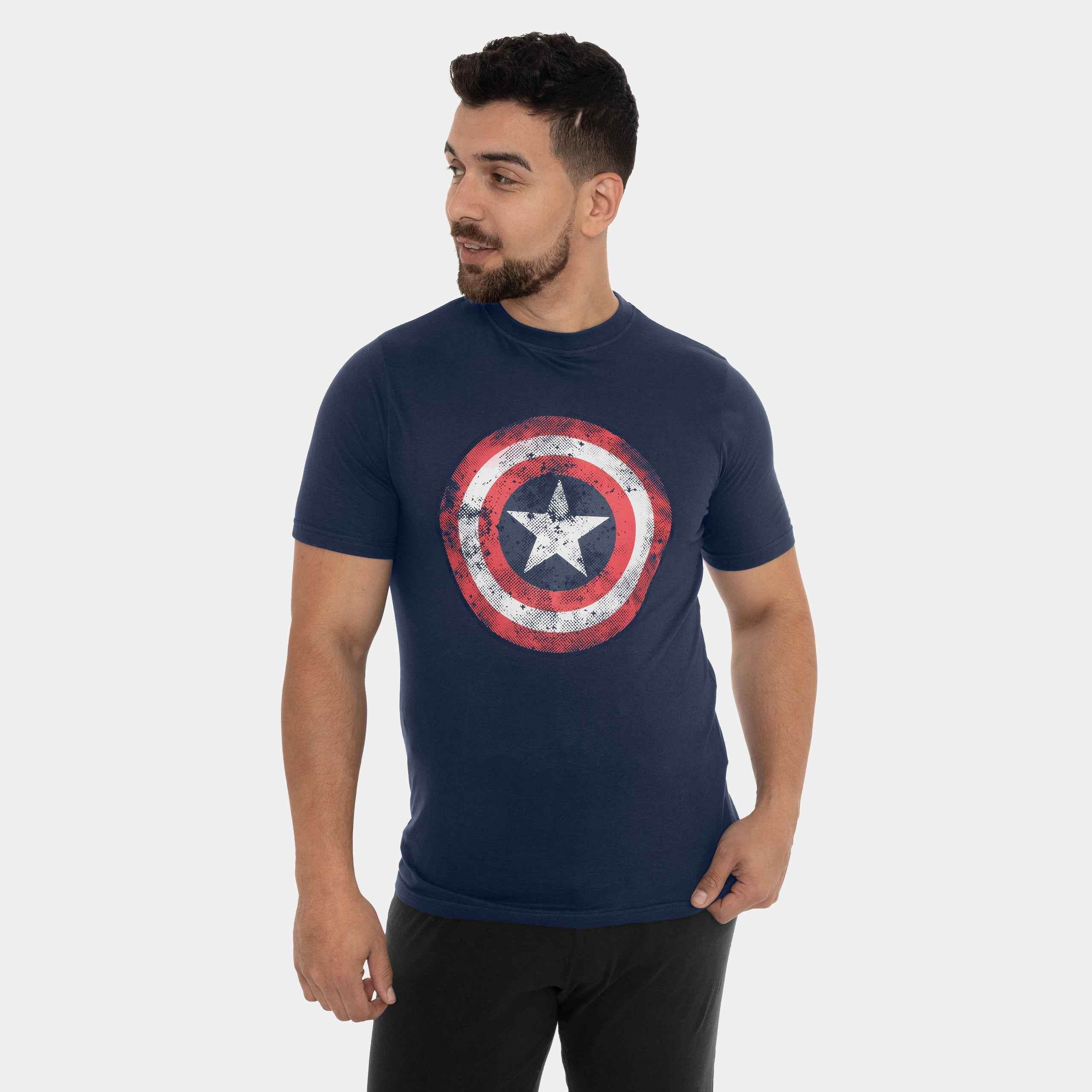 In World War II, patriotic soldier Steve Rogers became the living symbol of freedom and served the world as leader of The Avengers. Recreate the star-spangled heros look with our navy Captain America Shield tee. The comfortable cotton top features the mighty shield graphic on the front, a crew neck and short sleeves, making it perfect for weekends! Wear with jeans and trainers for an outfit that's effortlessly cool - just like Captain America!