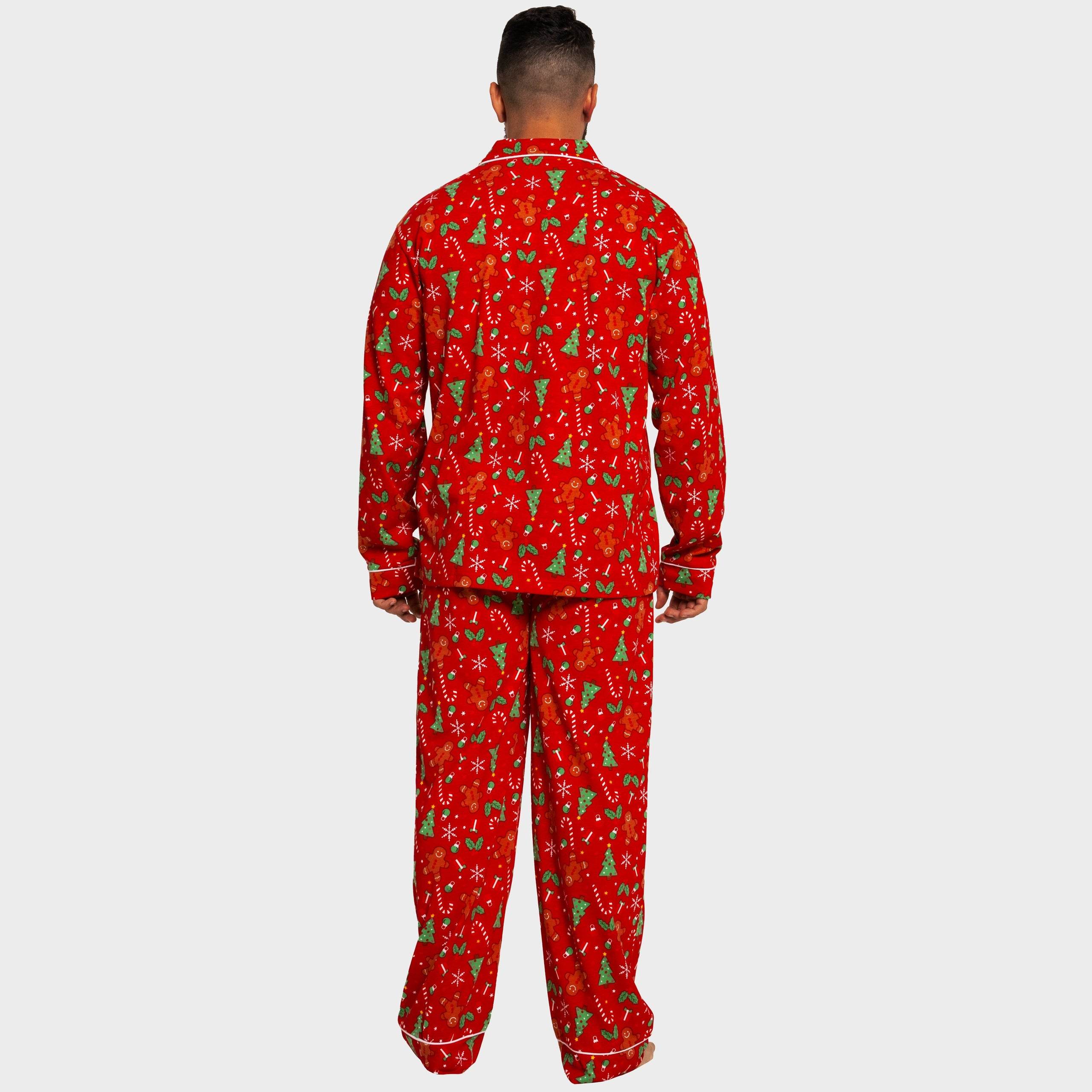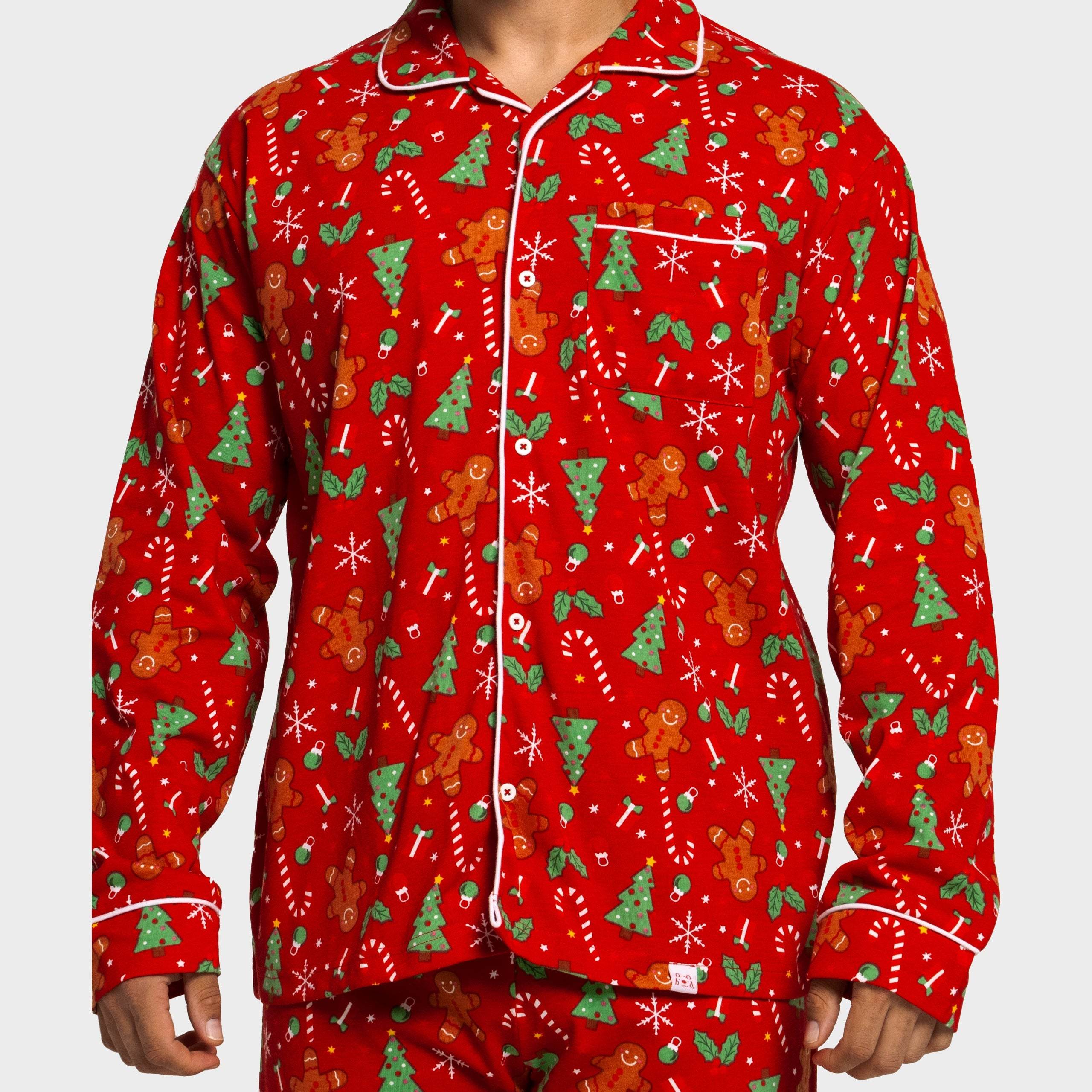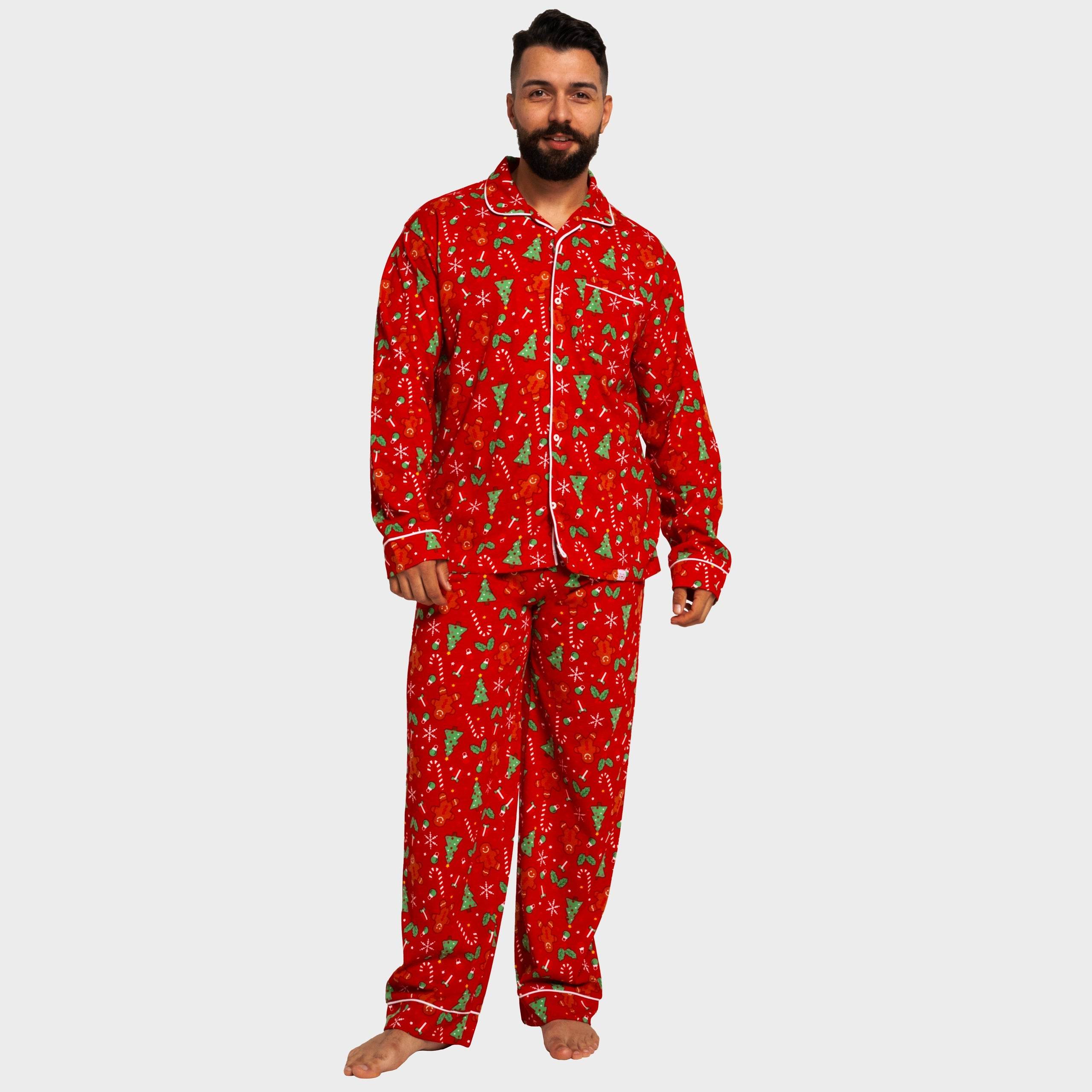 Get ready to sleigh the holiday season with these adorable mens Christmas pyjamas! Covered in a jolly mix of gingerbread men, Christmas trees, candy canes, and snowflakes, these PJs bring the festive spirit to bedtime. The button-up top adds a classic touch, making them perfect for lounging in style. Plus, the whole family can get in on the fun with matching sets!