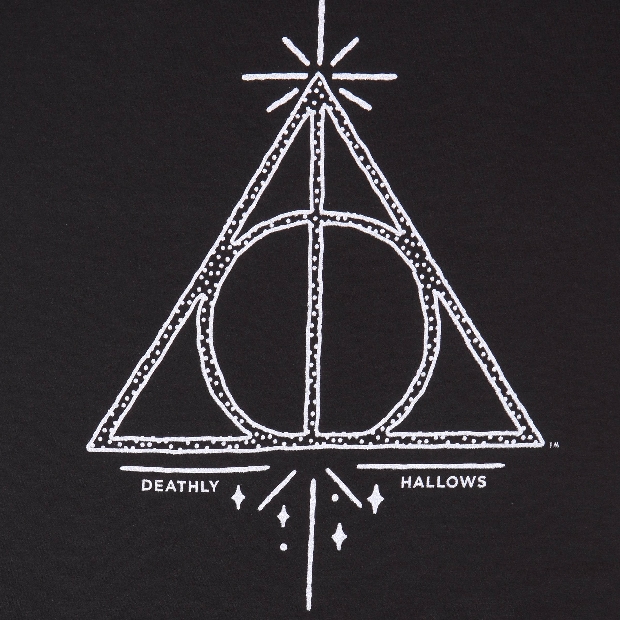 • Magical Harry Potter Menswear: Get your wizard on with this black, short-sleeved Harry Potter tee featuring the white iconic Deathly Hallows symbol.