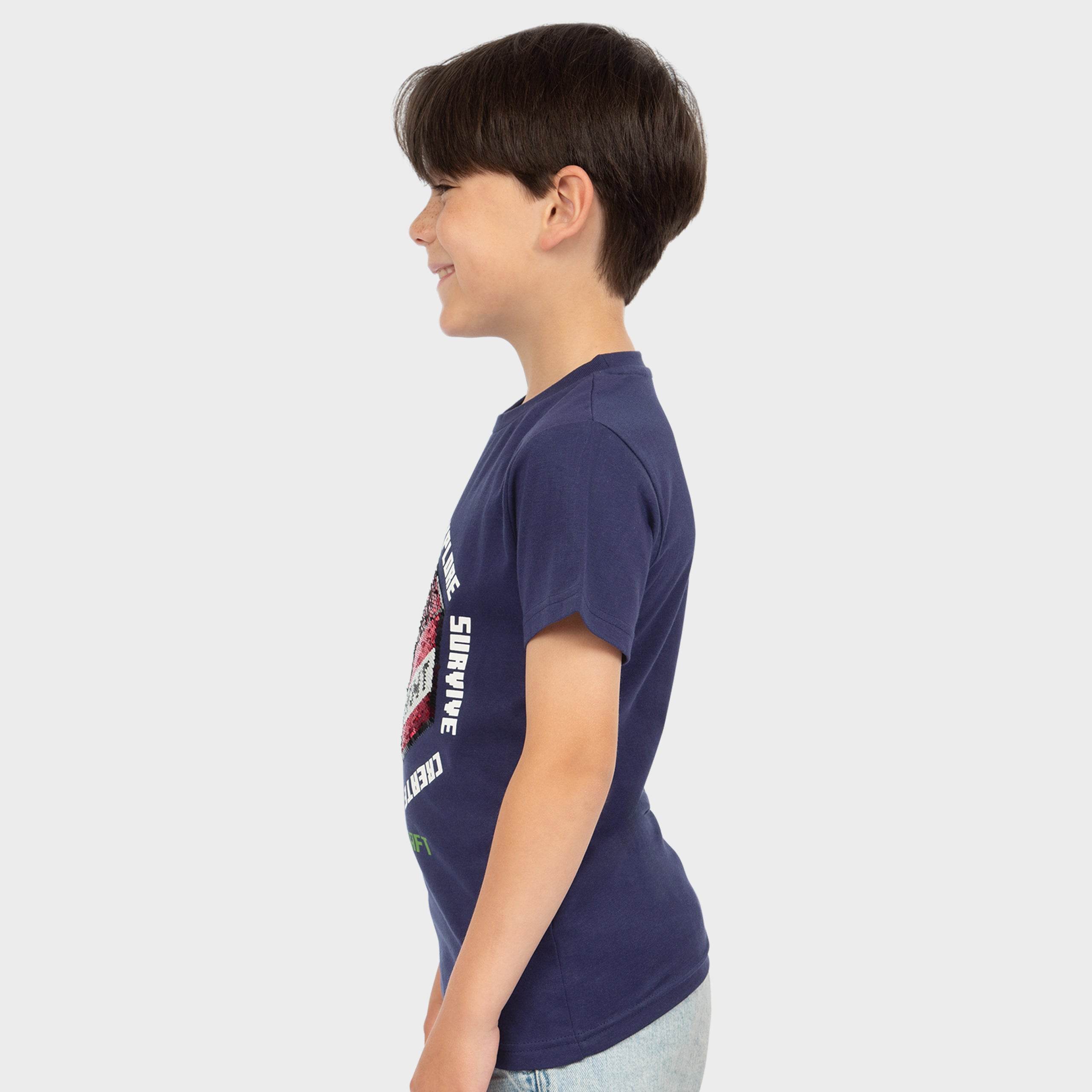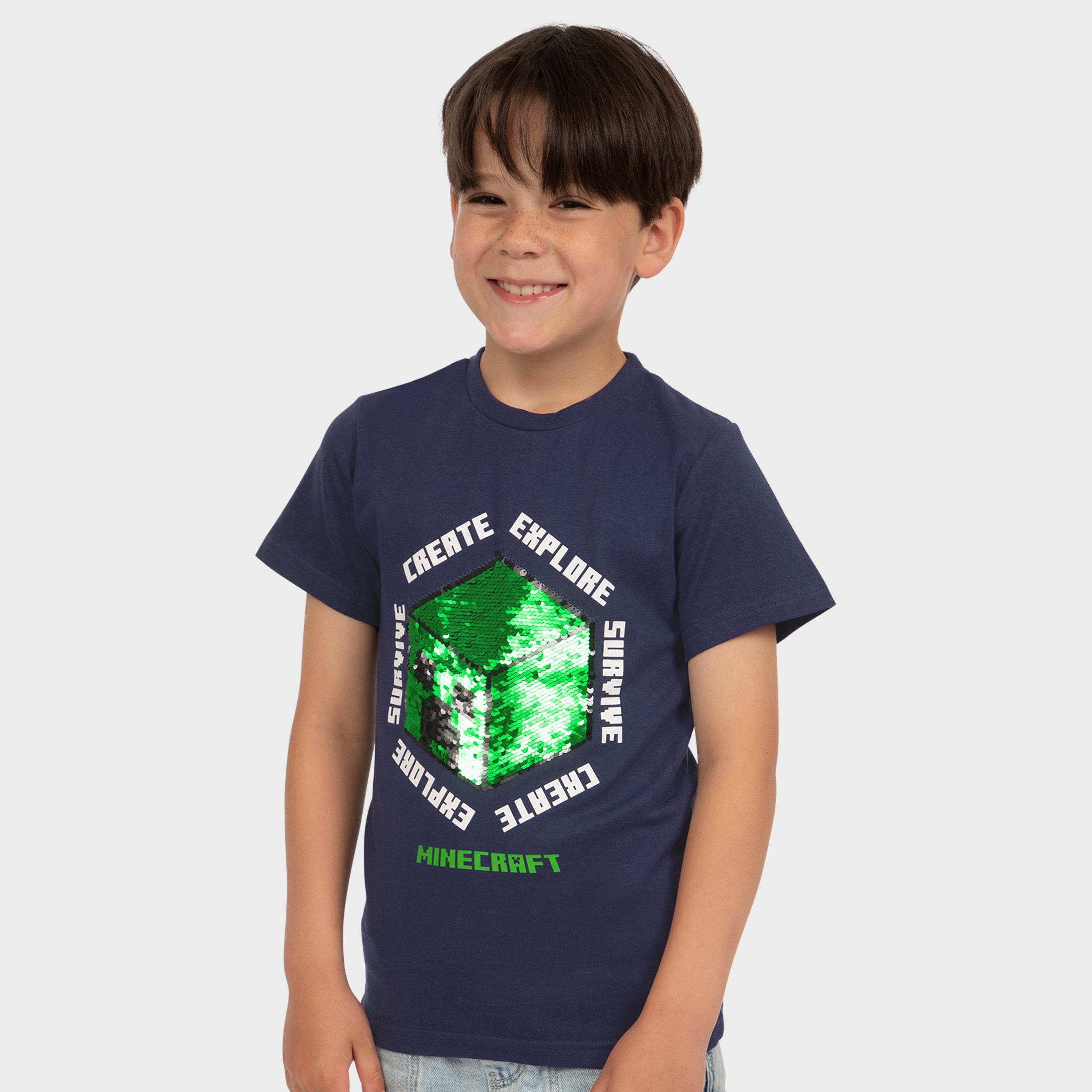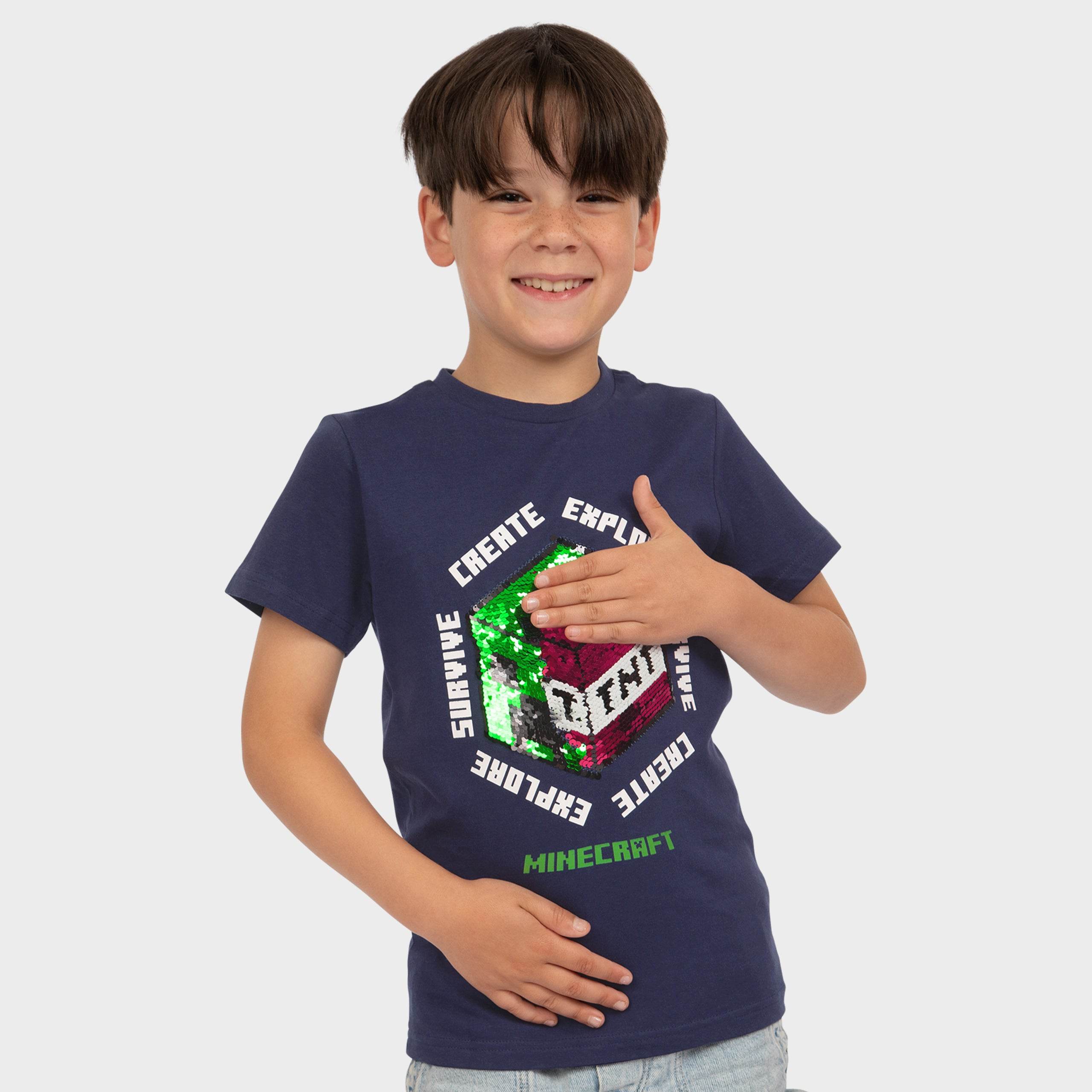 When Minecraft is life, you play in survival mode! This awesome navy top showcases a creeper graphic in reversible green and red sequins surrounded by the slogan 'Create Explore Survive'. Complete with the iconic Minecraft logo and a trendy back neck tape in contrast green, your creative crafter will surely 'dig' this Minecraft tee!