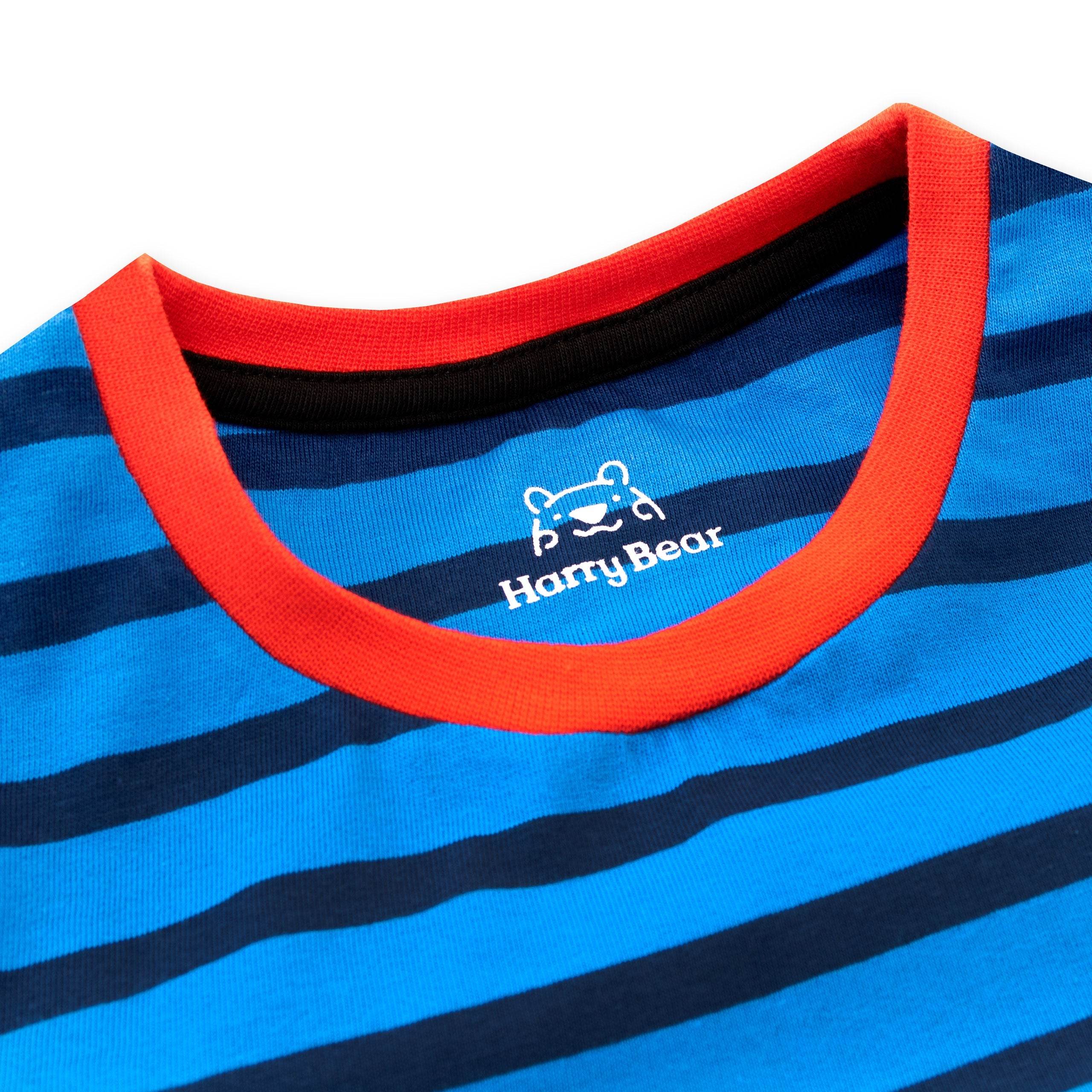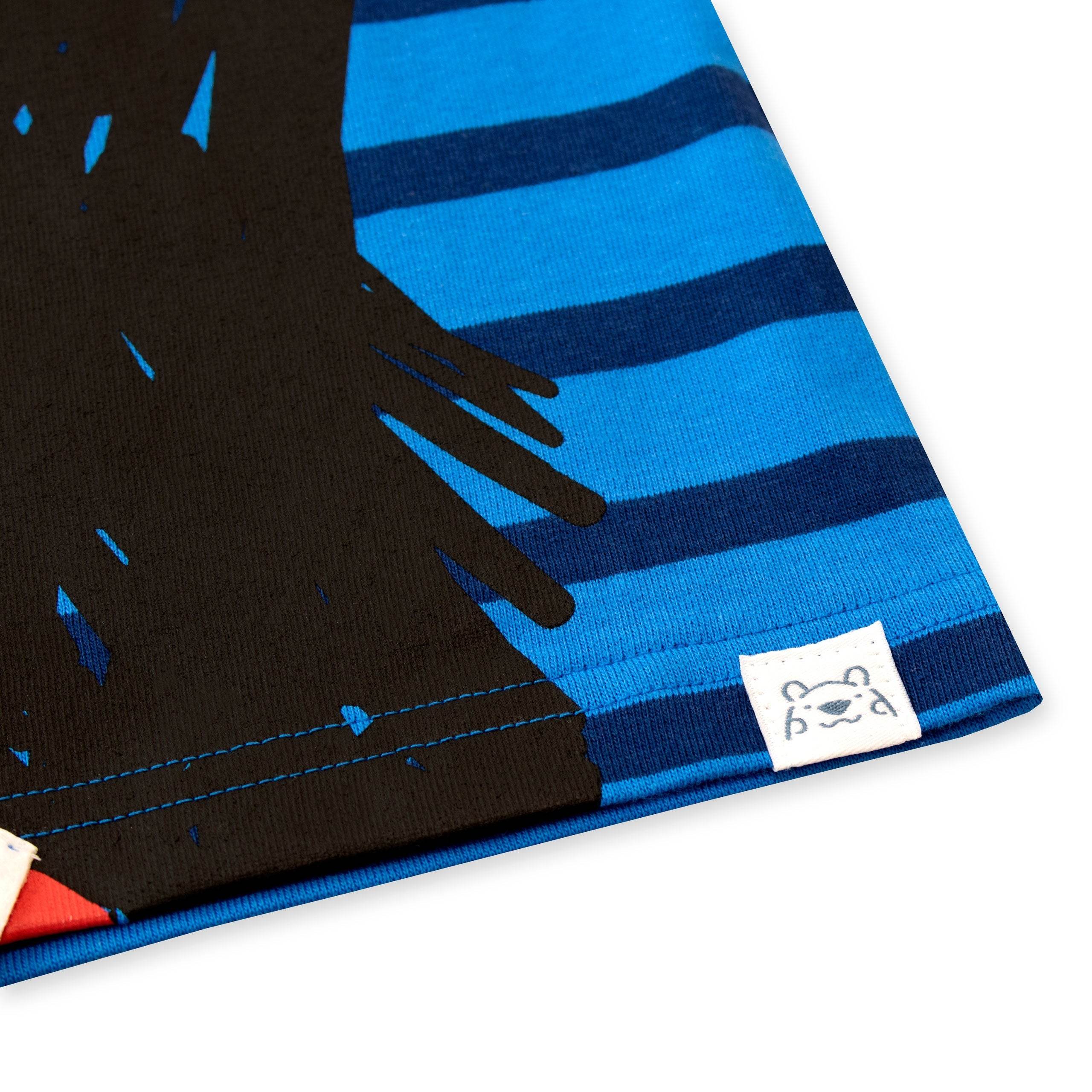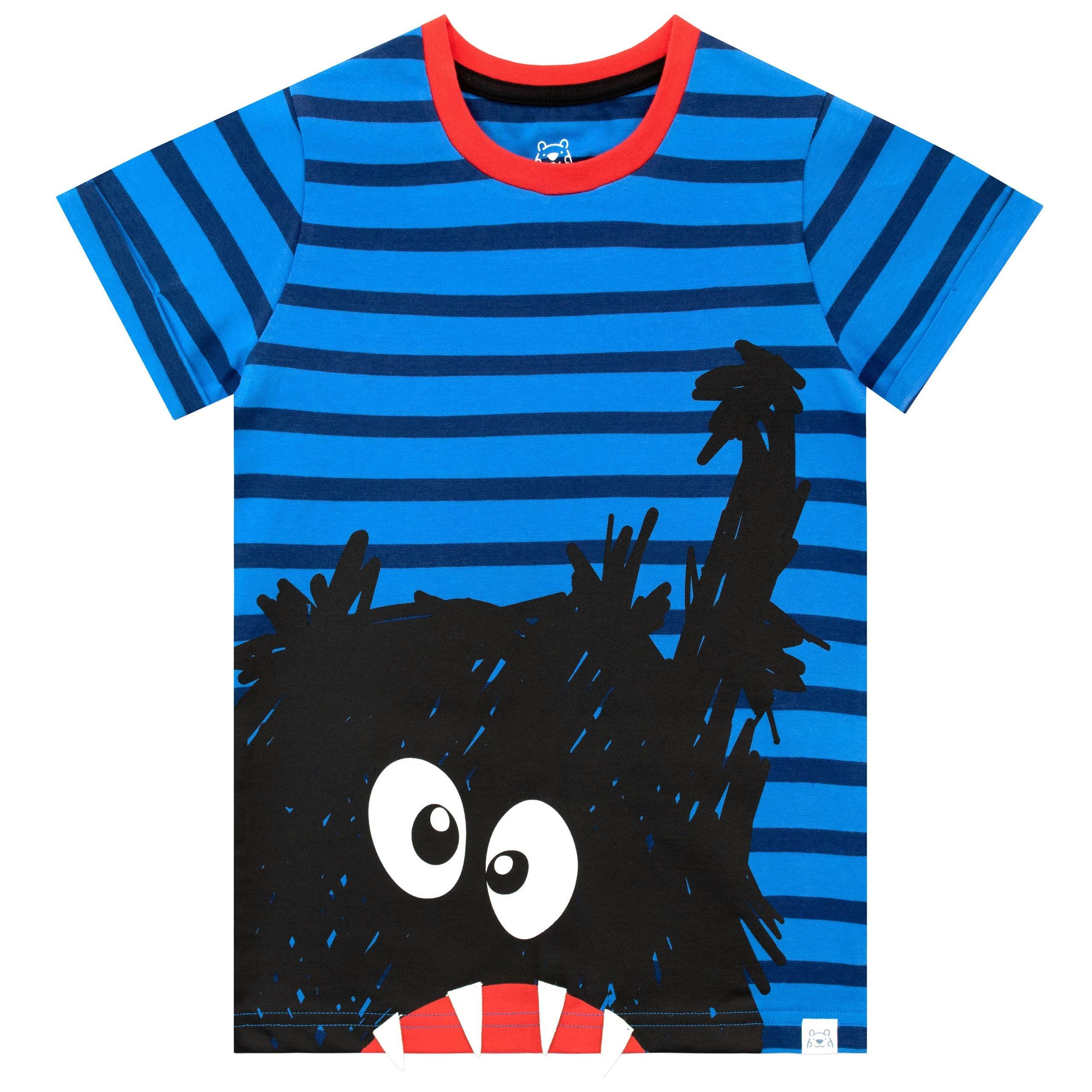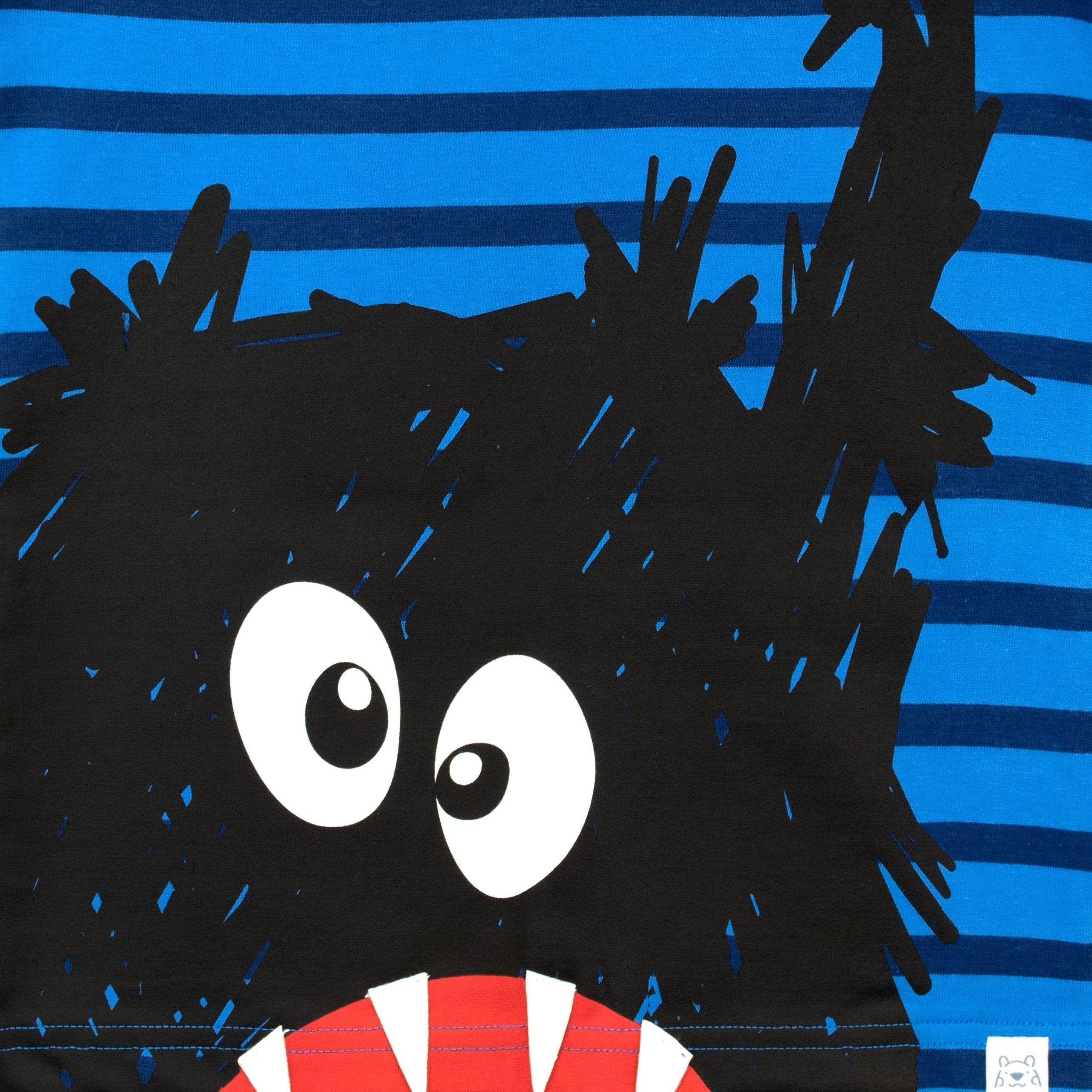 Things that go bump in the night will be doing the monster mash in this cool T-Shirt! Designed by Harry Bear, this striped t-shirt in shades of blue showcases a large print of a hairy black monster with 3D felt teeth! Detailed with rolled sleeves and red contrast collar this cool tee is perfect for little monsters! Crafted in super-soft stretchy cotton for comfort this monster top will surely be a favourite of any ghoul! Finished with hand-tied ribbon to make the perfect gift!