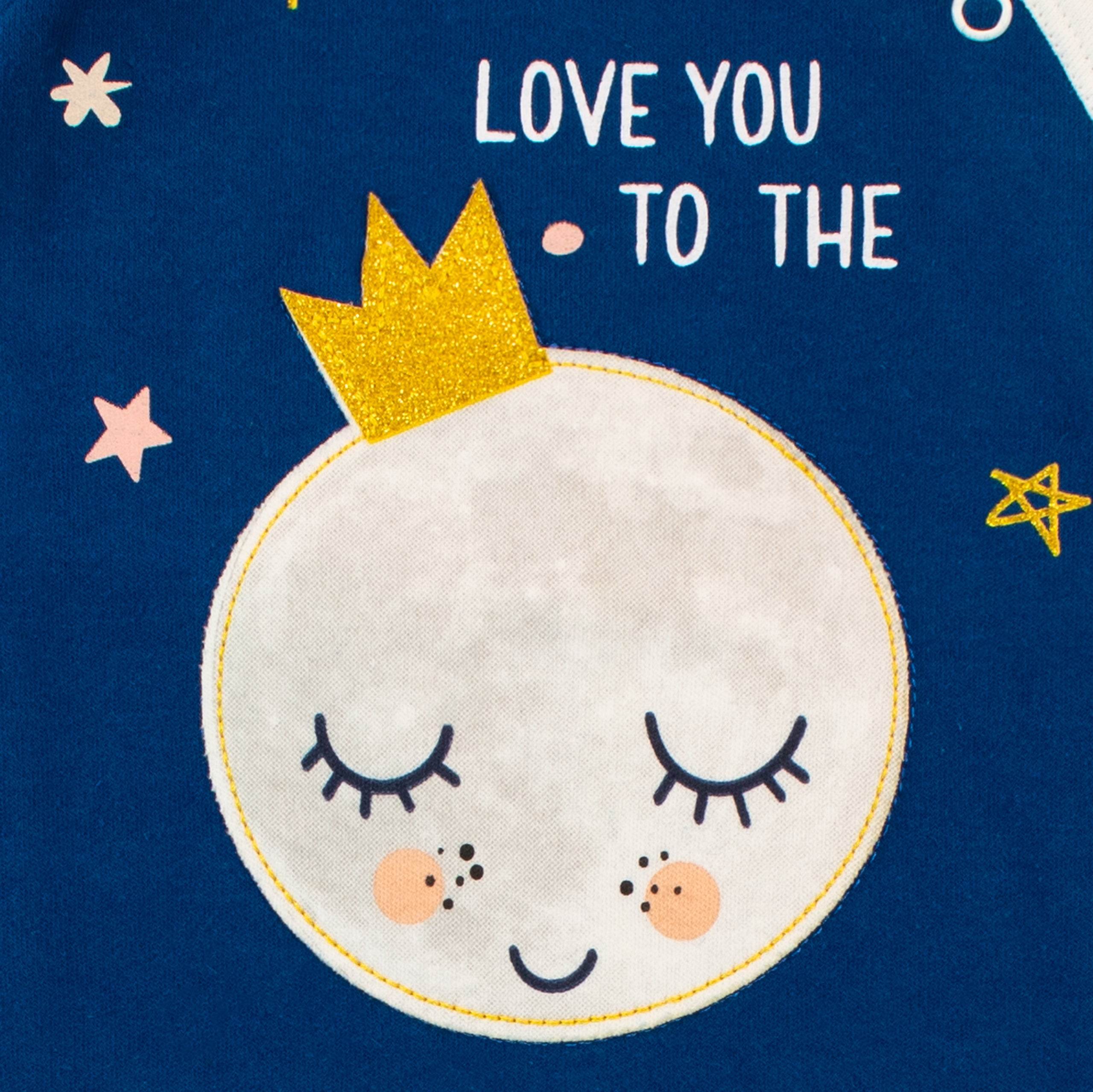 Let your sleepy star know just how much you love them with this adorable moon onesie! Designed by Harry Bear, this navy cotton baby grow showcases a sleeping moon with a gold glitter crown and the slogan 'Love You to the Moon and Back', with white cuffs for added cosiness and fastened with poppers. With the moon watching over them, your baby is sure to have the sweetest dreams in this cute all-in-one!