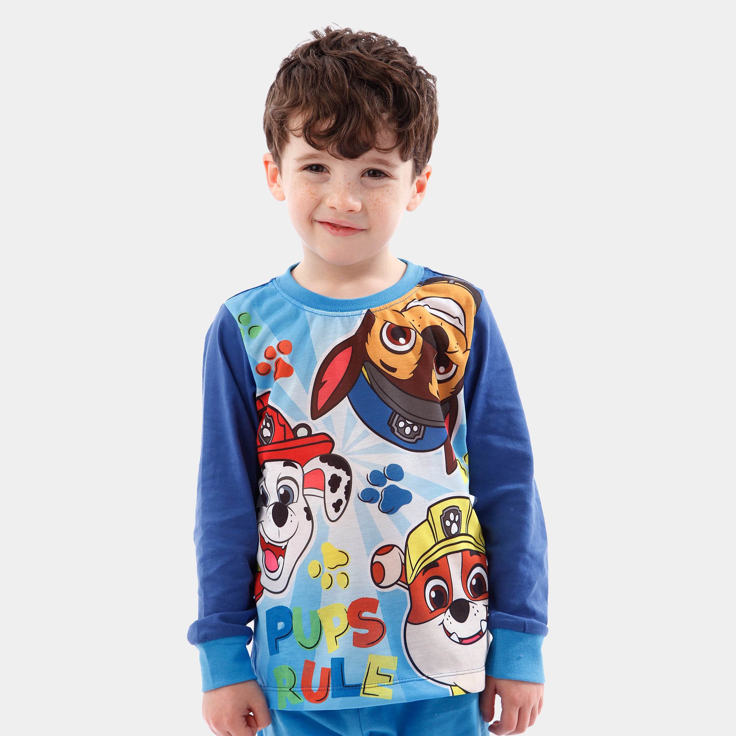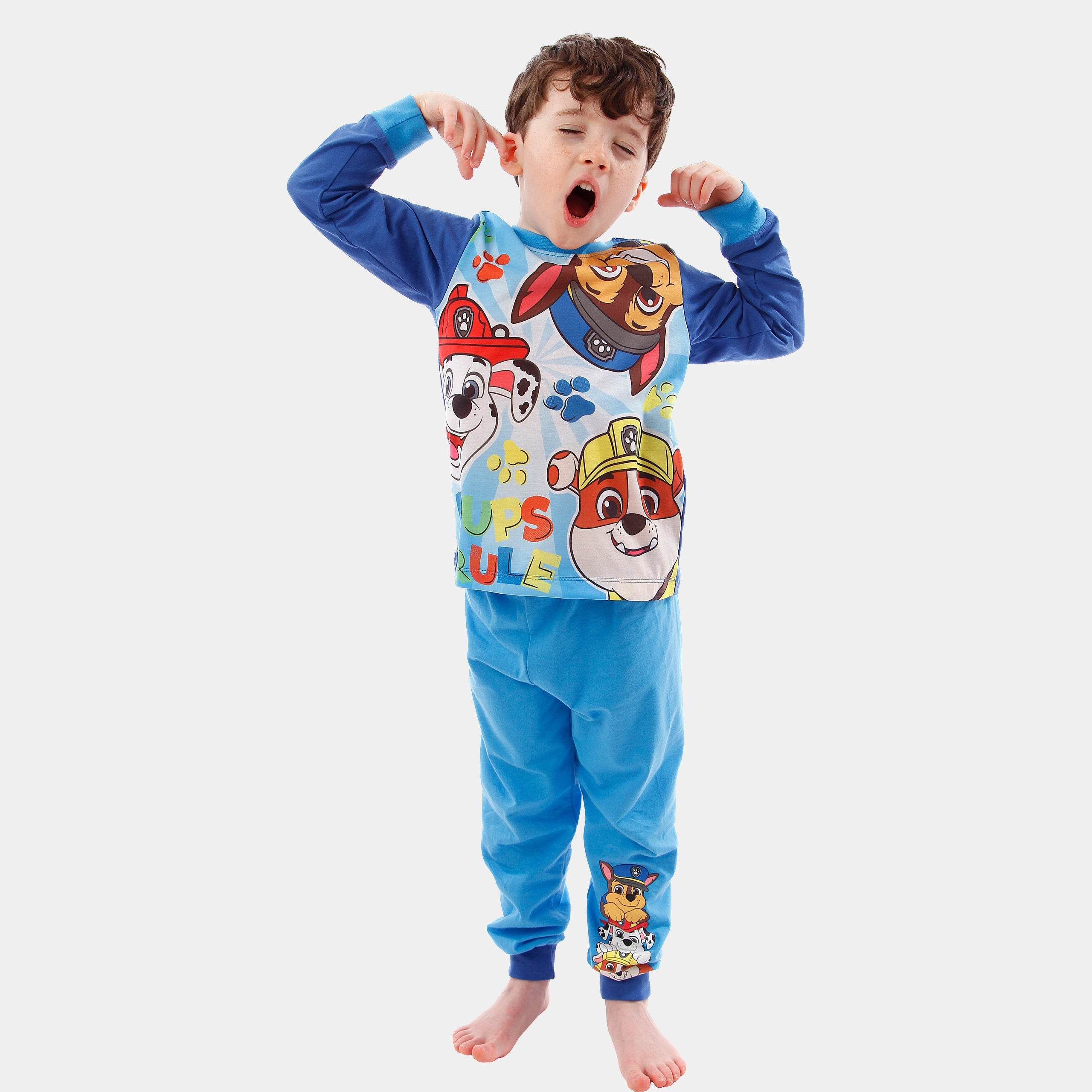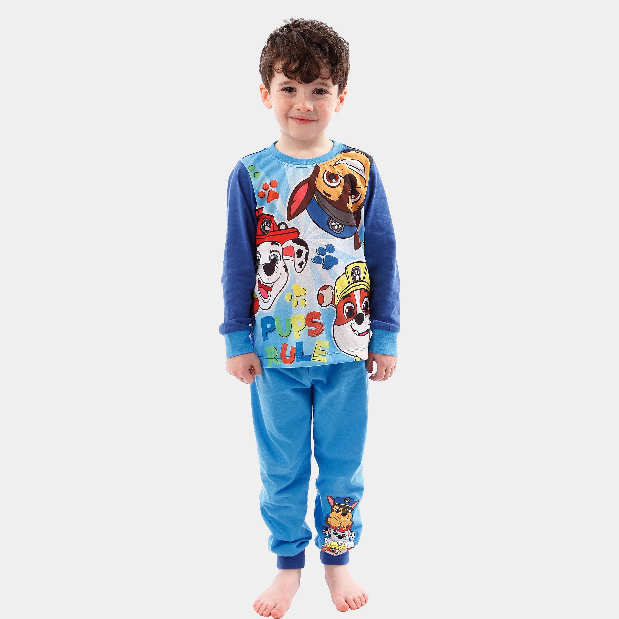 • PJ set showcasing Chase, Marshall, and Rubble with "Pups Rule" multicolour writing and multicolour paw prints on the pyjama top.