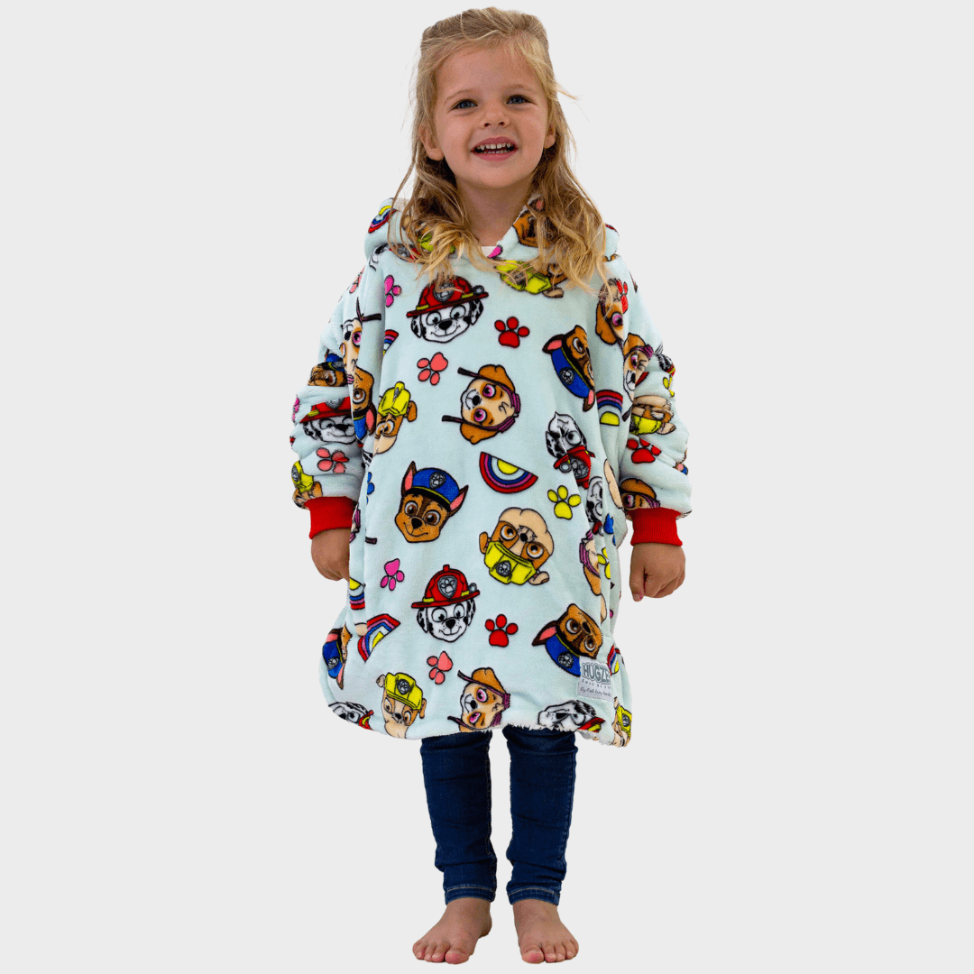 Your little Pups will be super comfy in this Paw Patrol fleece blanket hoodie. Featuring an all over motif of Rubble, Sky, Chase and Marshall along with rainbows and multicolour paw prints. Complete with a hood and large front pocket this lounge hoodie goes great with our range of paw patrol PJs!