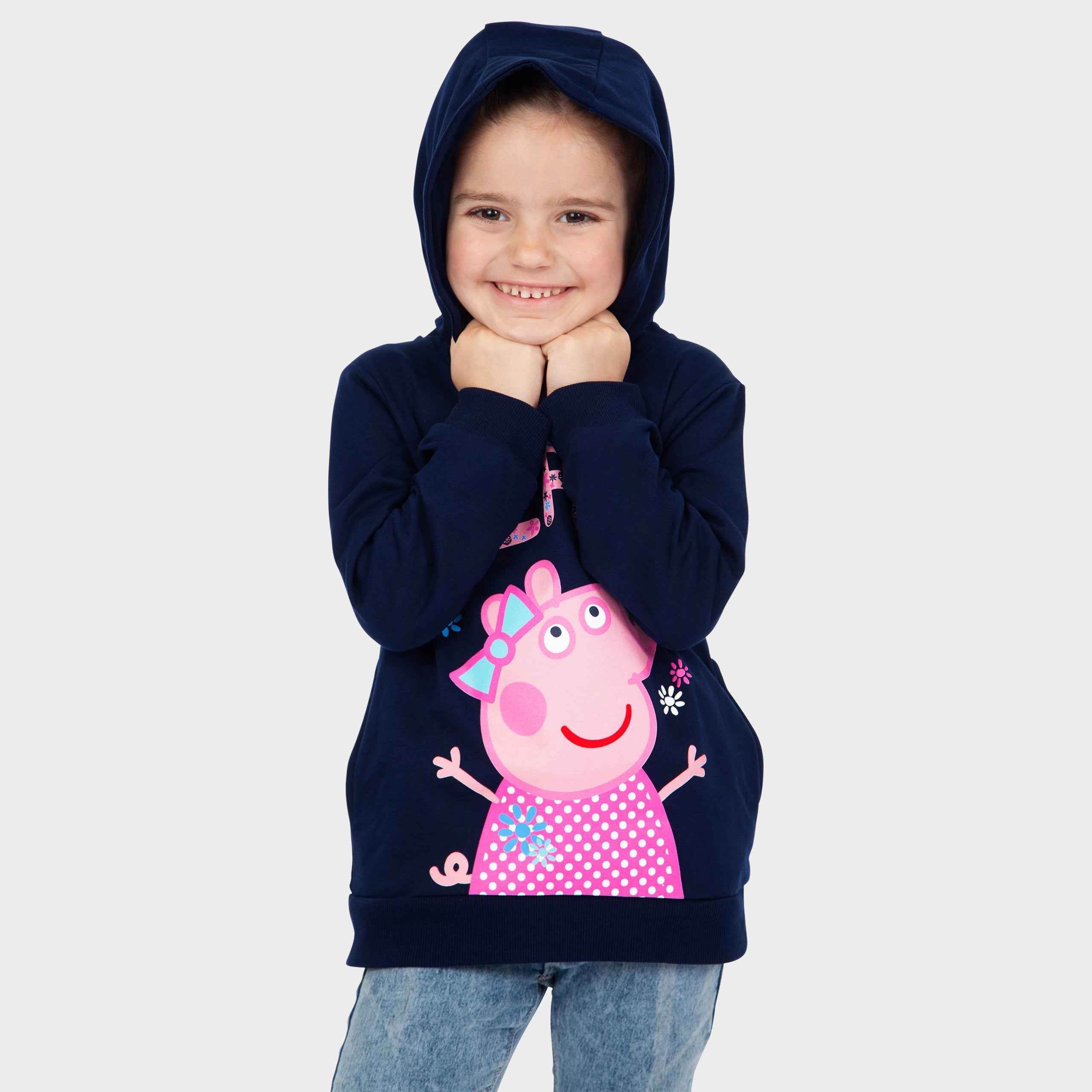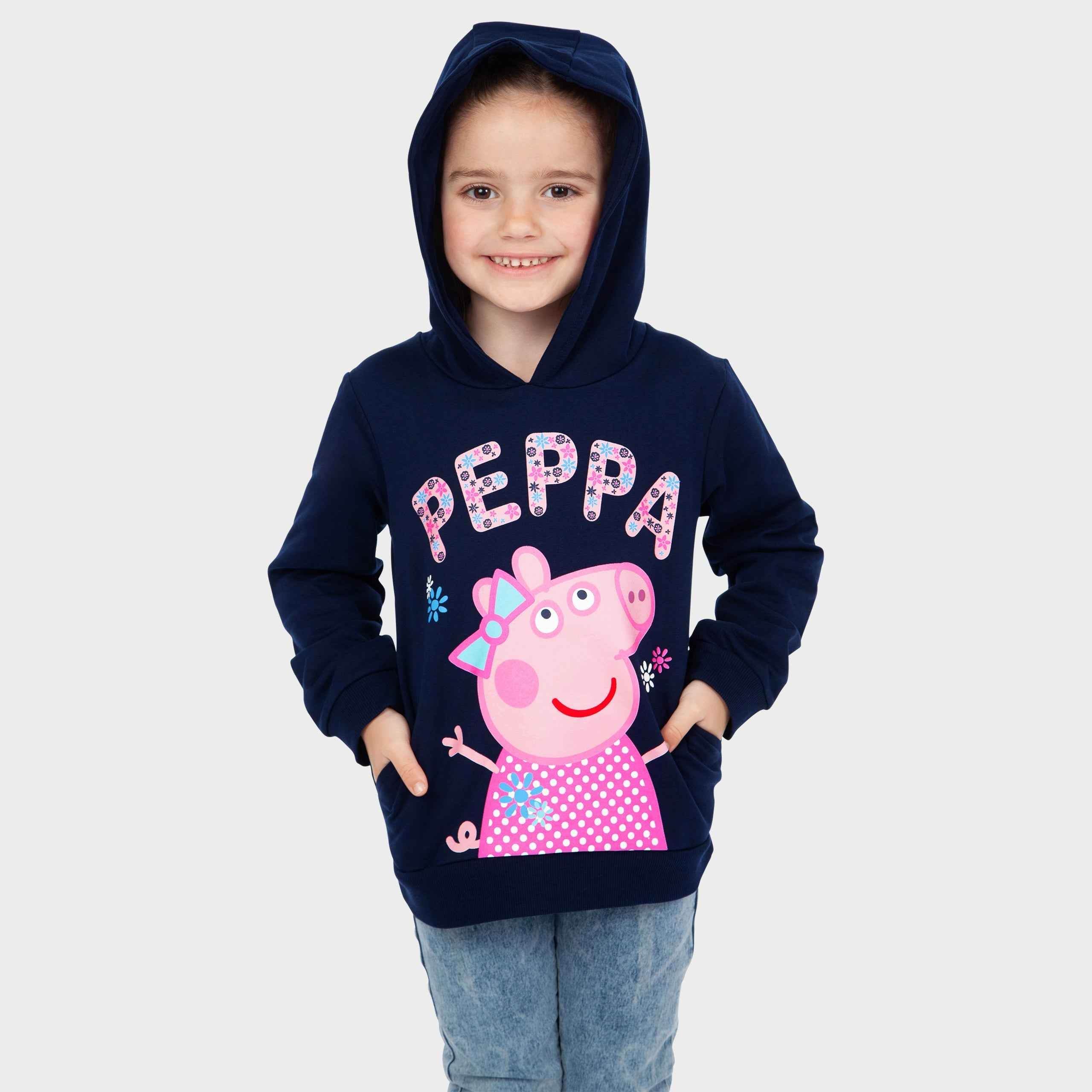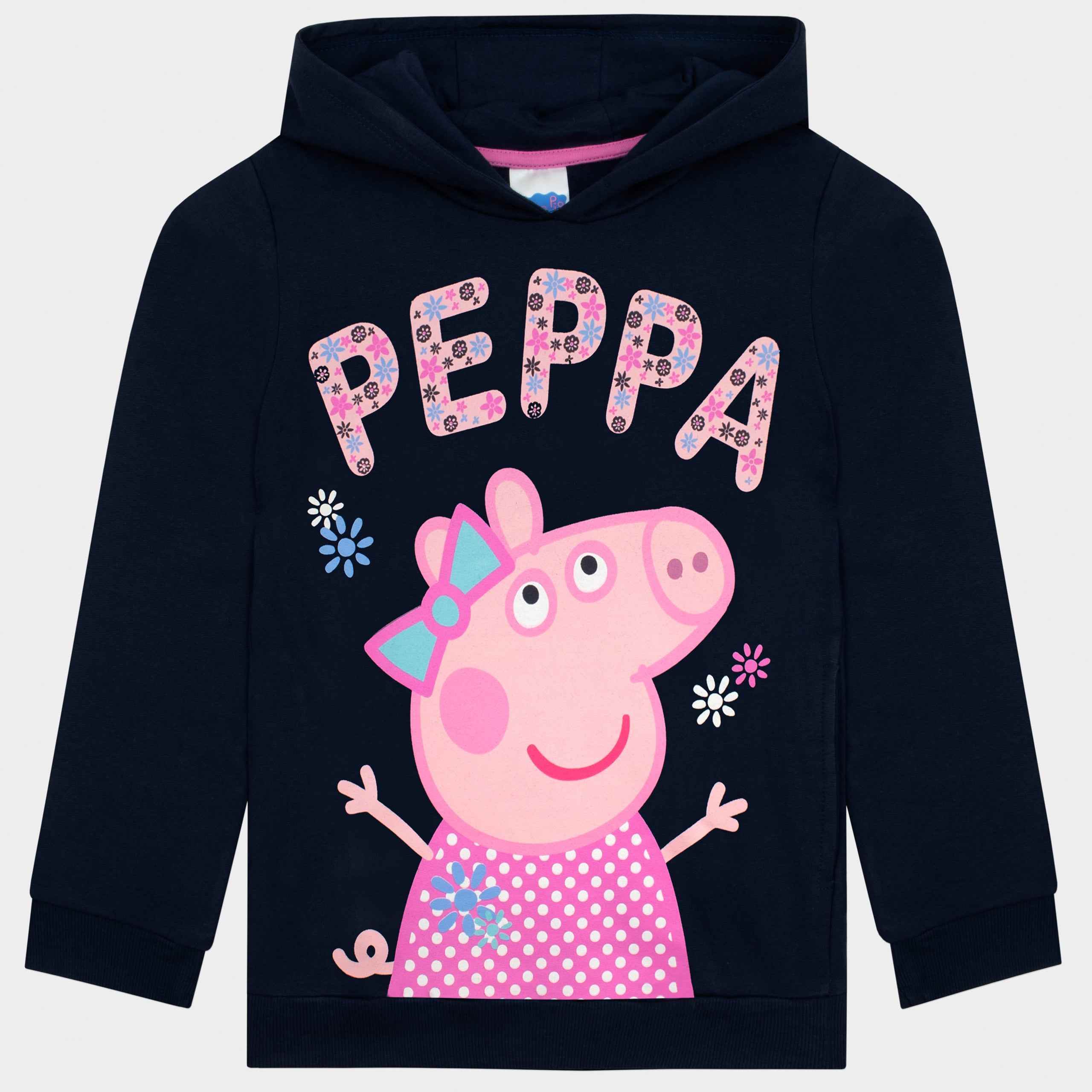 Any little Peppa Pig fan will love staying snug in this adorable navy Peppa Pig hoody! A cute sweatshirt that features a large print of the lovable piglet with her name in pink surrounded by flowery detailing. This comfy jumper is made of a high quality cotton blend and comes with a cosy hood and side pockets. Make going out look extra cute with this Peppa-tacular sweater!