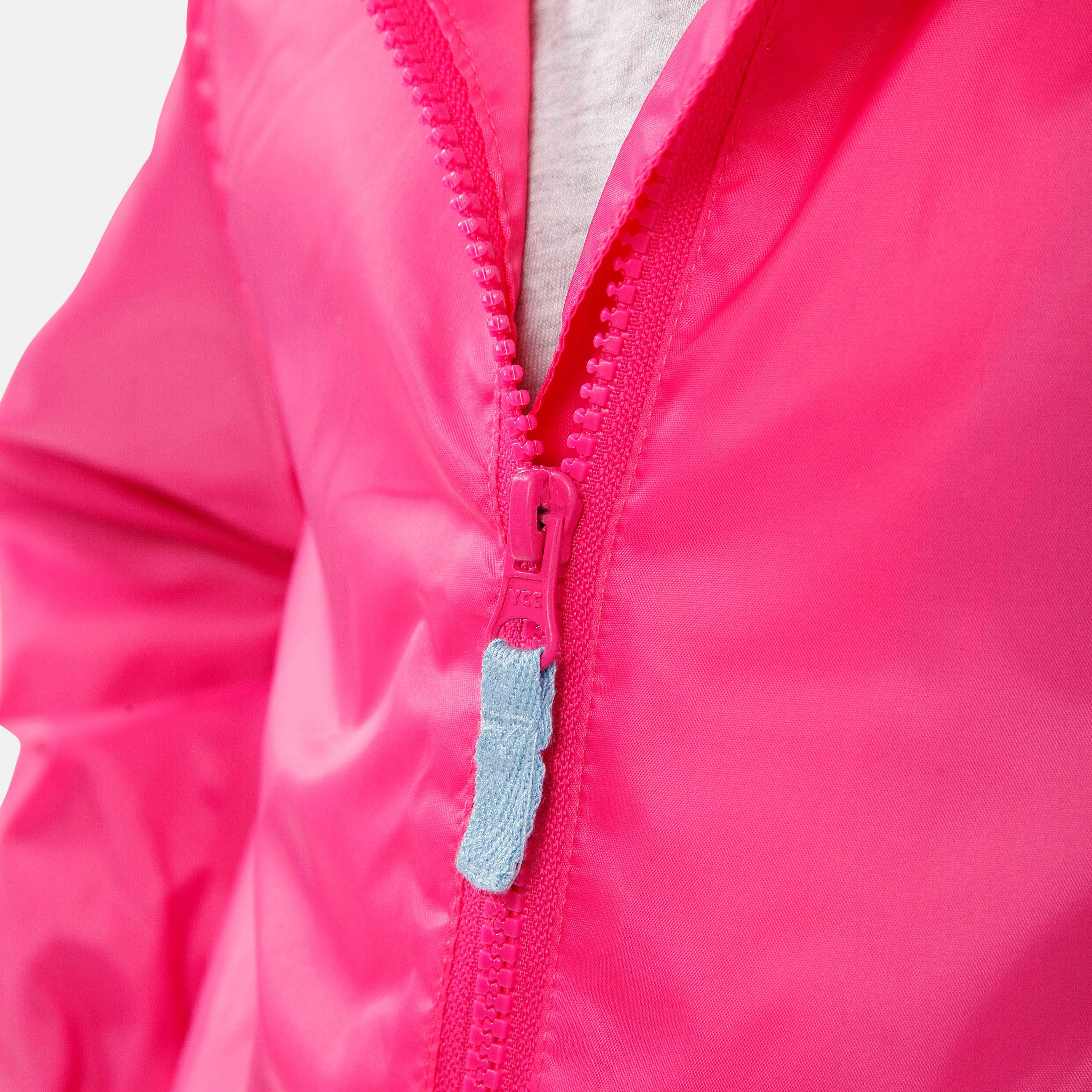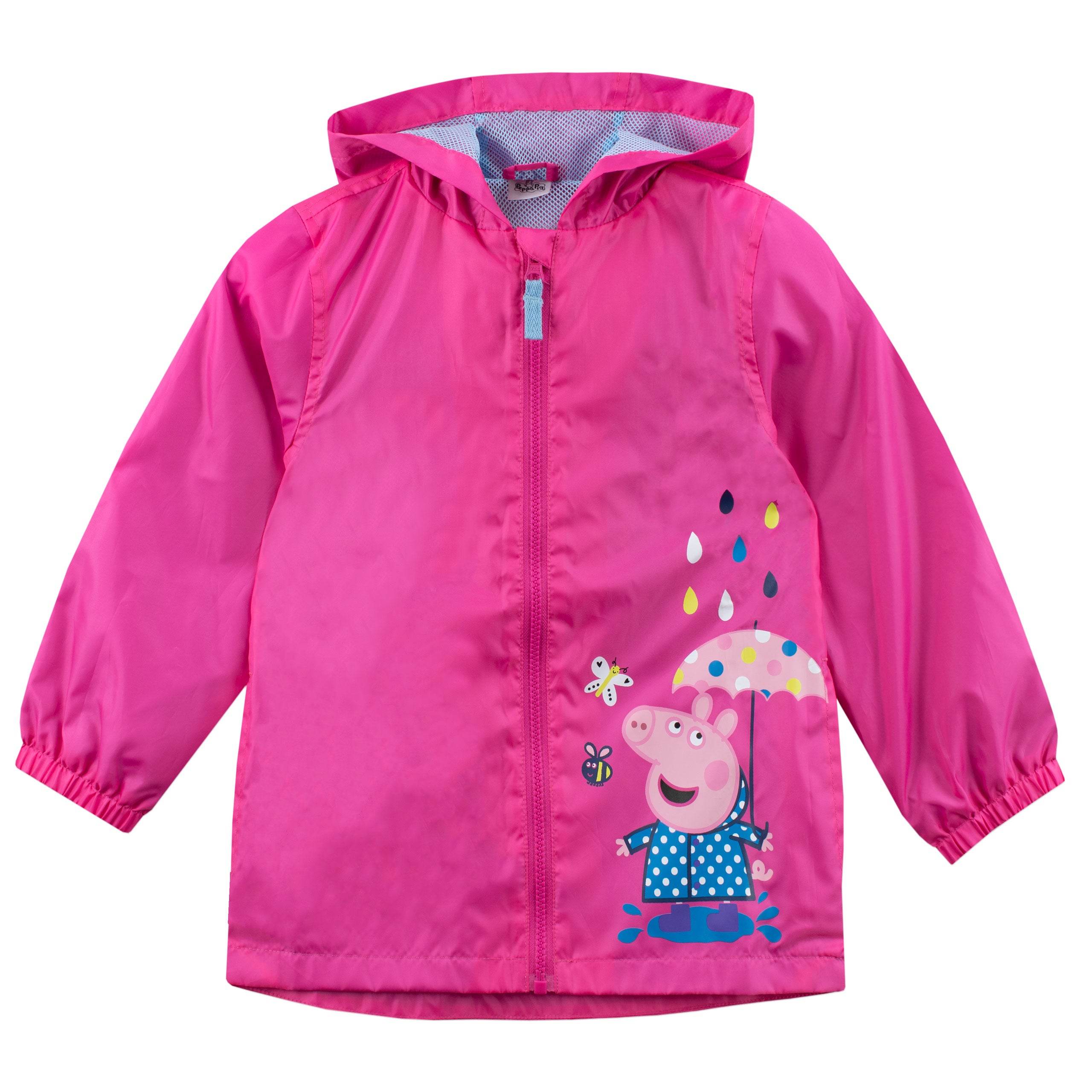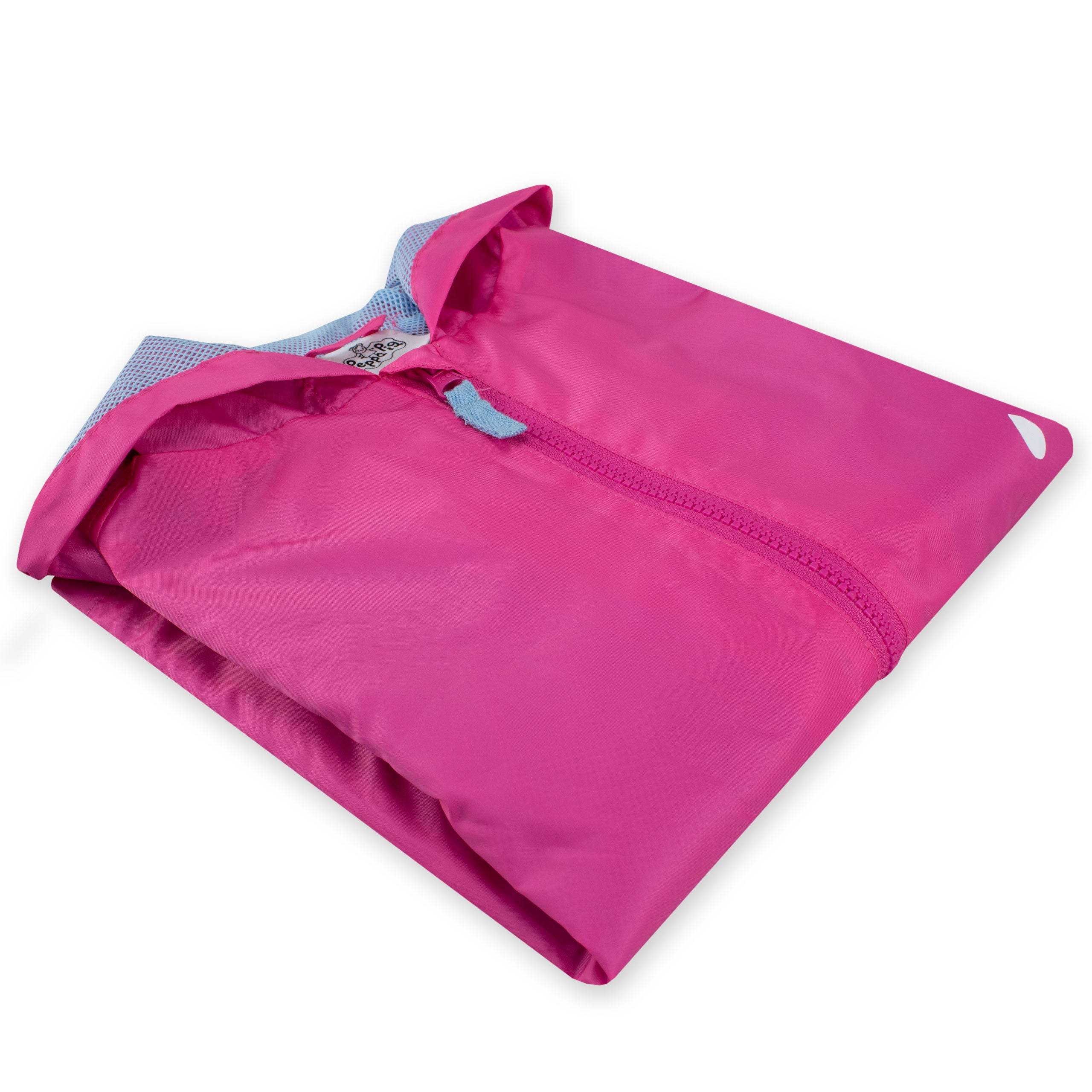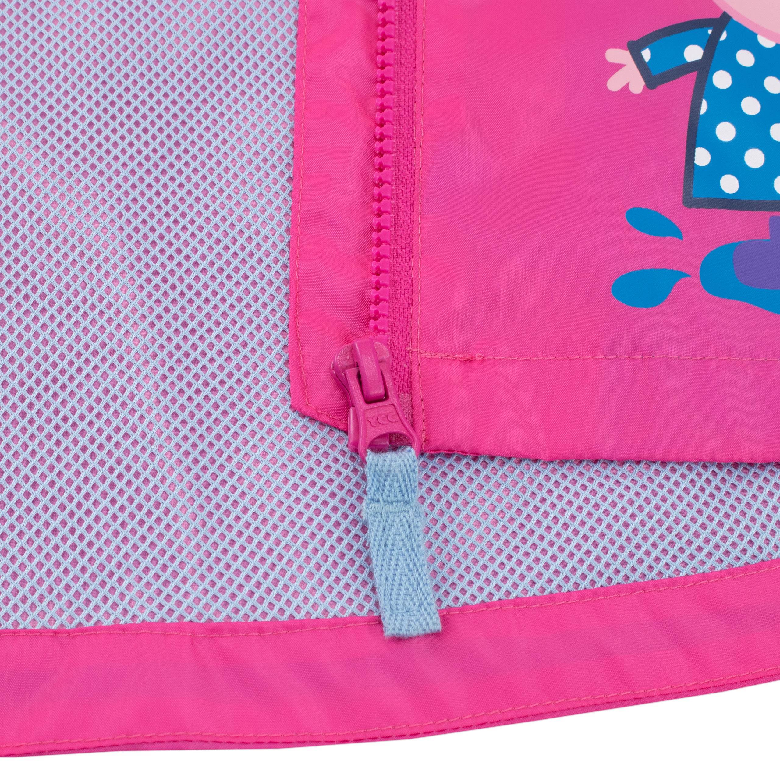 Get ready for awesome rainy days with our Girls Peppa Pig Pink Raincoat! Join Peppa Pig in jumping through puddles and be a superstar splasher! This vibrant coat features an adorable print of Peppa, showing off her polka dot umbrella and having a blast in irresistible puddles. With Peppa by your side, every rainy adventure becomes extra exciting! Designed for comfort and playfulness, the hood, easy zip front, and stretchy cuffs keep you snug as a bug while raindrops fall around. It's like a cozy hug from Peppa herself! With secret pockets for treasures and a soft blue mesh lining, you'll feel awesome all day long. Built tough to withstand wild adventures, rain or shine, our Peppa Pig jacket is your ultimate partner. Embrace the rain, grab yours now, and conquer the world with Peppa!
