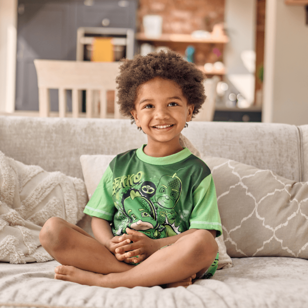 Your reptile hero will have the greatest night sleep in PJ Masks HQ in these awesome superhero PJs! A vivid green short pyjama set perfect for warmer nights relaxing after saving the day. The top features a trio print of the masked hero Gekko with contrast stitching on the sleeves, and a cool all over print on the shorts. Complete with an elasticated waistband for comfort, these jammies are essential for any hero of the night!