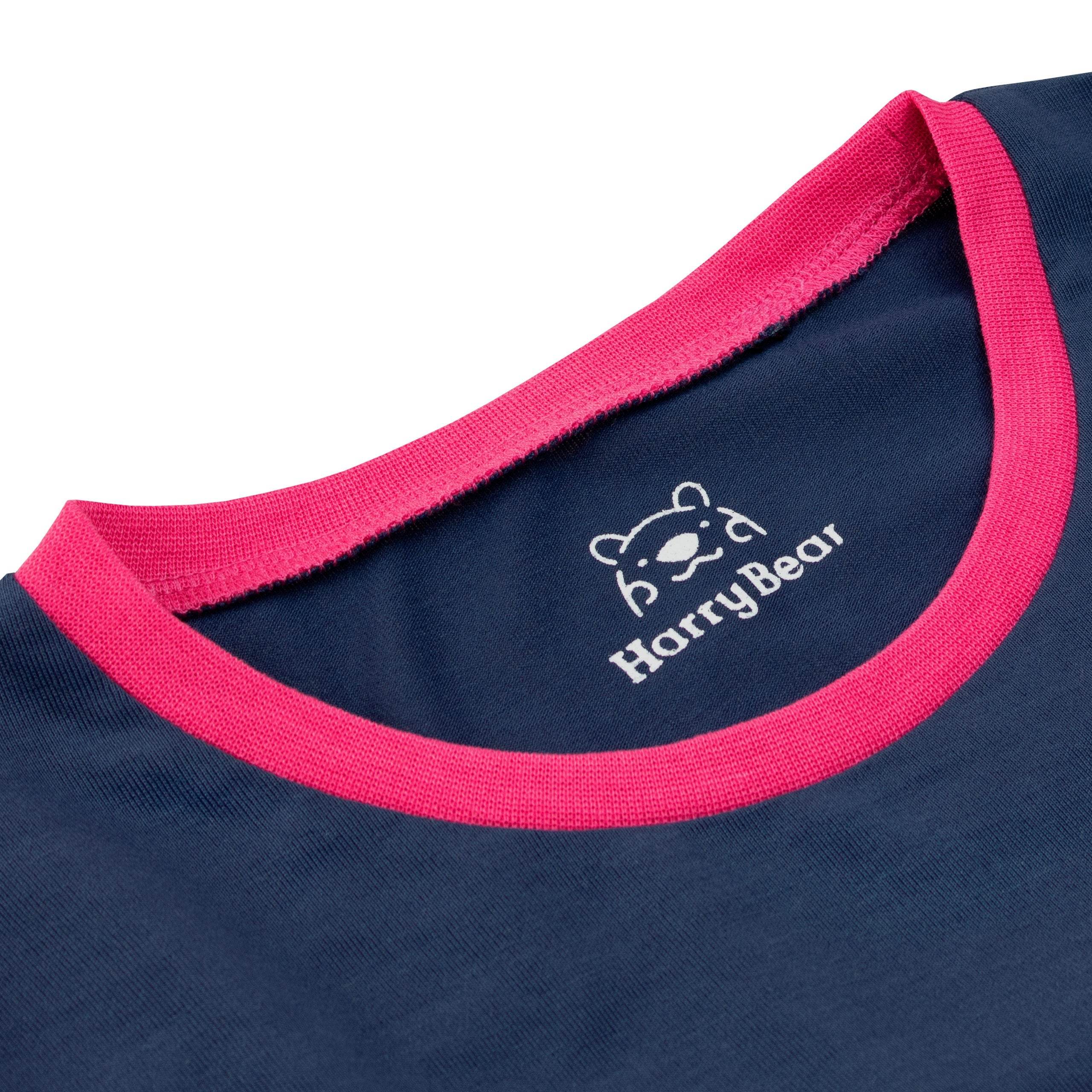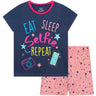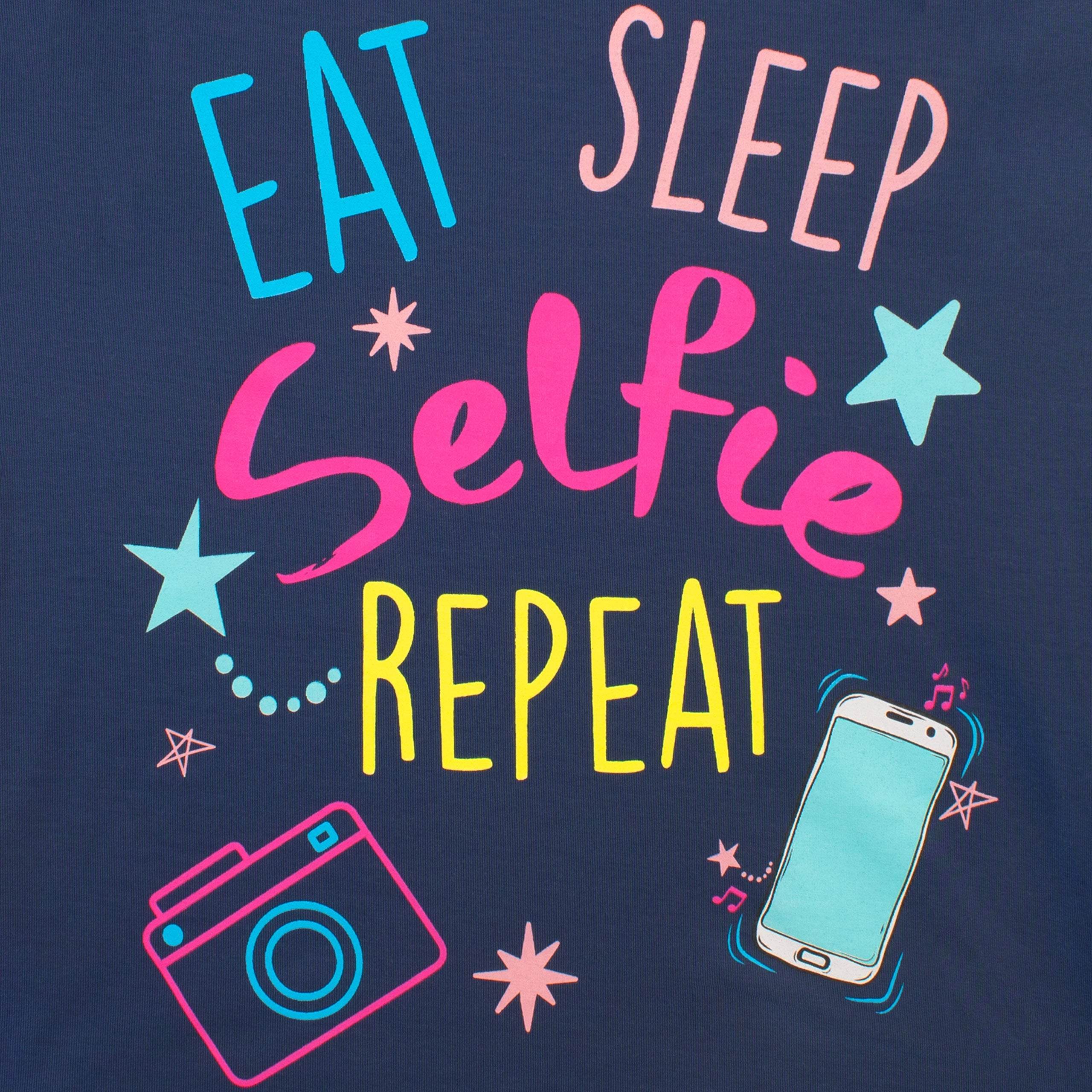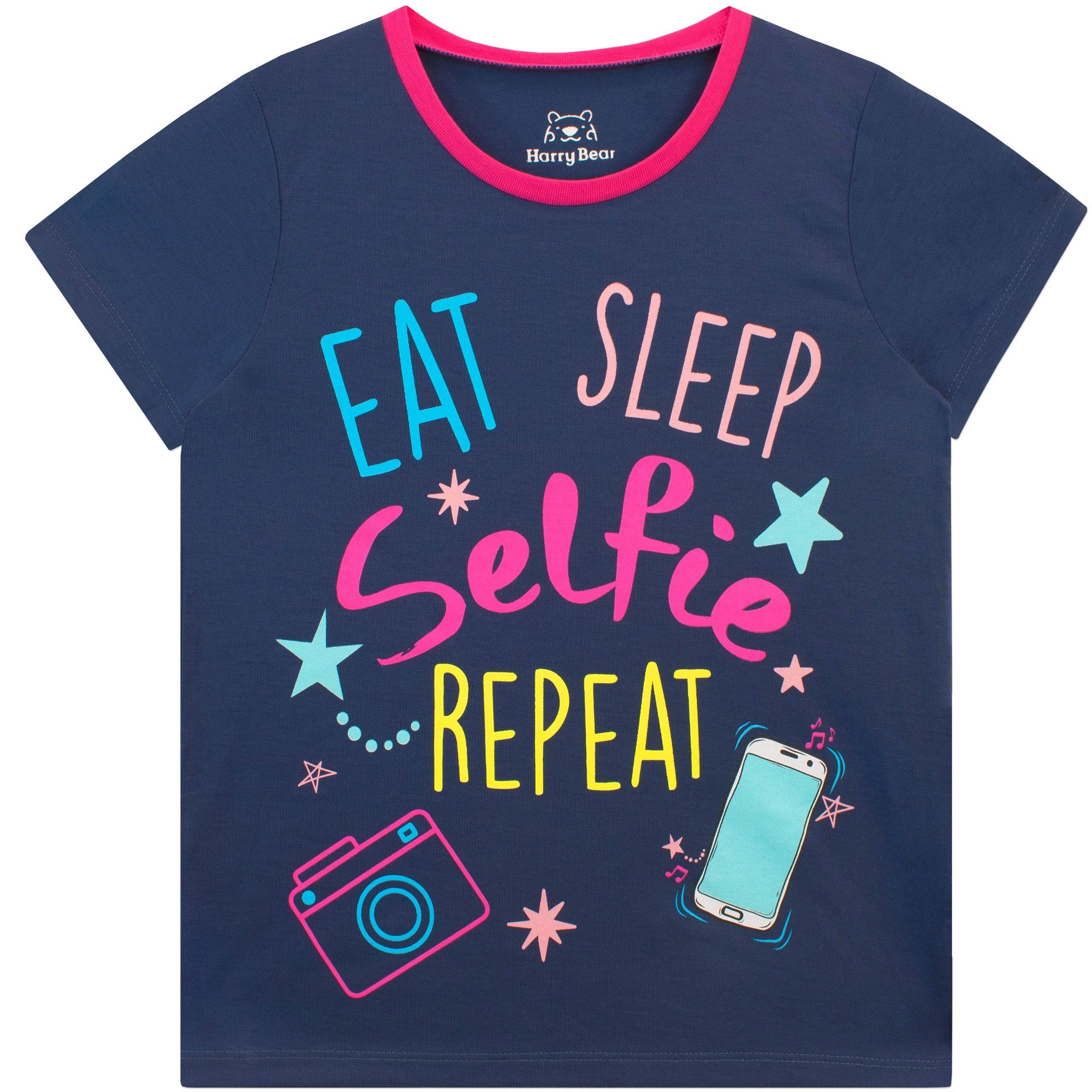 Social media fans will love this selfie slogan short pyjama set. Designed by Harry Bear, these PJs feature a navy top with the slogan "Eat Sleep Selfie Repeat" with a mobile phone and camera motif surrounded by stars. Pink shorts with a matching navy star print complete the set. This premium quality pyjama set is perfect for aspiring influencers to dream about their next post or dance routine.