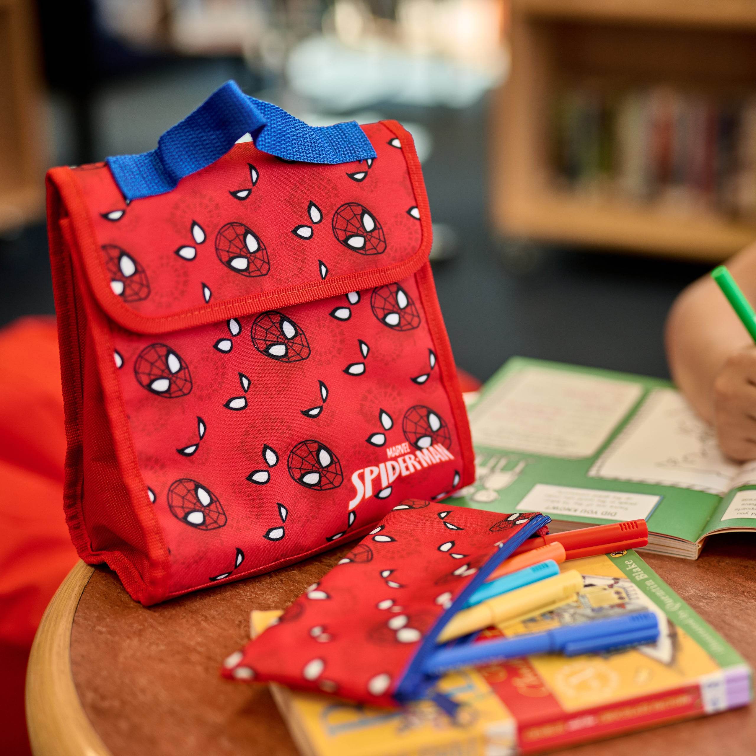 • Supercharge your school days with our colourful, Spiderman-themed gear. A lunch bag with a vibrant blue handle, a pencil case echoing the repeating Spiderman pattern, and a thirst-quenching water bottle makes this set the perfect companion for your academic adventures!