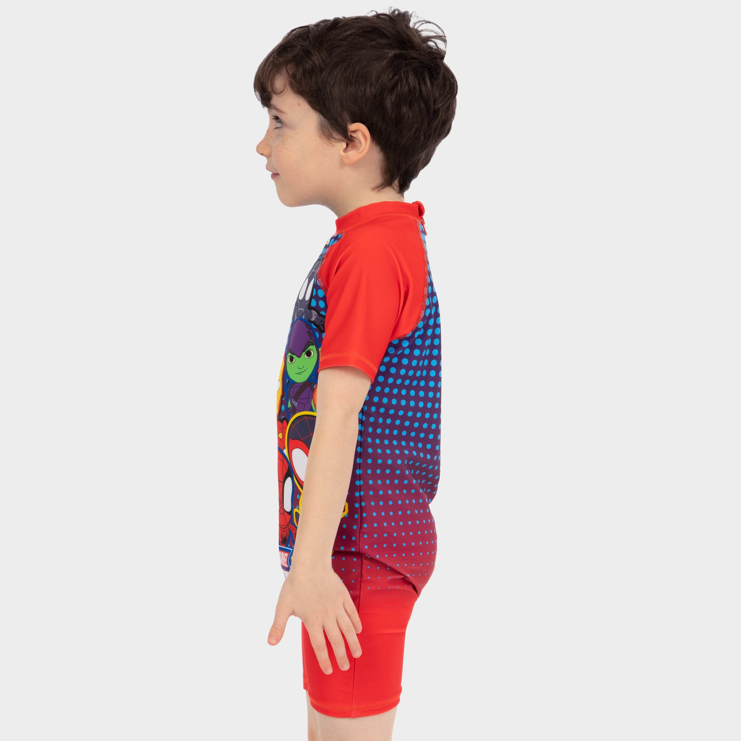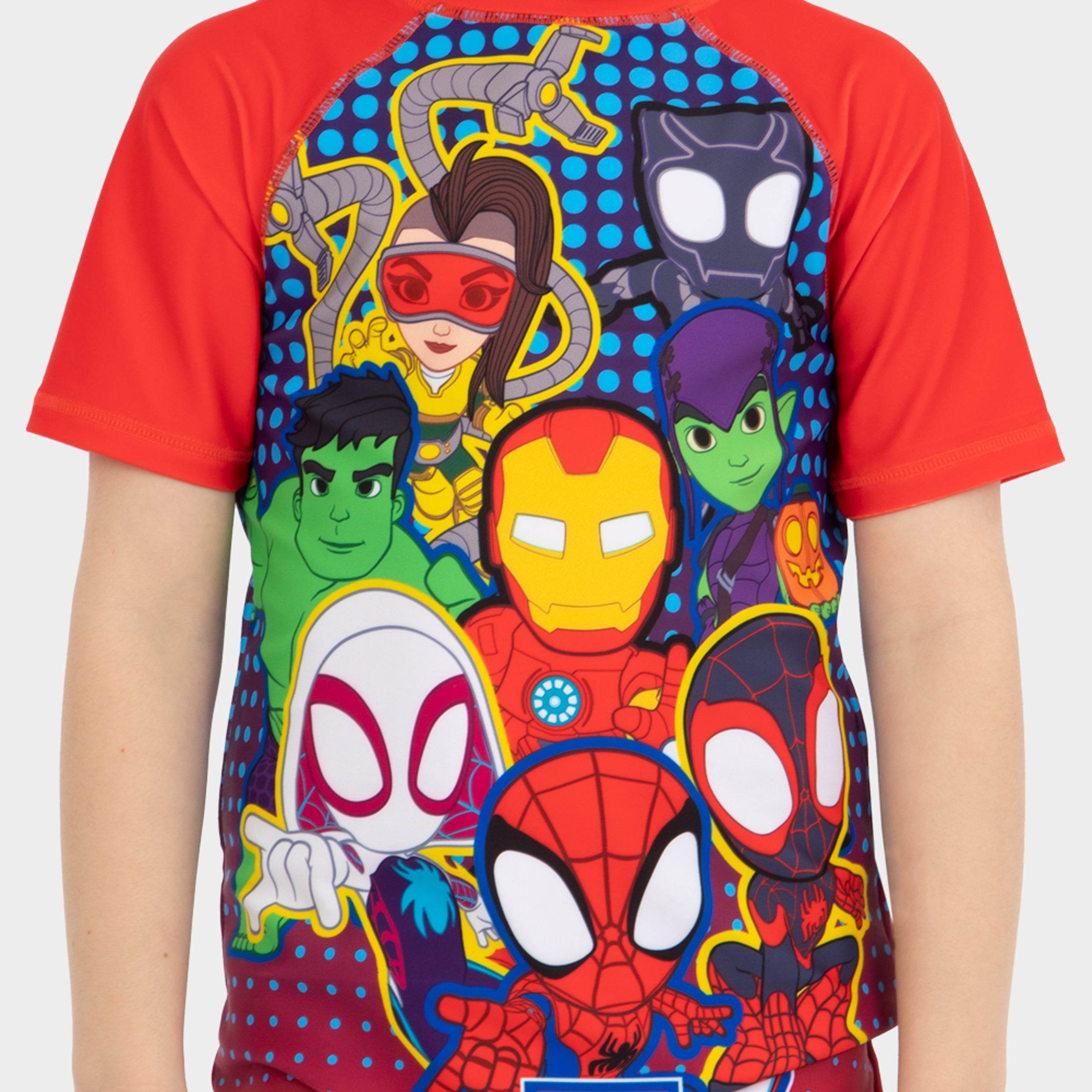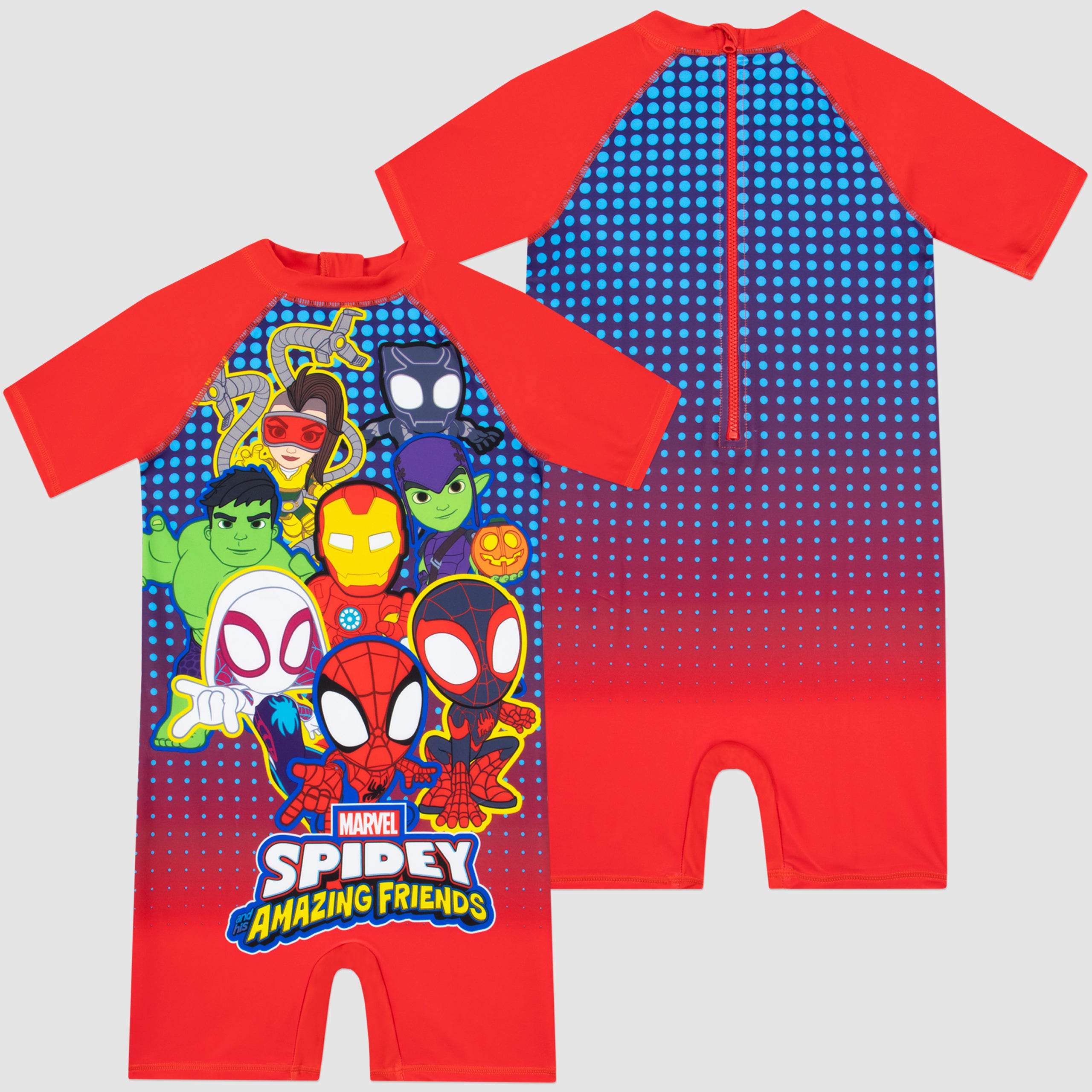 Suit up for splash-time action with this vibrant boys Spider-Man swimming costume! Bursting with colour and covered in Marvel favourites like Spider-Man, Miles Morales, and Iron Man, it’s a superhero dream come true. The bold blue dot pattern and red sleeves add that classic Spidey flair to this Marvel swimwear. Whether he's diving into the pool or saving the day at the beach, this boys swimsuit is ready for every heroic mission.