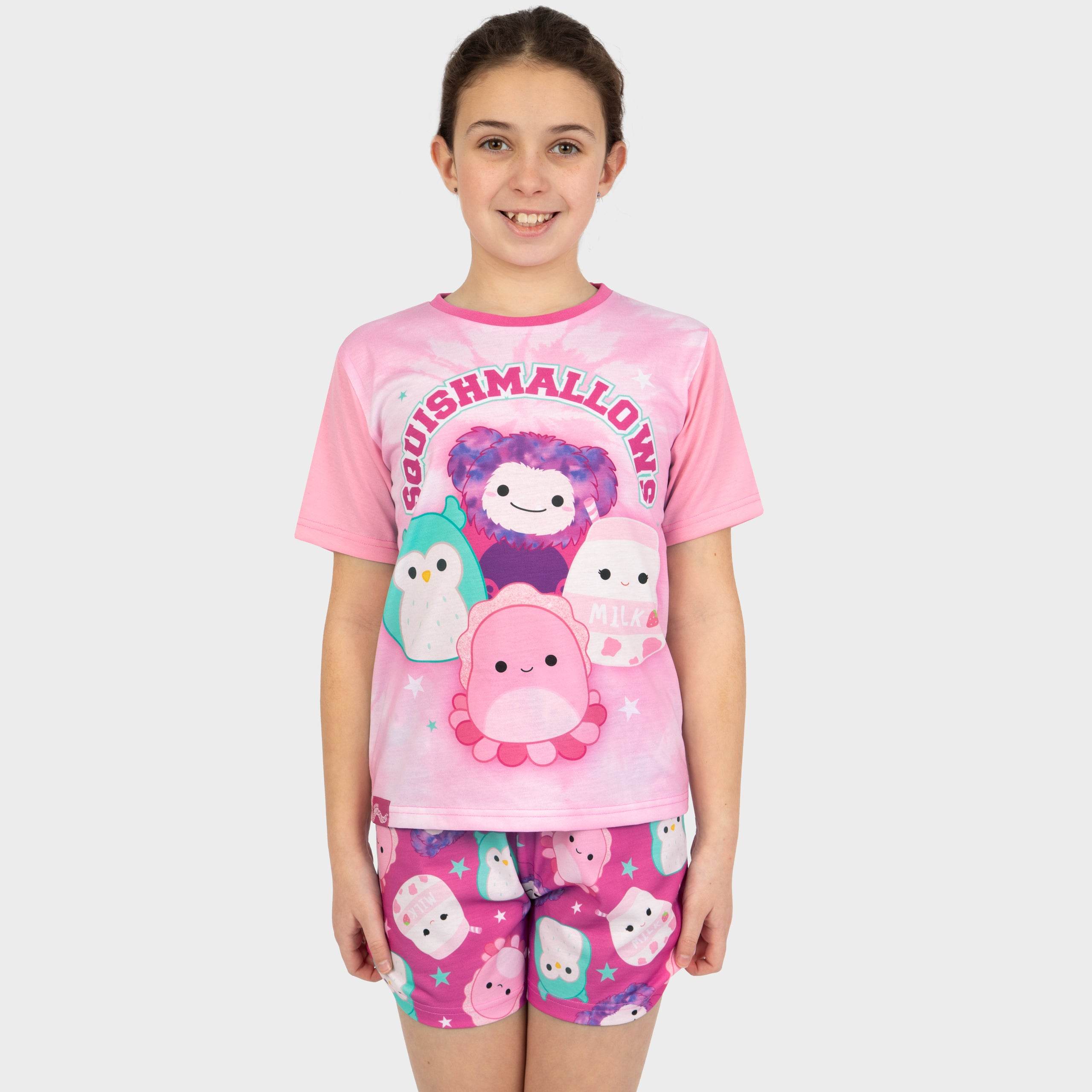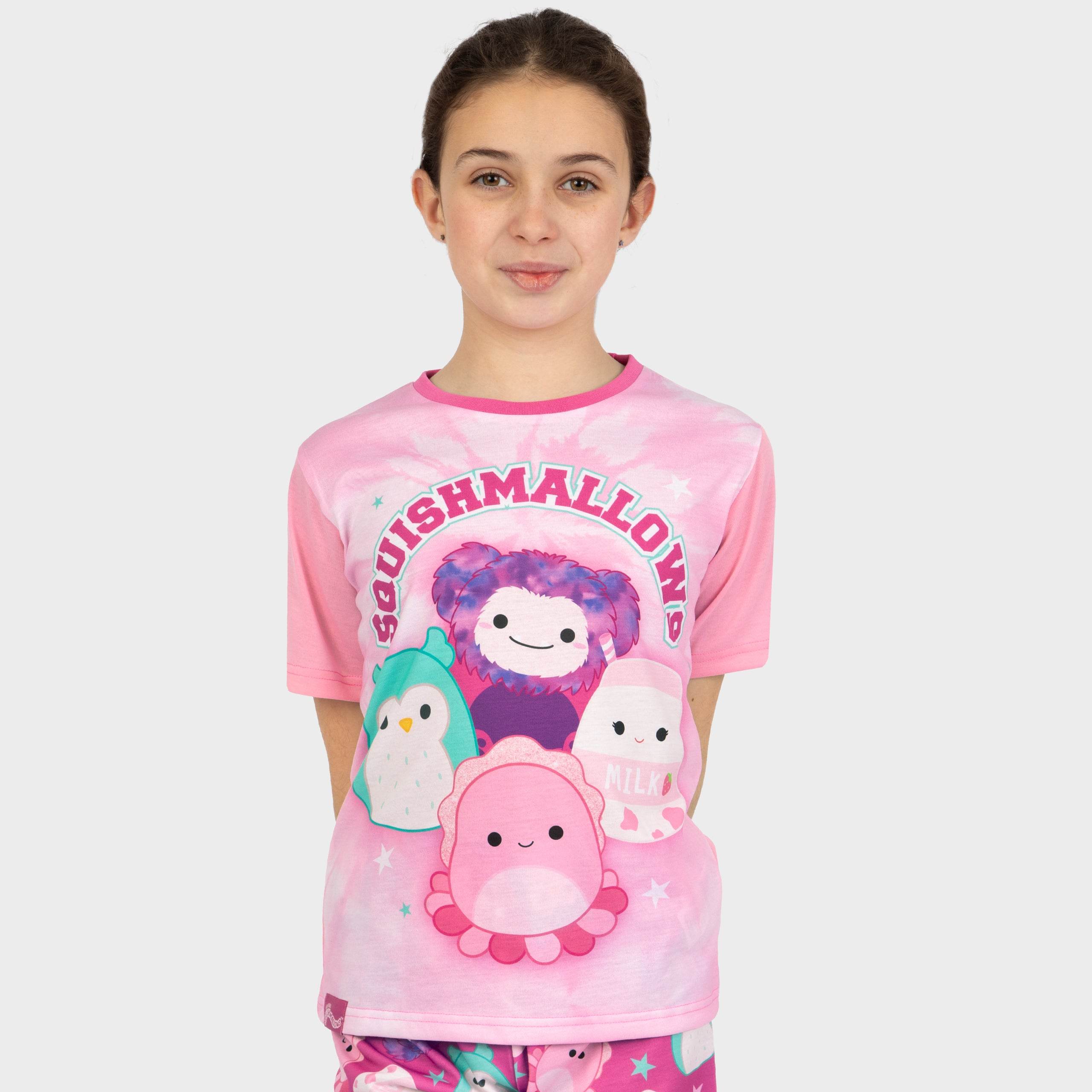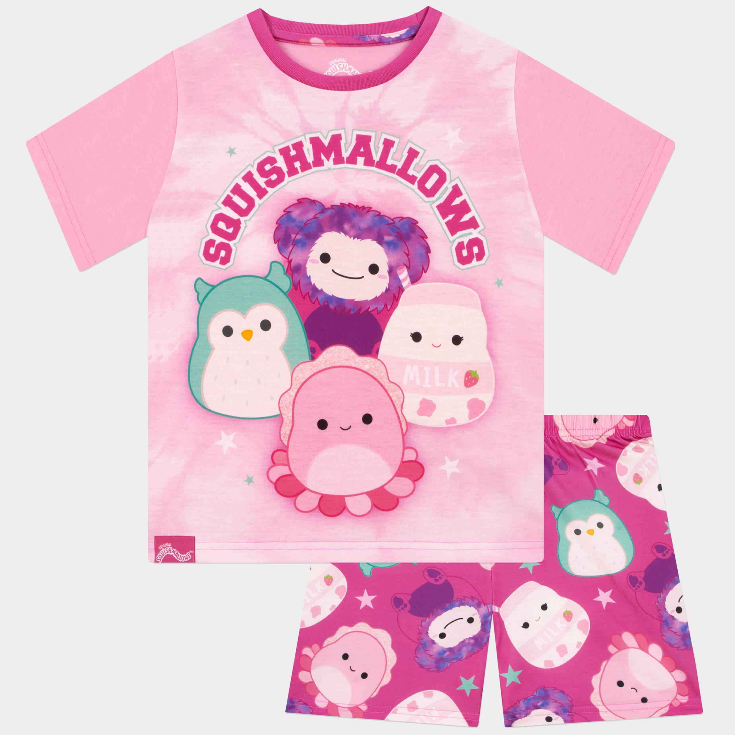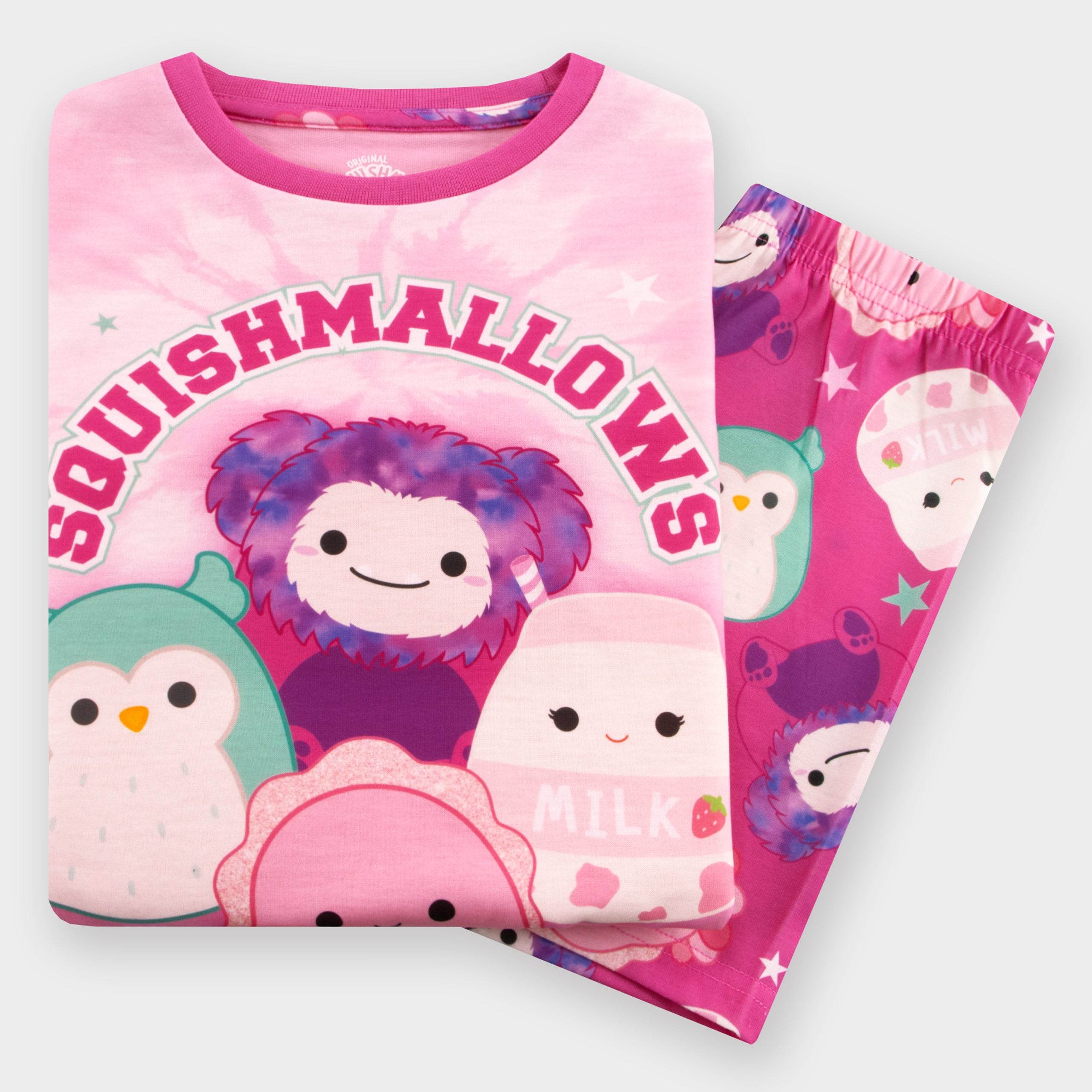 Bring squishy cuteness to bedtime with these playful Squishmallows pyjamas! The top stars four fan-favourite Squishmallows set against a dreamy pink tie-dye background, with the logo popping in pink and green. The matching shorts are just as charming, sprinkled with mini squishes and twinkly stars. Comfy and colourful, these short pjs are made for cosy nights and big smiles. Whether it's for lounging, snoozing, or impromptu pillow forts, these girls PJs are a perfect pick. Little Squishmallows lovers will be totally smitten!