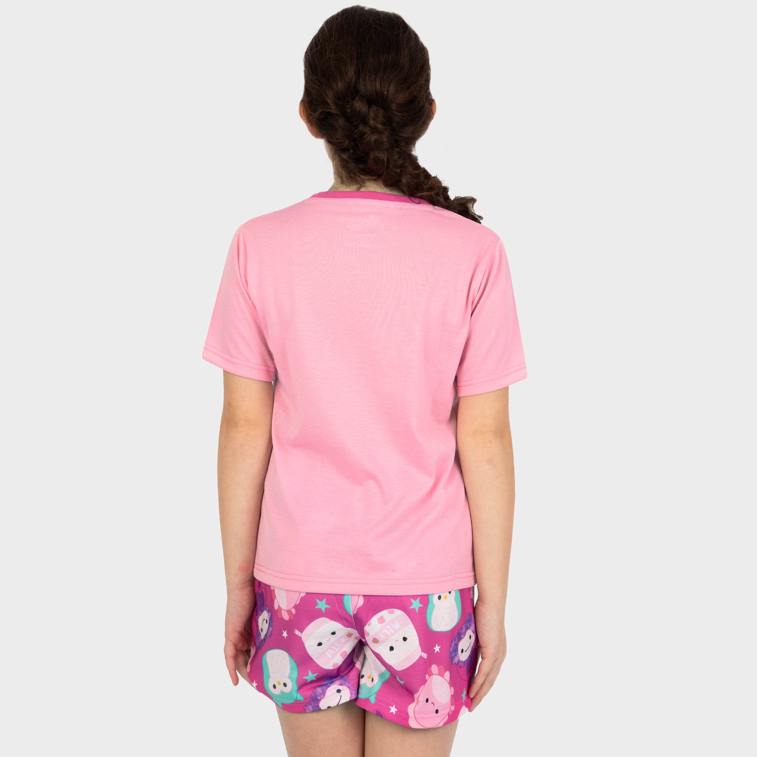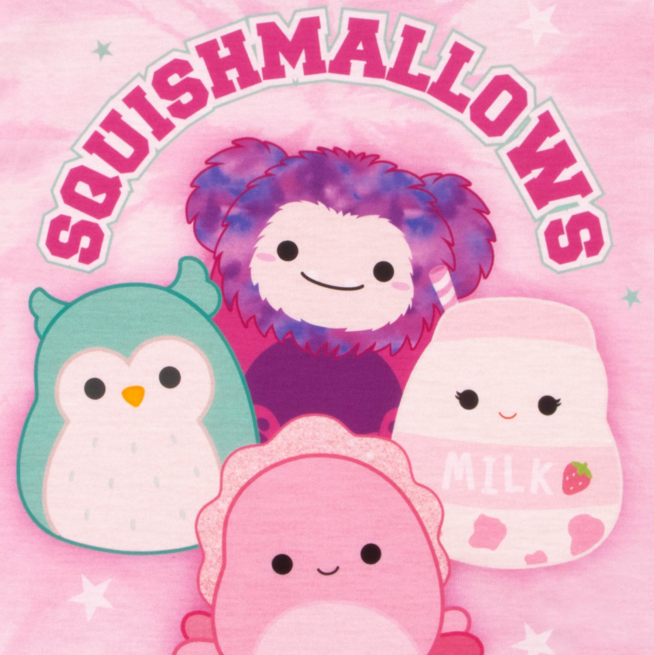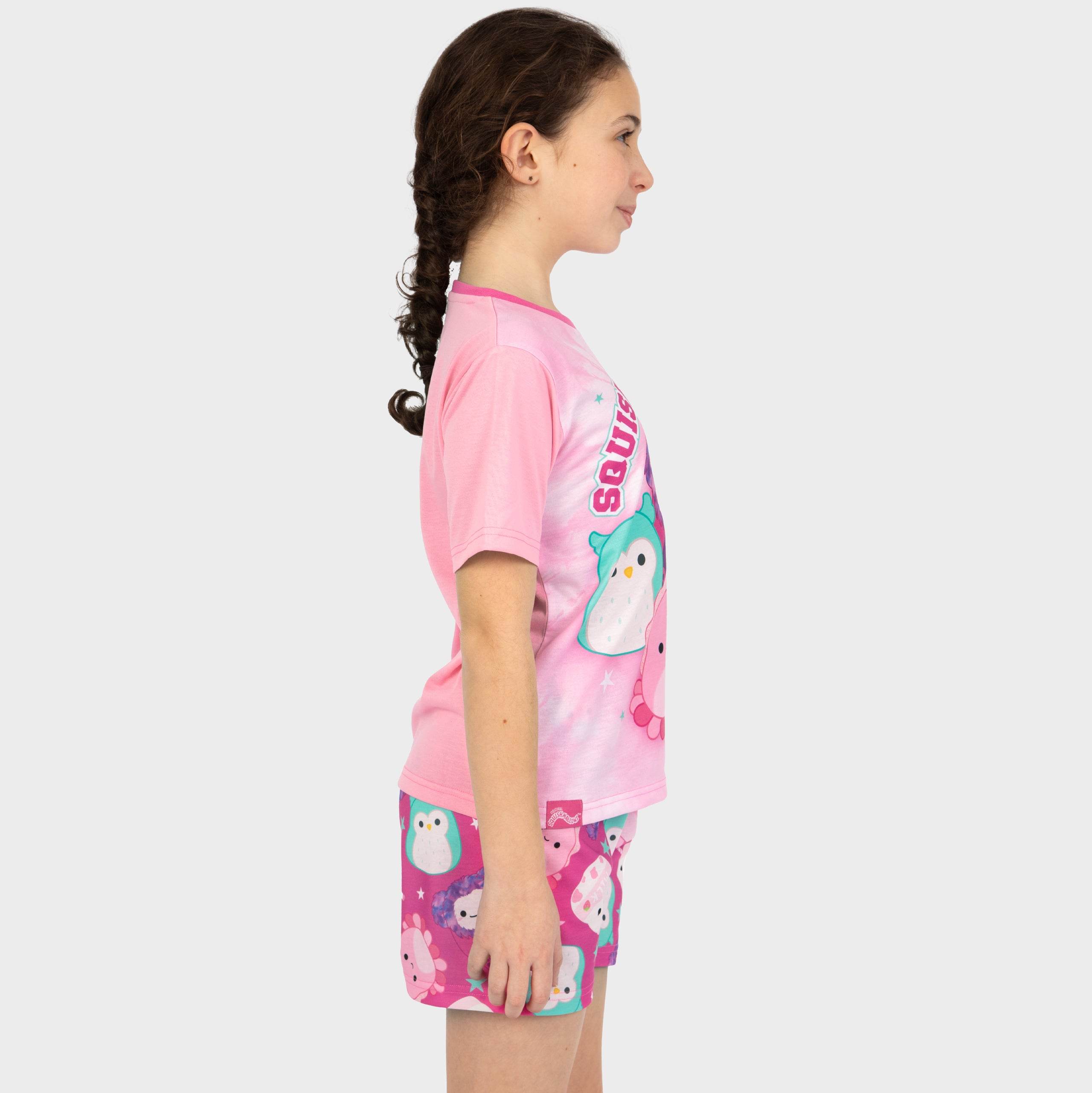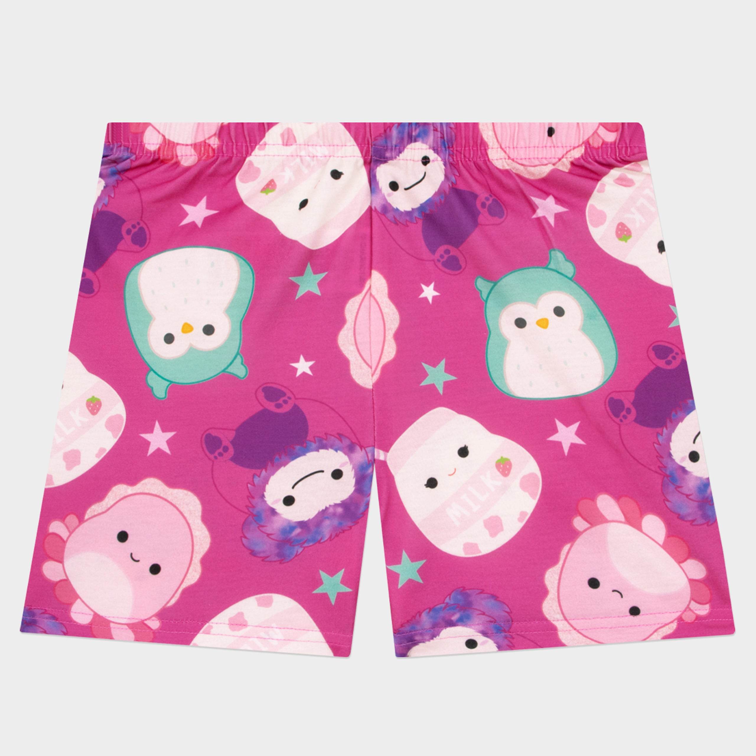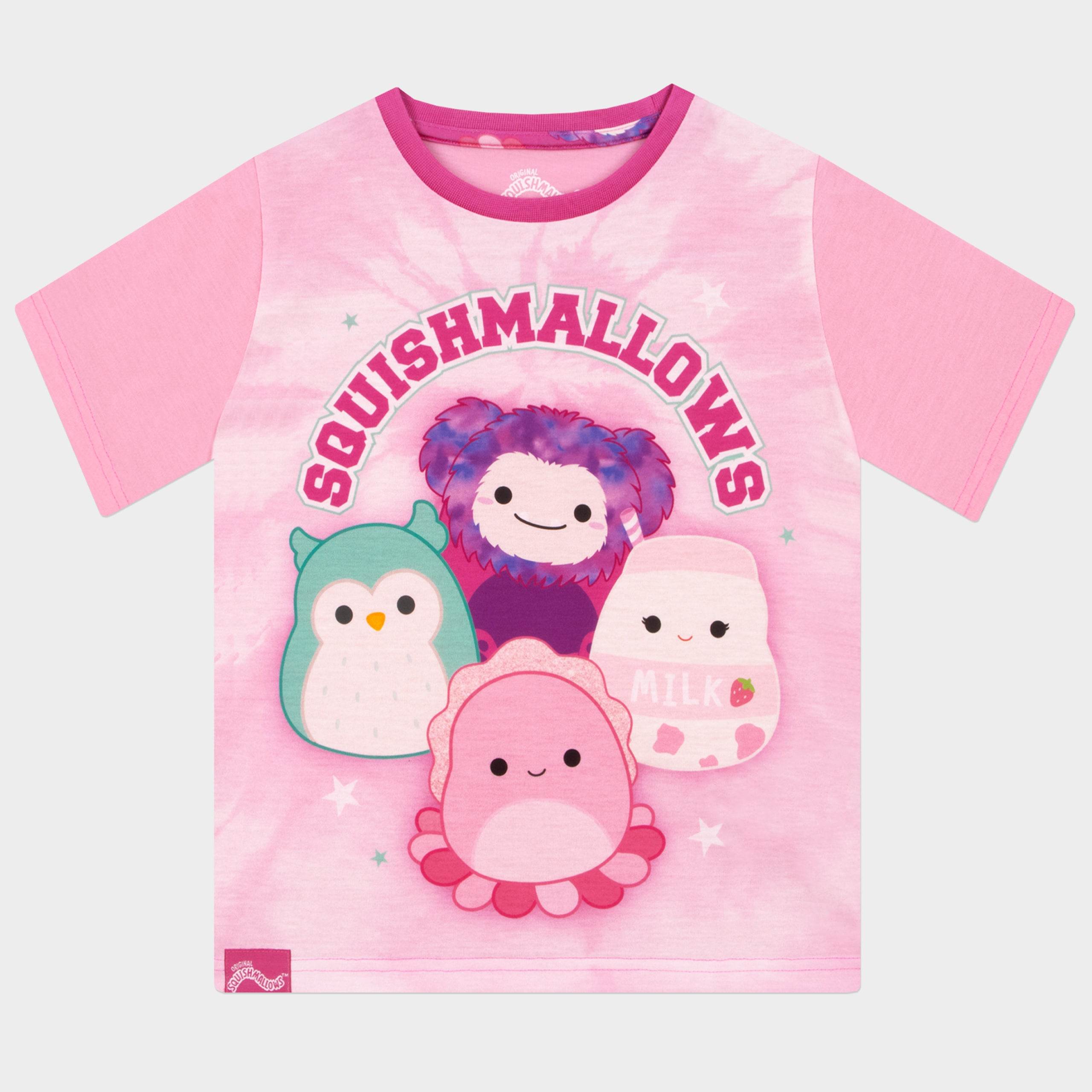 Bring squishy cuteness to bedtime with these playful Squishmallows pyjamas! The top stars four fan-favourite Squishmallows set against a dreamy pink tie-dye background, with the logo popping in pink and green. The matching shorts are just as charming, sprinkled with mini squishes and twinkly stars. Comfy and colourful, these short pjs are made for cosy nights and big smiles. Whether it's for lounging, snoozing, or impromptu pillow forts, these girls PJs are a perfect pick. Little Squishmallows lovers will be totally smitten!