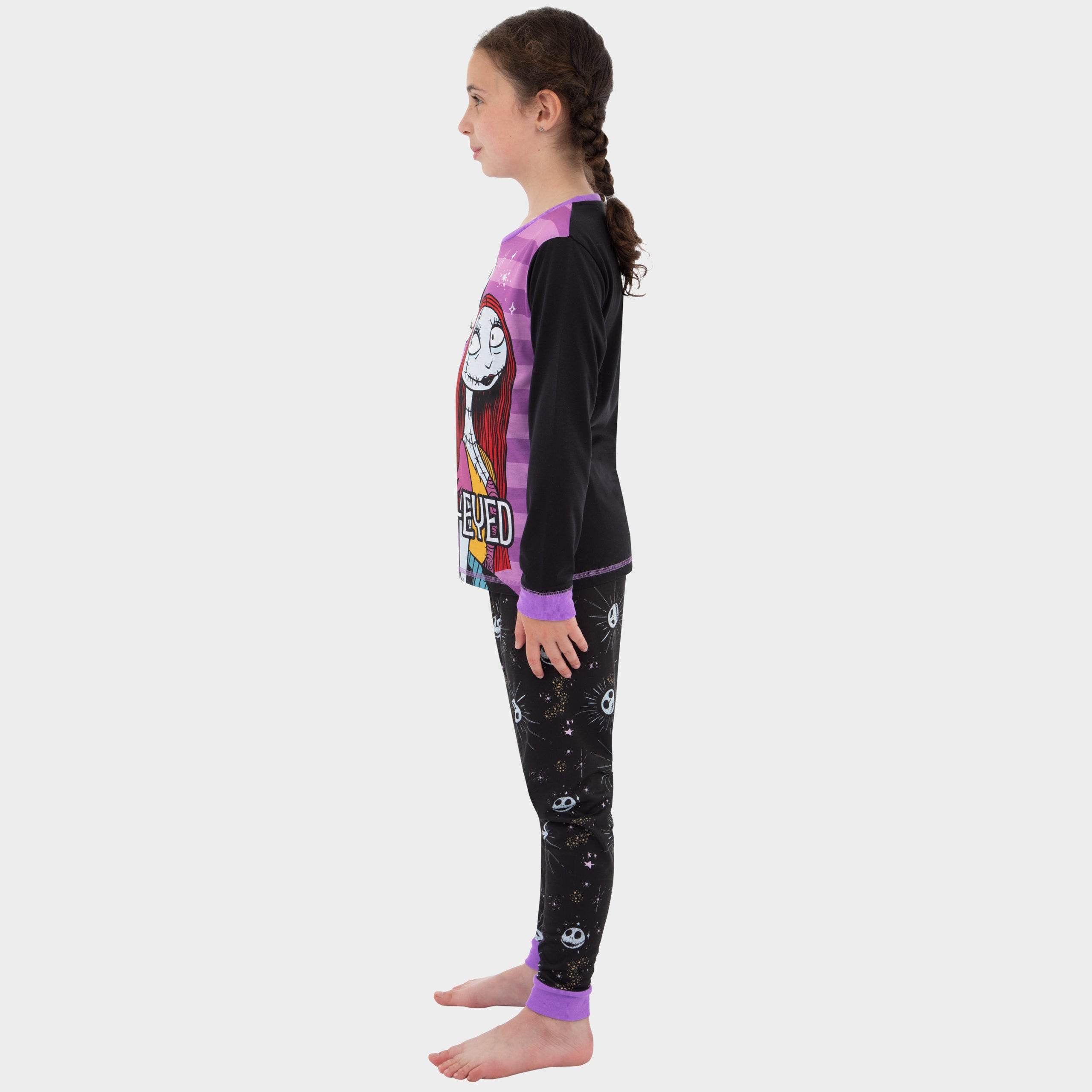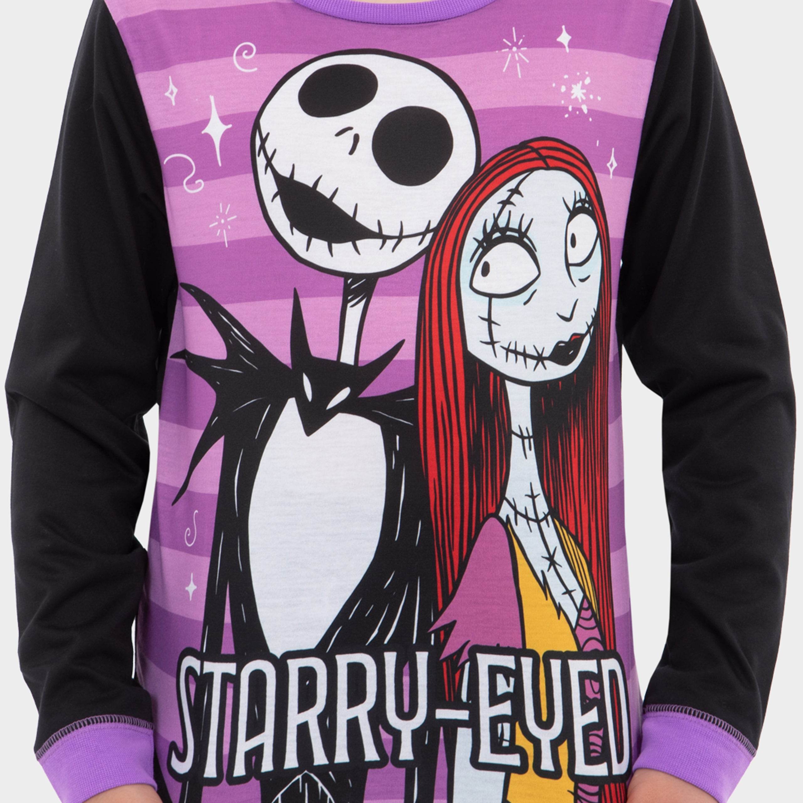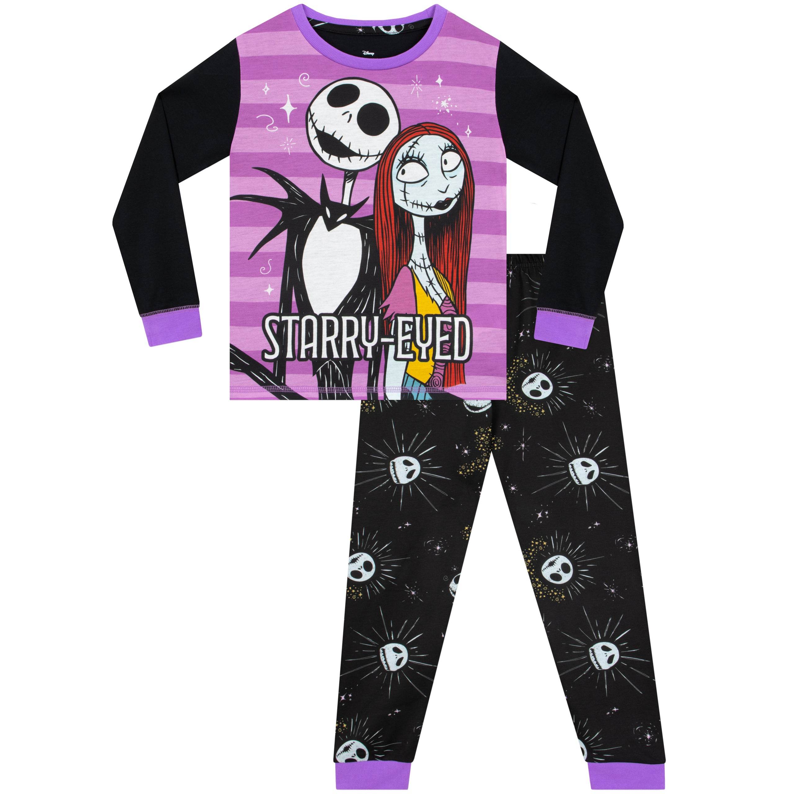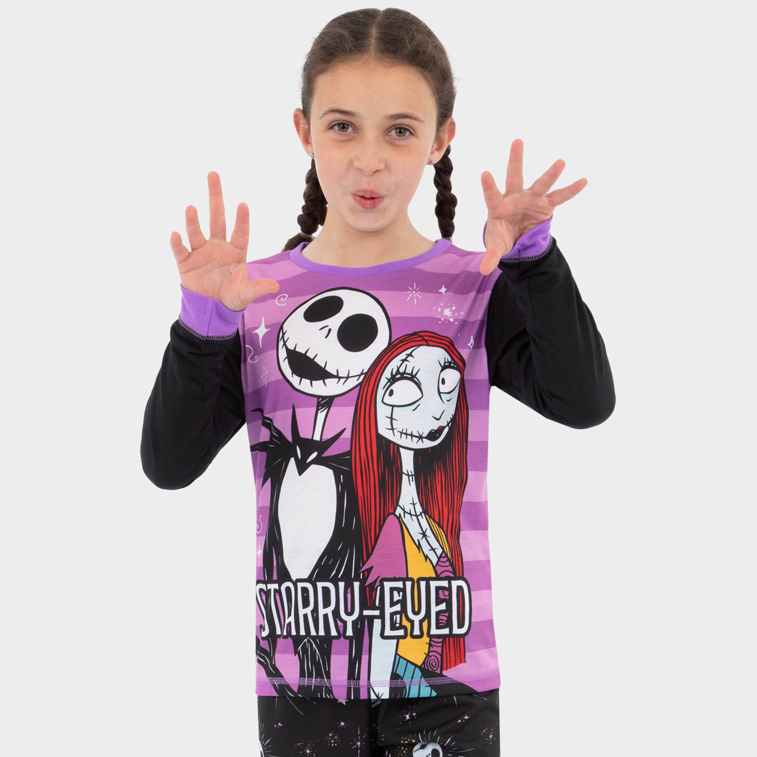 This Nightmare Before Christmas PJ set is perfect for little adventurers who love Halloween fun and cosy comfort. The Disney pyjama top stars Sally Nightmare with Jack Skellington, finished with the phrase Starry-Eyed in a playful white font. Complete with long black sleeves finished in purple cuffs, these girls pyjamas are sure to keep your little one comfy and warm. Paired with elasticated PJ bottoms boasting Jacks face and yellow stars, bedtime is sure to be a frightfully good time when they're wearing these awesome Disney PJs!