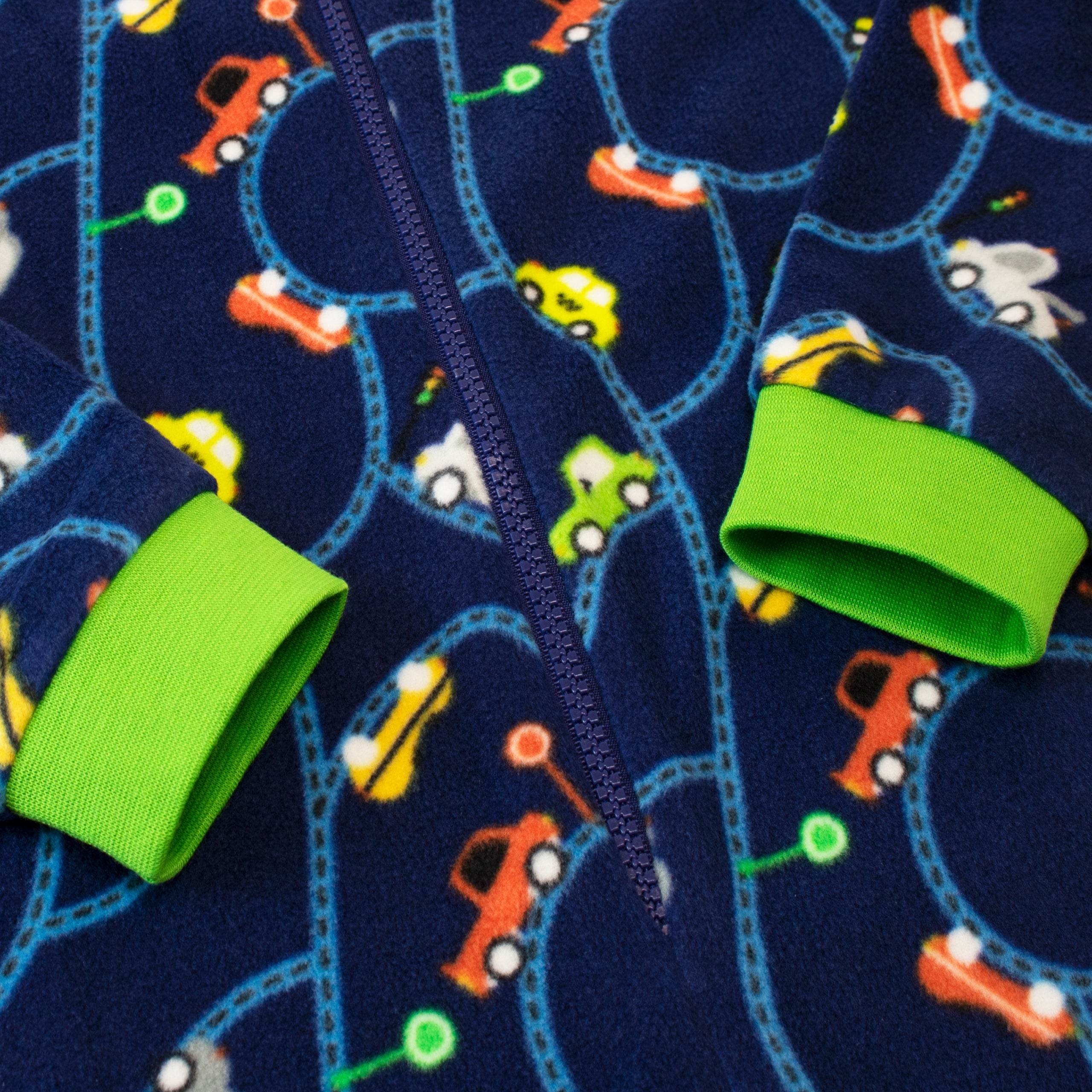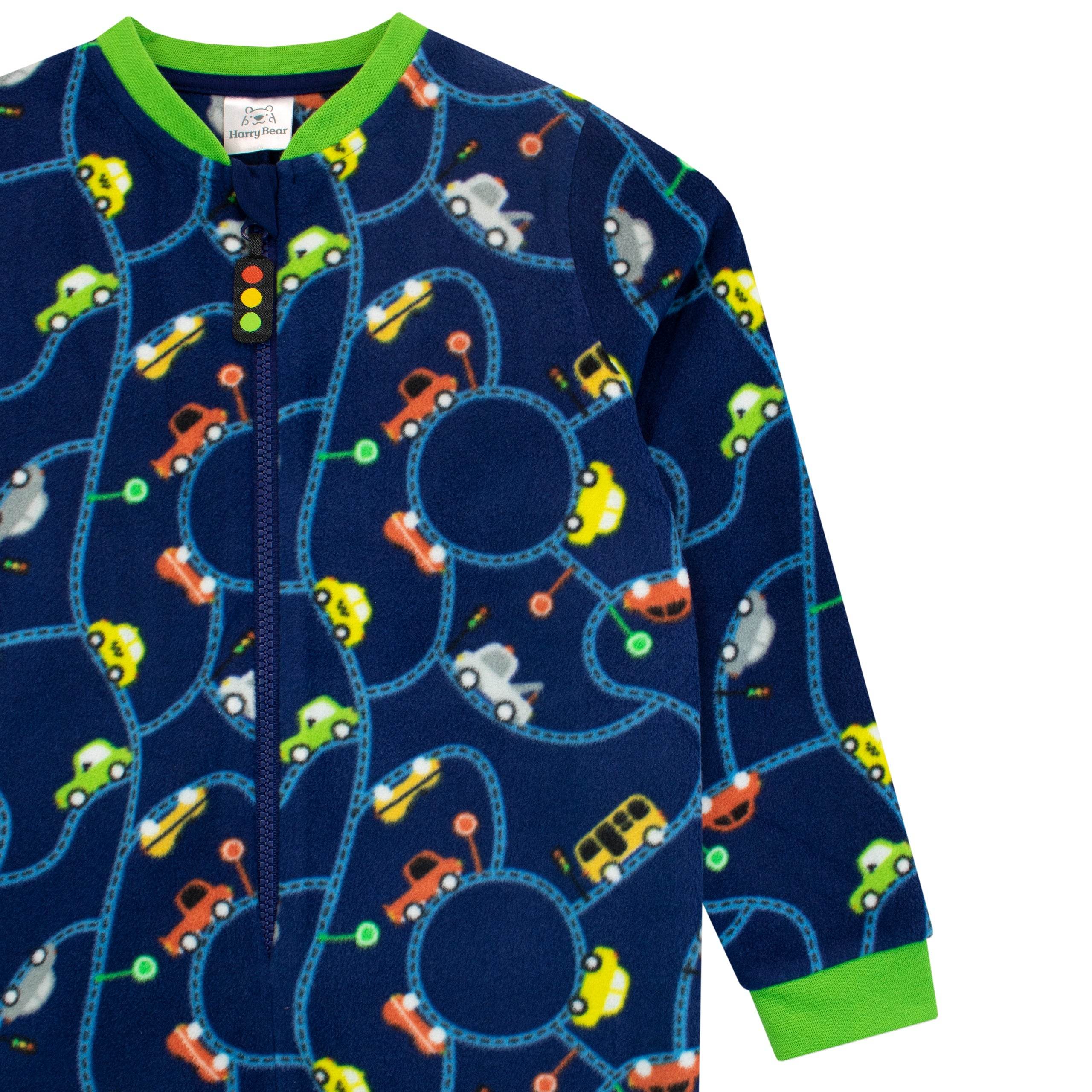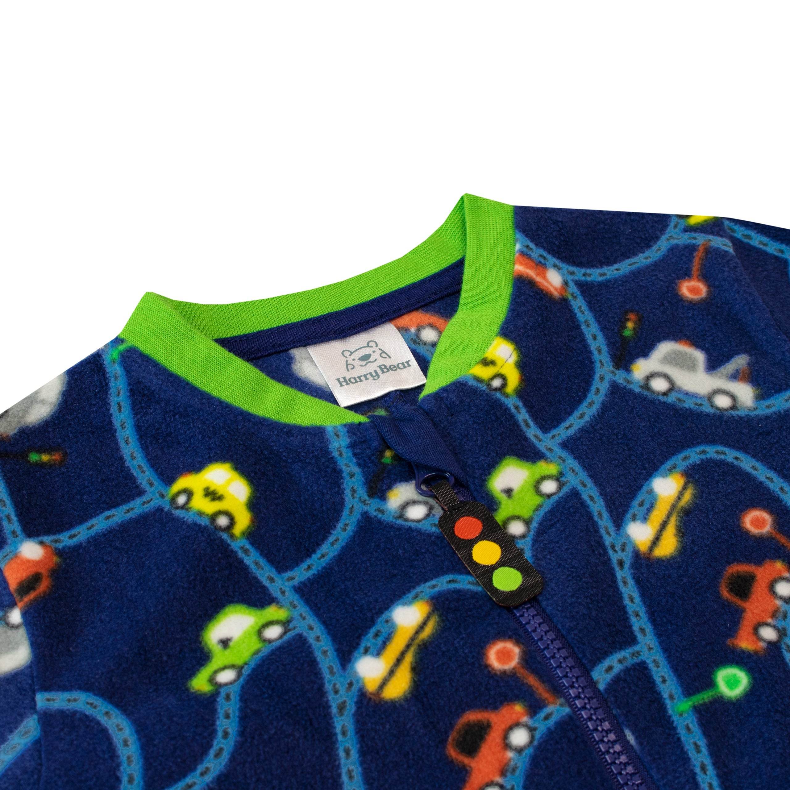 Beep beep! Set your little driver on the road to dreamland with this adorable vehicle onesie! Designed by Harry Bear, this blue sleepsuit features an all-over motif of roads, cars and buses and has a zip up front with a cute traffic light zip pull and contrasting green cuffs. Your little cars fan will love to snuggle down for a cosy night's sleep in this super soft all-in-one!