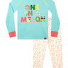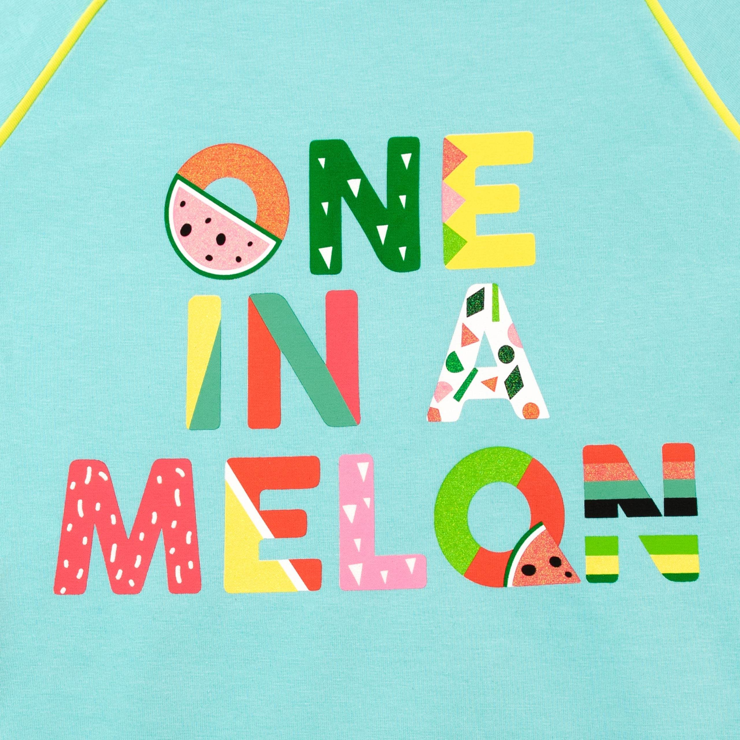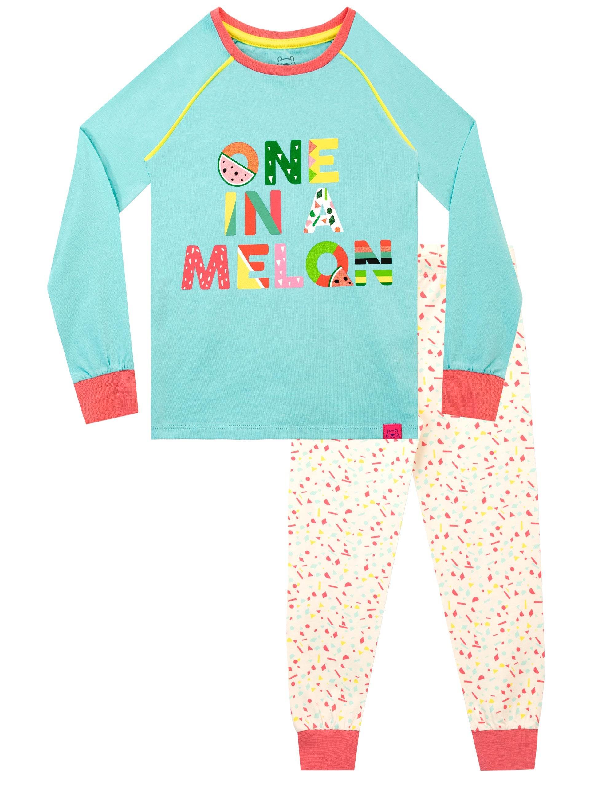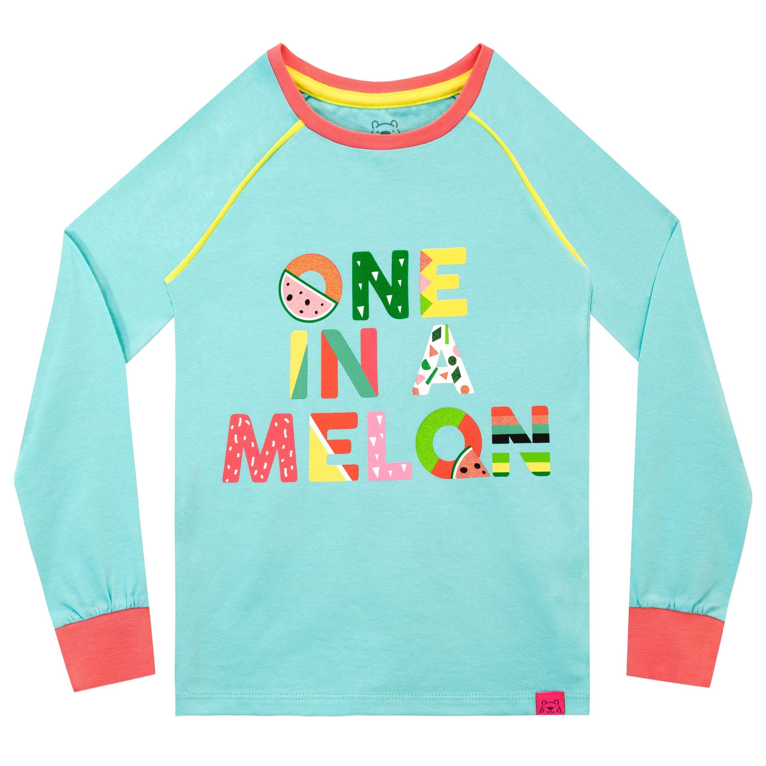 Dream of exotic tropical landscapes in these cute Tropical Melon Pyjamas! Designed by Harry Bear, this fruity pyjama set showcases a large print of the slogan 'One in a Melon' in a fun illustrated print complete with glitter detailing and a watermelon motif. The blue long sleeve top features bright yellow piping on the shoulders and is completed by coral elasticated cuffs and neck. Teamed with cream bottoms with a coral, yellow, and aqua confetti all-over motif and finished with an elasticated waistband and coral cuffs, these juicy PJs are perfect for anyone mad for melon! Crafted in super-soft stretchy cotton, this premium quality pyjama set is snug fit for comfort. We recommend ordering a size up for a little extra room.