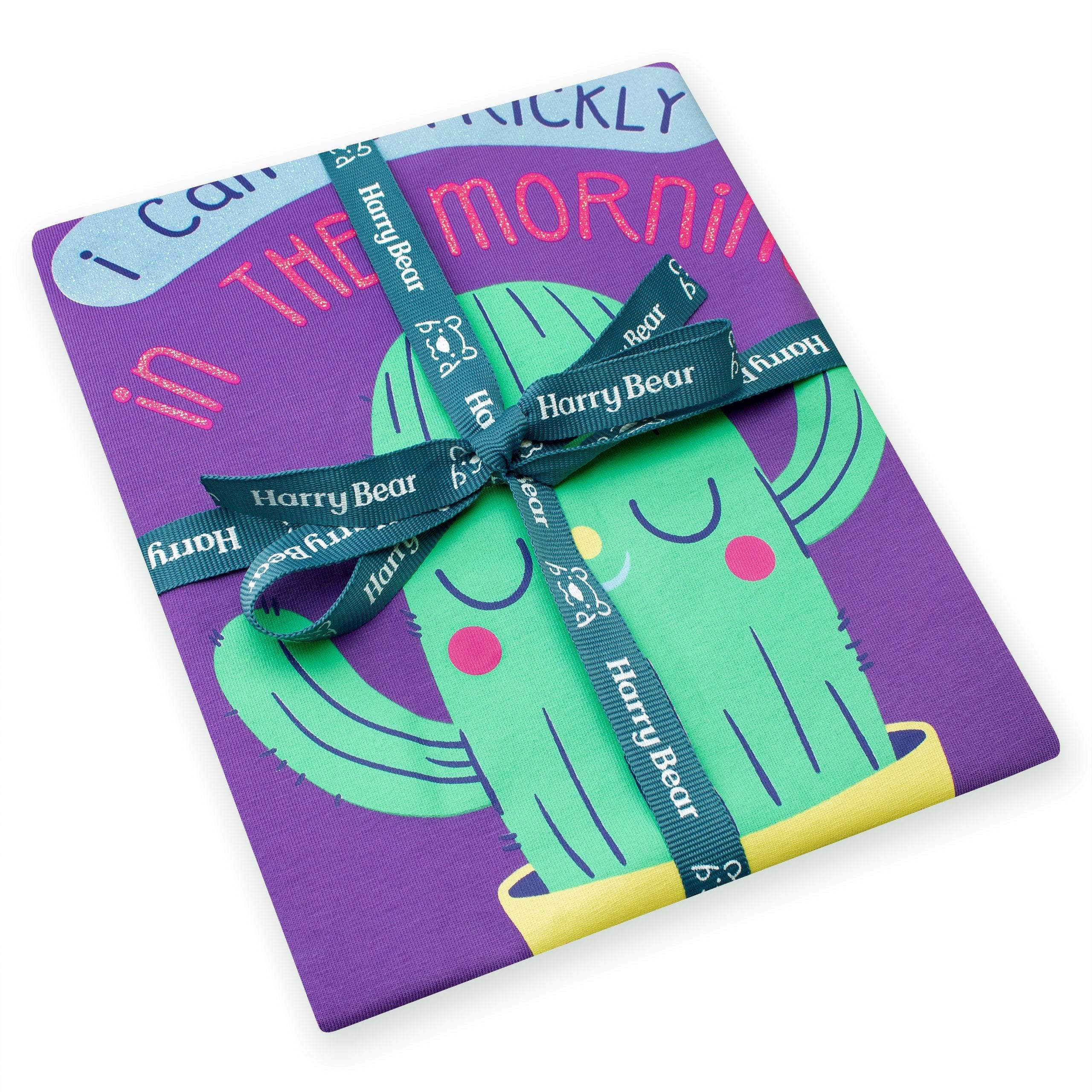 Turn your next siesta into a fiesta with these fun cactus PJs! A colourful pyjama set that features a purple short sleeved t-shirt showcasing a large print of a cactus and the"I can be prickly in the morning" written in shimmery glitter. Complete with contrasting vibrant pink pyjama bottoms that feature a motif of maracas, sunglasses and more cacti!