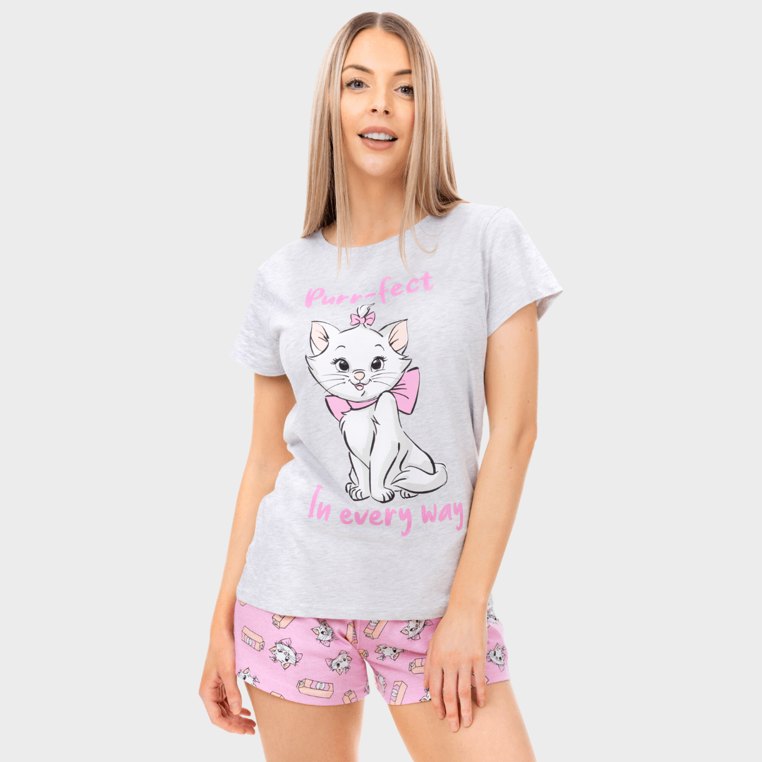 Achieve purr-fection at bedtime in these meow-velous Aristocats PJs! This pretty pink and grey pyjama set features a large print of beloved kitten Marie on the top with the slogan 'Purfect In Every Way'. Complete with matching shorts that have a fun motif of Artistocats Marie, with milk cartons and pink dots too! Crafted in super soft cotton blend made for any Cat Nap Queen!