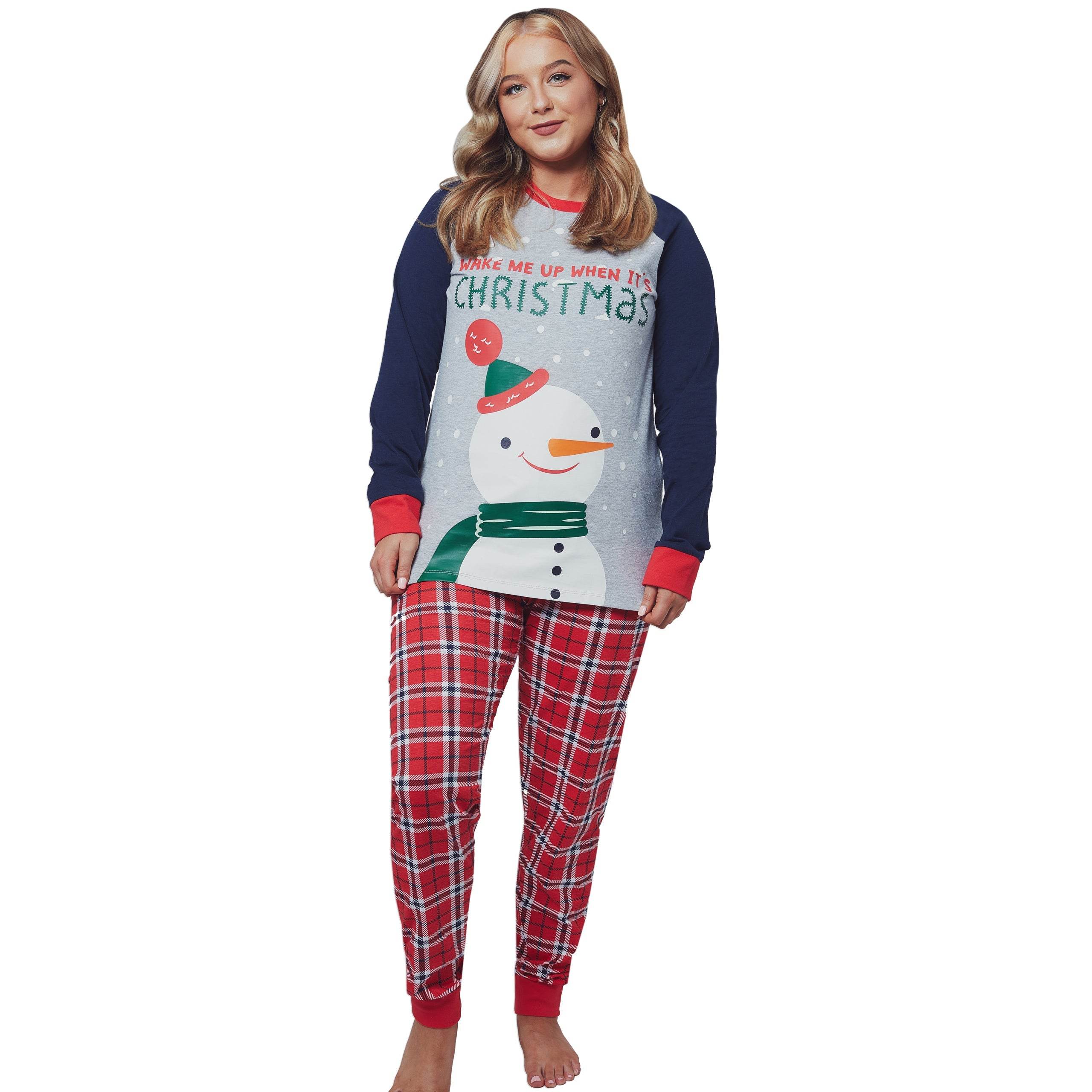 Cosy up for Christmas in these snuggly snowman jammies! These long sleeve pyjamas include a grey top with contrasting navy sleeves and red cuffs, showcasing a snowman against a snowy background with the slogan 'Wake Me Up When It's Christmas'. The matching pj bottoms have a red plaid print, an elasticated waistband and ankle cuffs for extra comfort. The perfect PJs for getting into the festive spirit!